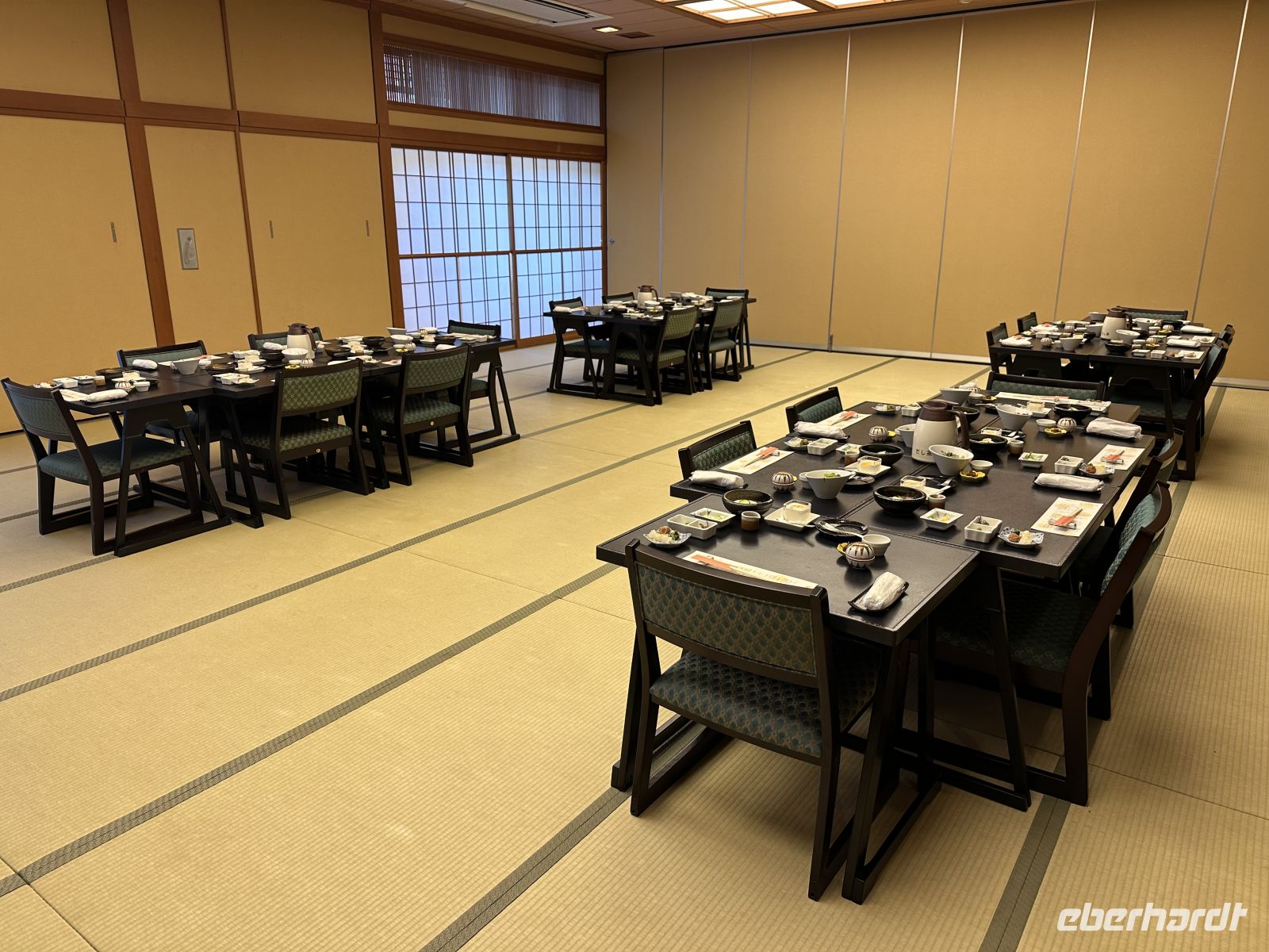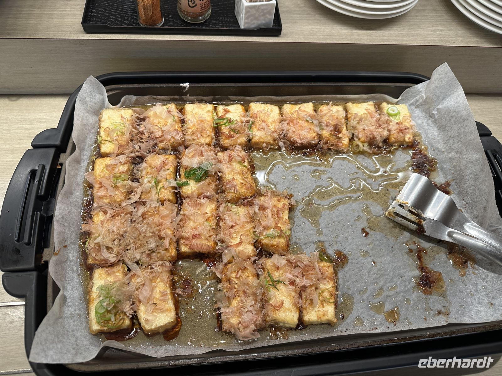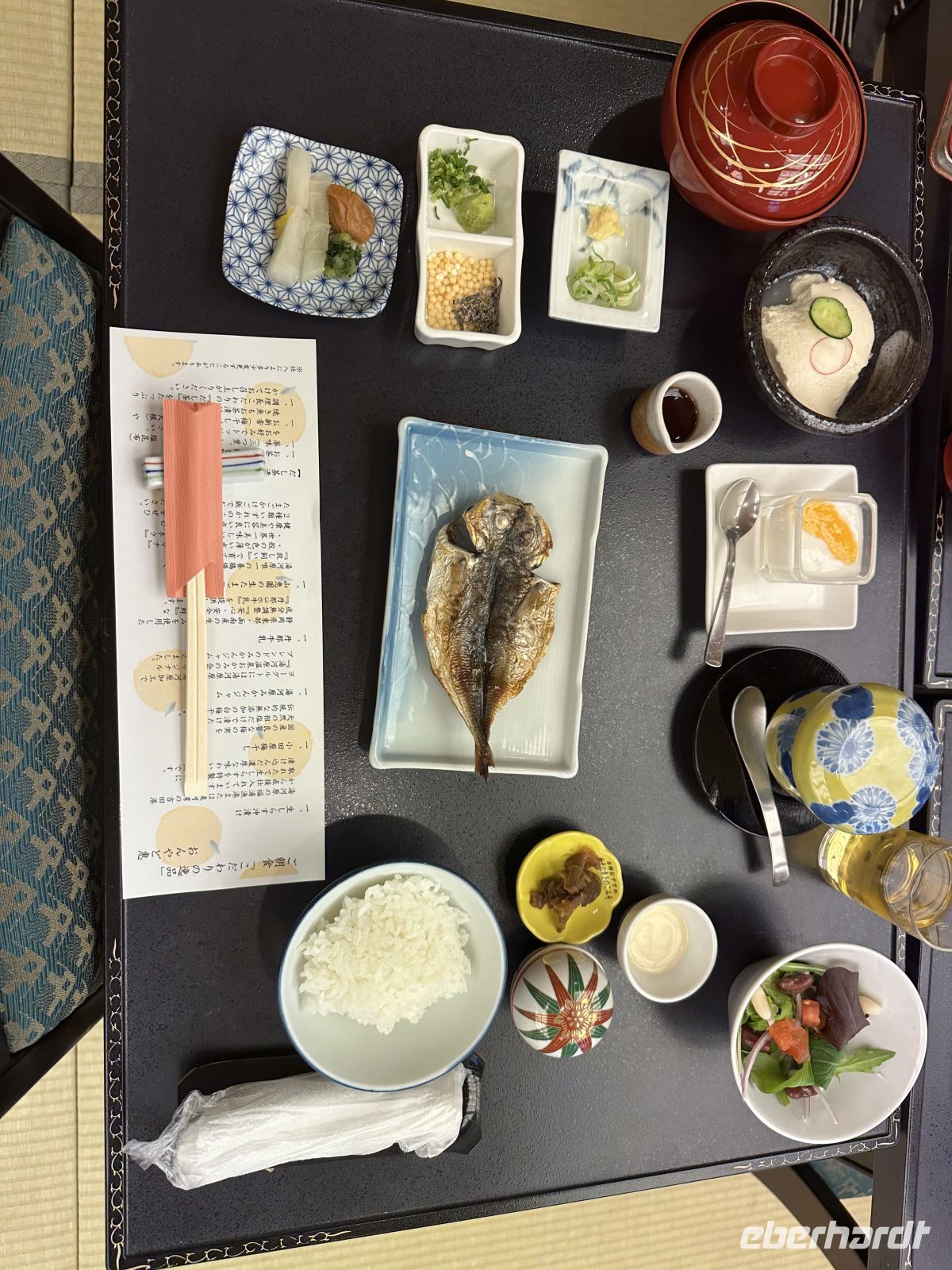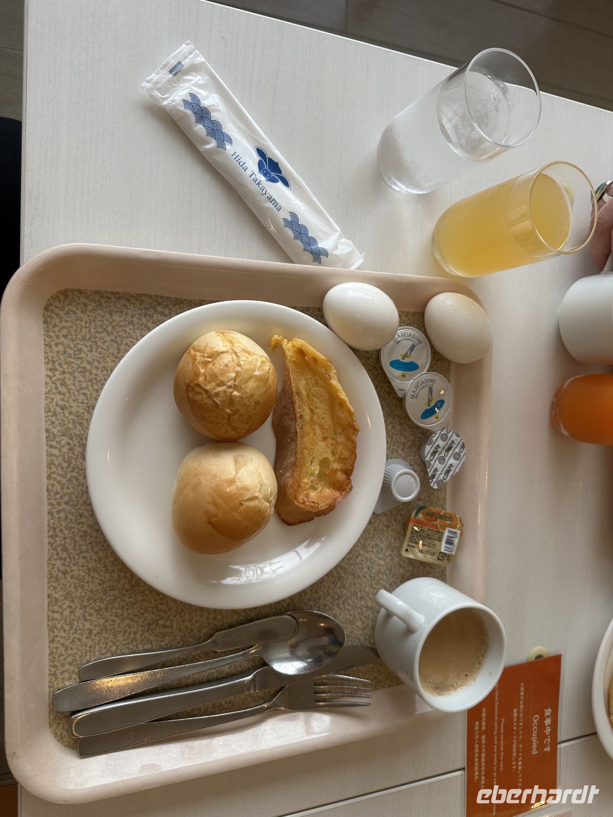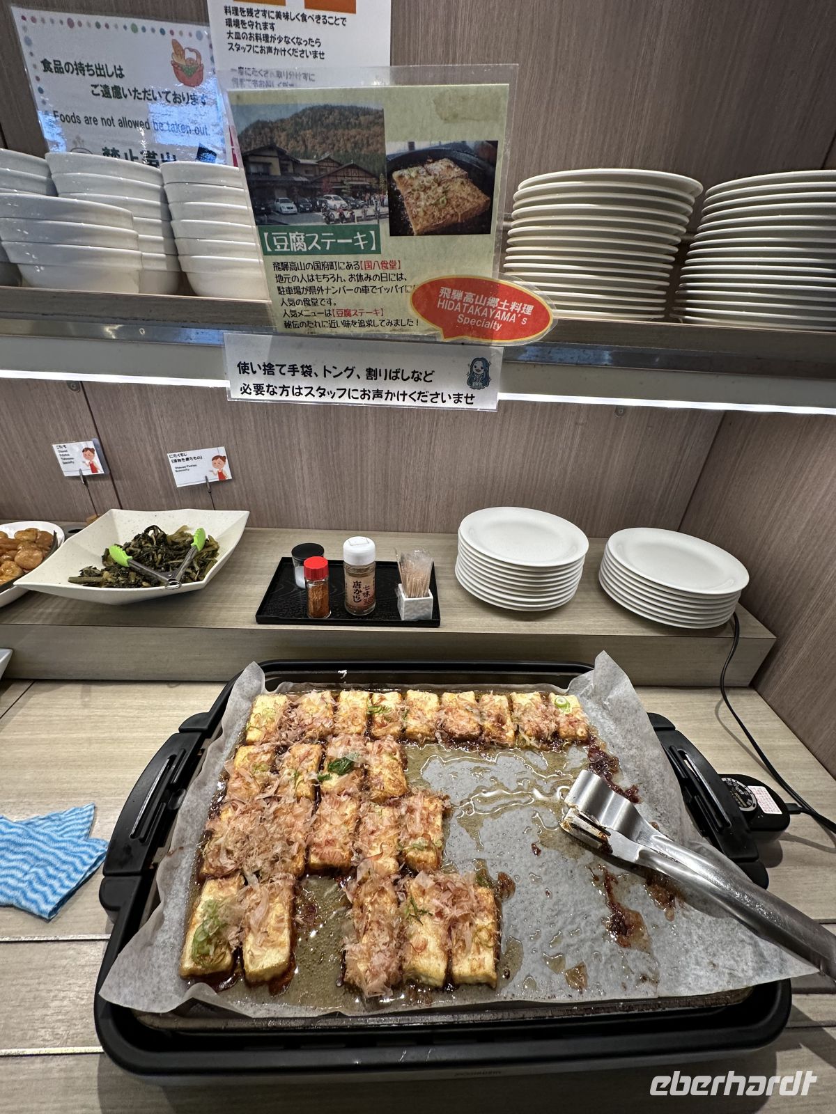 Unser letzter Morgen in Takayama beginnt kulinarisch noch einmal mit einem echten Highlight der Region. Beim Frühstück erwartet uns eine Spezialität, die typisch für die Hida-Berge ist: Tofu-Steak. Der Tofu wird auf einer heißen Platte goldbraun gebraten und mit einer würzigen Sauce sowie tanzenden Bonito-Flocken serviert. Es ist die perfekte, proteinreiche Stärkung für unseren heutigen Reisetag. Neben diesem warmen Gericht genießen wir die gewohnt vielfältige Auswahl des japanischen Frühstücksbuffets. Nach dem herzhaften Frühstück organisieren wir zuerst den Gepäckversand. Wir geben unsere Koffer im Hotel ab, damit sie direkt zu unserem nächsten Ziel transportiert werden, und reisen nur mit leichtem Handgepäck weiter. Das gibt uns die nötige Freiheit für unseren heutigen Zwischenstopp.