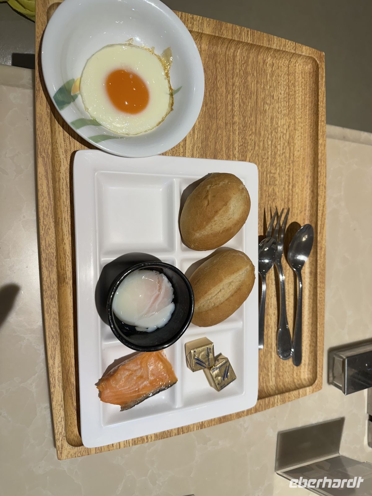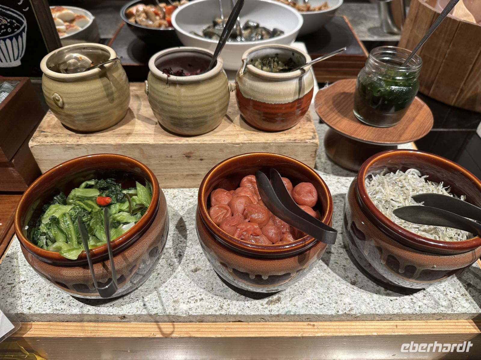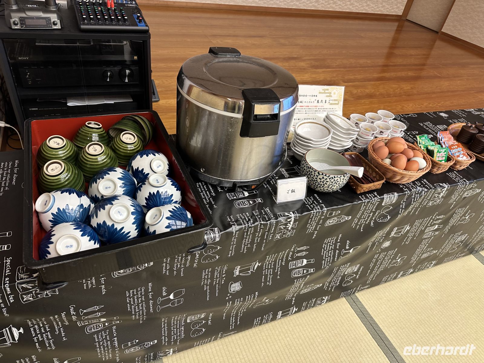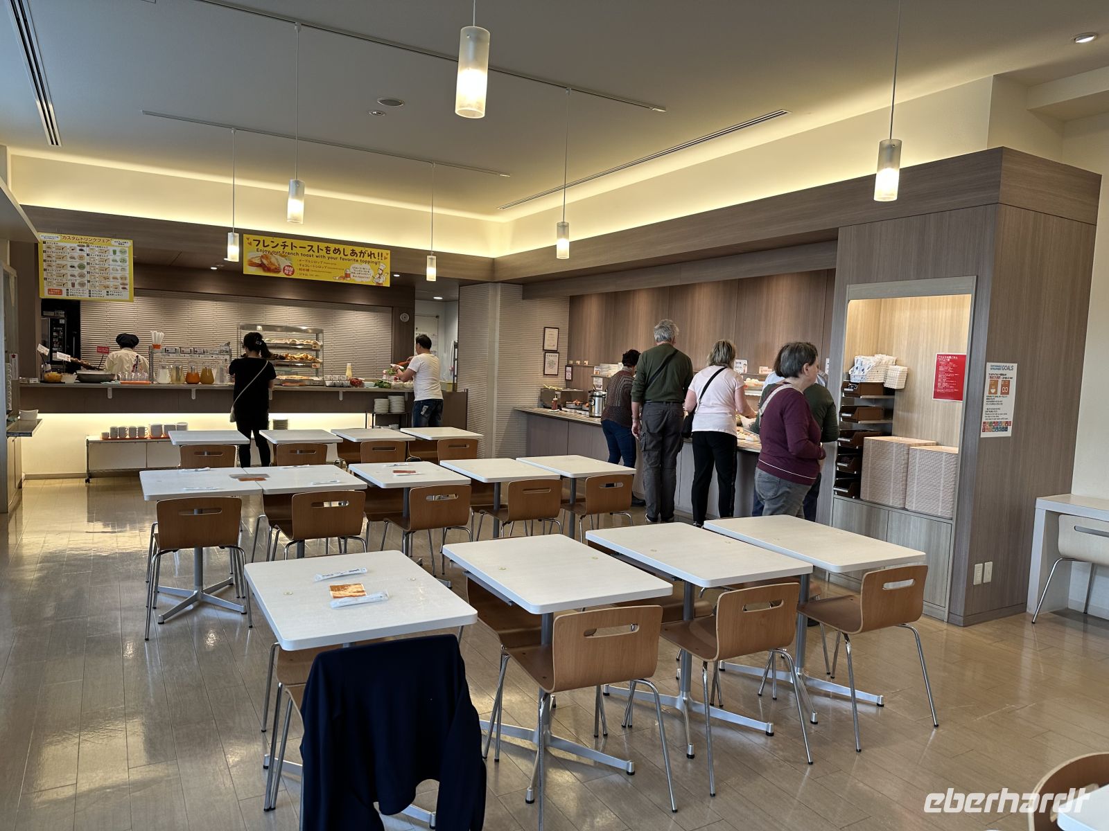 Unser letzter Morgen in Takayama beginnt kulinarisch noch einmal mit einem echten Highlight der Region. Beim Frühstück erwartet uns eine Spezialität, die typisch für die Hida-Berge ist: Tofu-Steak. Der Tofu wird auf einer heißen Platte goldbraun gebraten und mit einer würzigen Sauce sowie tanzenden Bonito-Flocken serviert. Es ist die perfekte, proteinreiche Stärkung für unseren heutigen Reisetag. Neben diesem warmen Gericht genießen wir die gewohnt vielfältige Auswahl des japanischen Frühstücksbuffets. Nach dem herzhaften Frühstück organisieren wir zuerst den Gepäckversand. Wir geben unsere Koffer im Hotel ab, damit sie direkt zu unserem nächsten Ziel transportiert werden, und reisen nur mit leichtem Handgepäck weiter. Das gibt uns die nötige Freiheit für unseren heutigen Zwischenstopp.