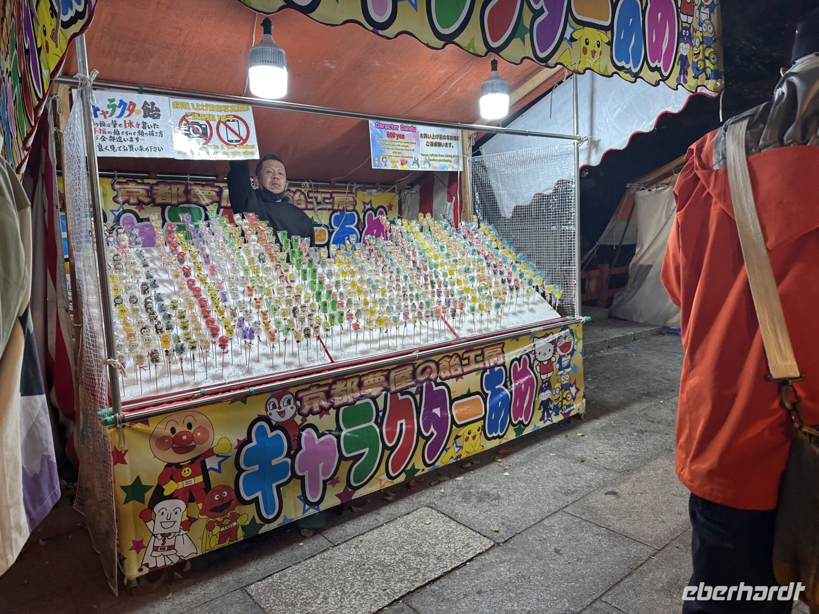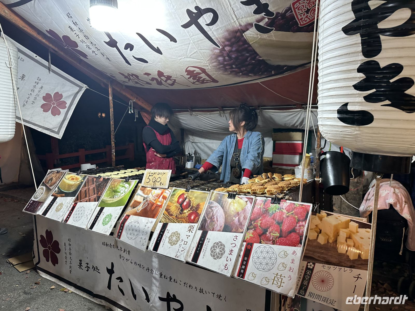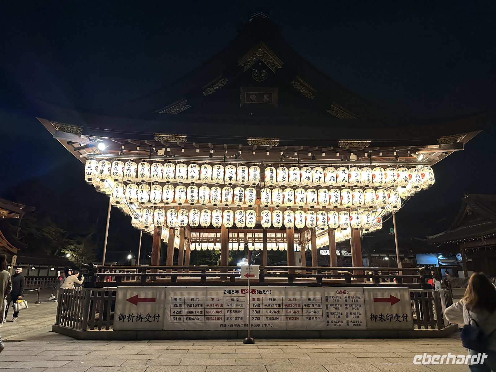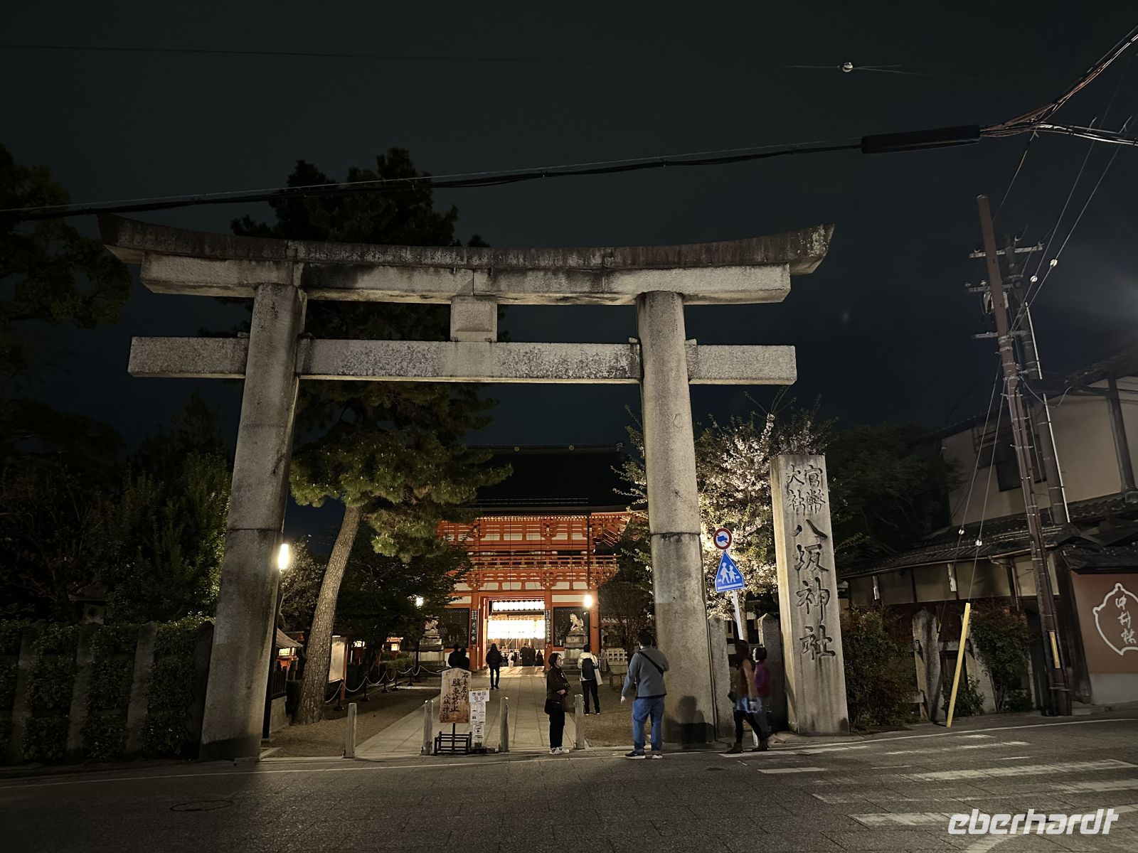 Nach einer kurzen Pause brechen wir zu einem Abendspaziergang auf. Unser Ziel ist der Yasaka-Schrein, der im Herzen von Gion liegt. Schon beim Betreten des Geländes empfängt uns eine wunderbare, fast volksfestartige Stimmung. Direkt hinter dem Eingangsbereich, mitten auf dem Tempelgelände, sind zahlreiche Imbiss-Stände aufgebaut. Es duftet nach gegrillten Spezialitäten, und wir lassen uns von der lebhaften Atmosphäre mitreißen, während wir zwischen den Ständen umherschlendern.