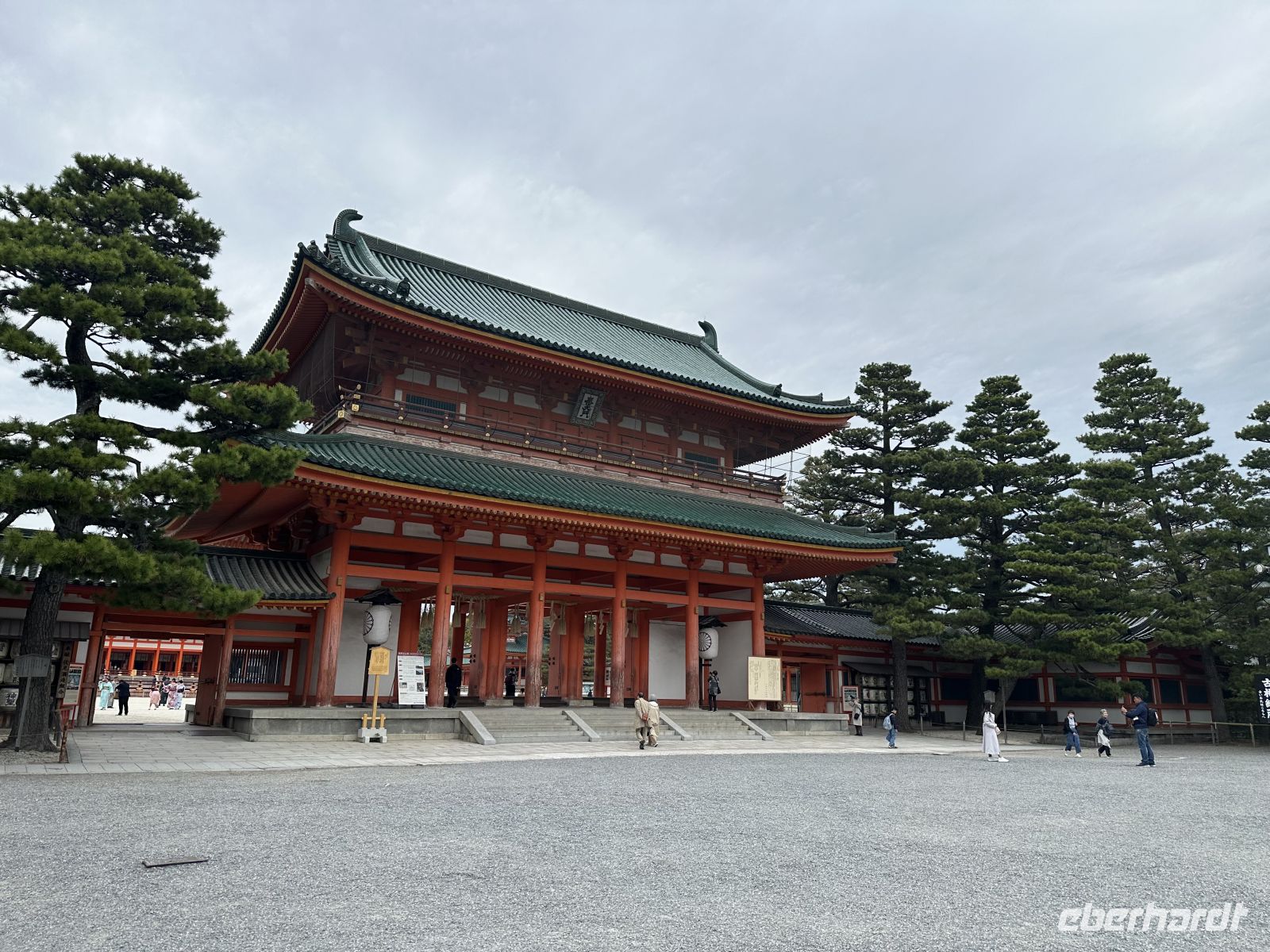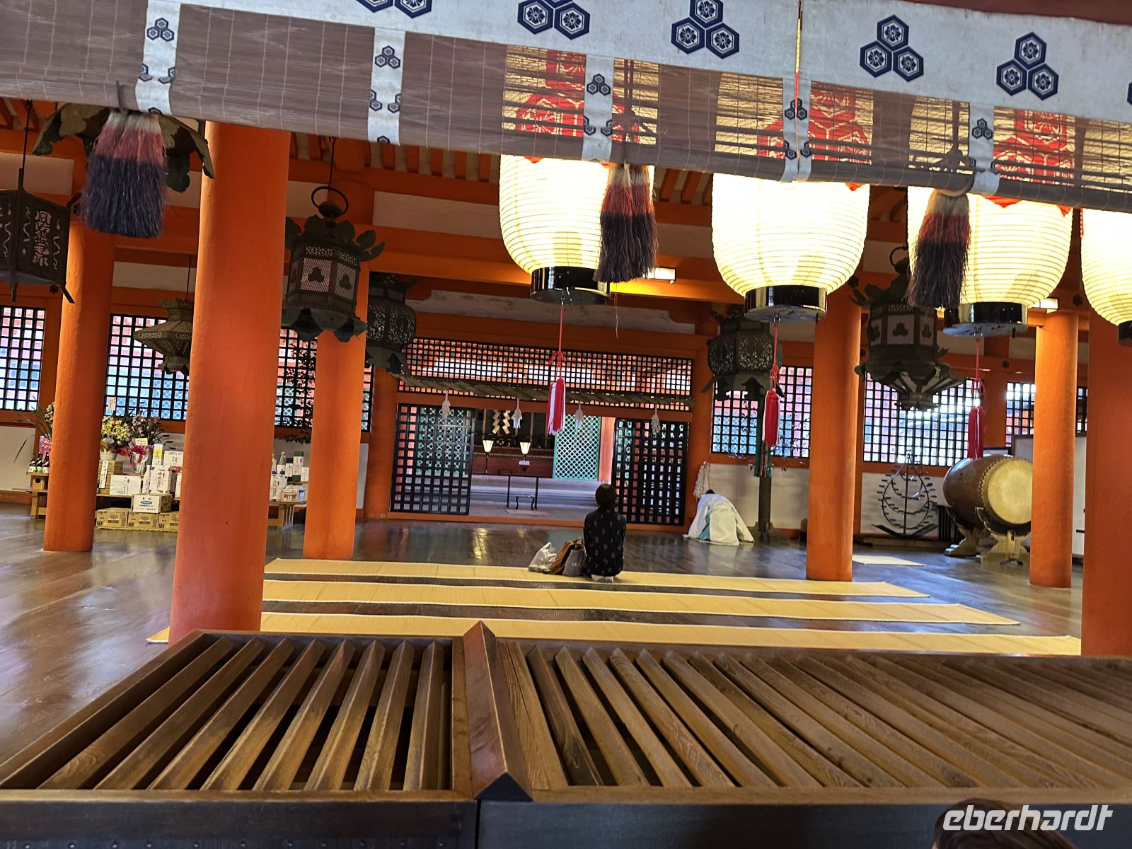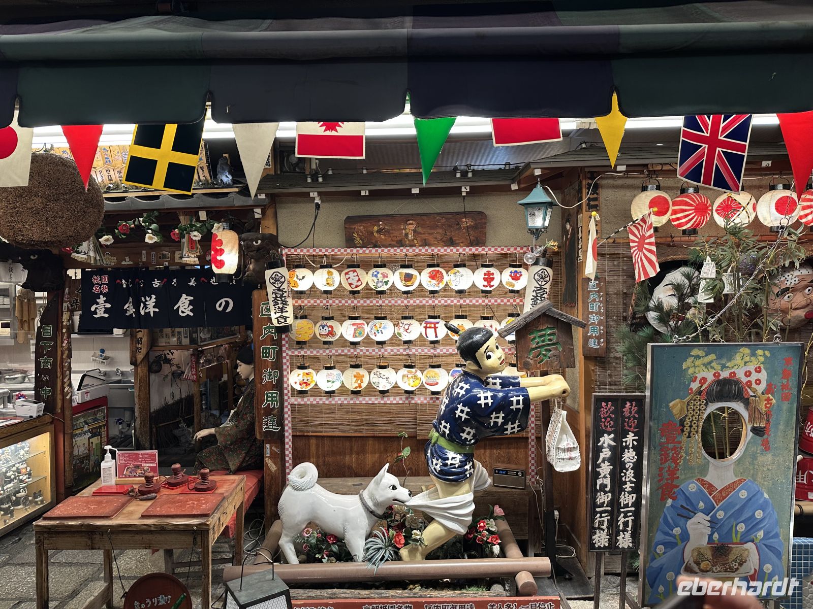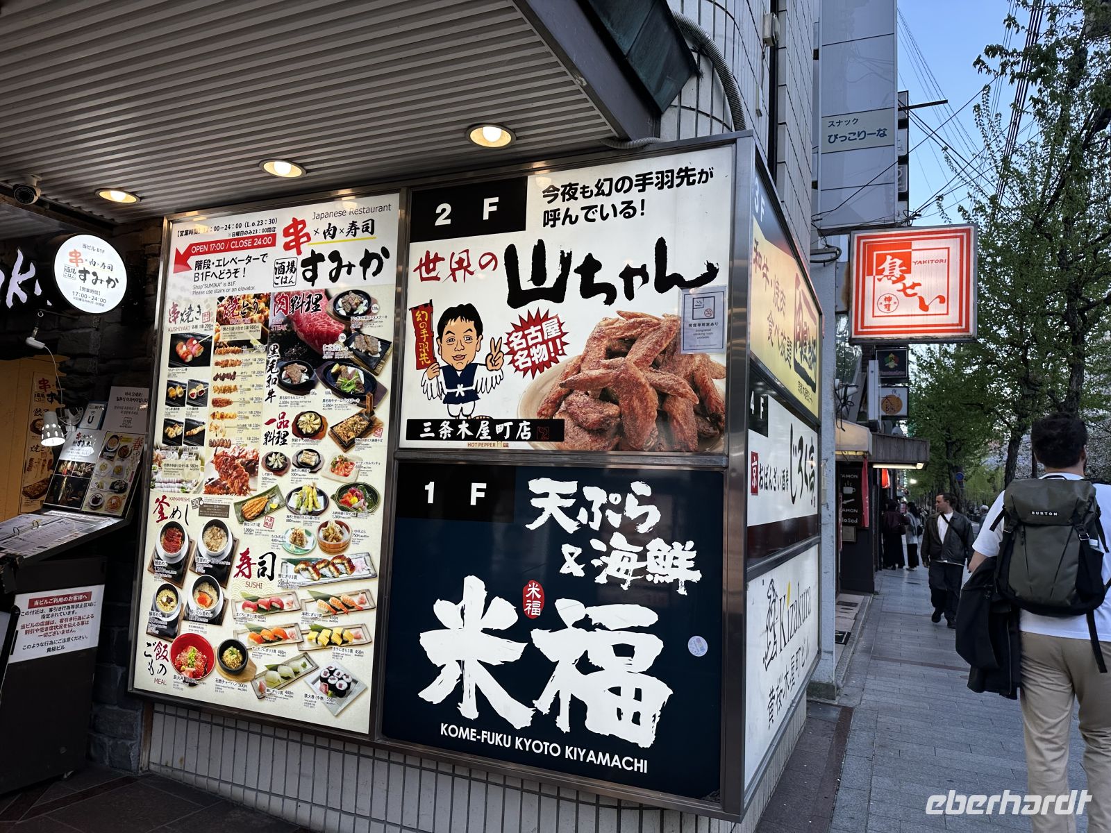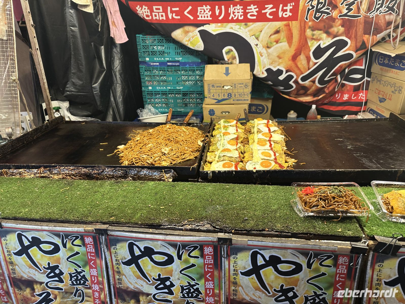 Nach einer kurzen Pause brechen wir zu einem Abendspaziergang auf. Unser Ziel ist der Yasaka-Schrein, der im Herzen von Gion liegt. Schon beim Betreten des Geländes empfängt uns eine wunderbare, fast volksfestartige Stimmung. Direkt hinter dem Eingangsbereich, mitten auf dem Tempelgelände, sind zahlreiche Imbiss-Stände aufgebaut. Es duftet nach gegrillten Spezialitäten, und wir lassen uns von der lebhaften Atmosphäre mitreißen, während wir zwischen den Ständen umherschlendern.