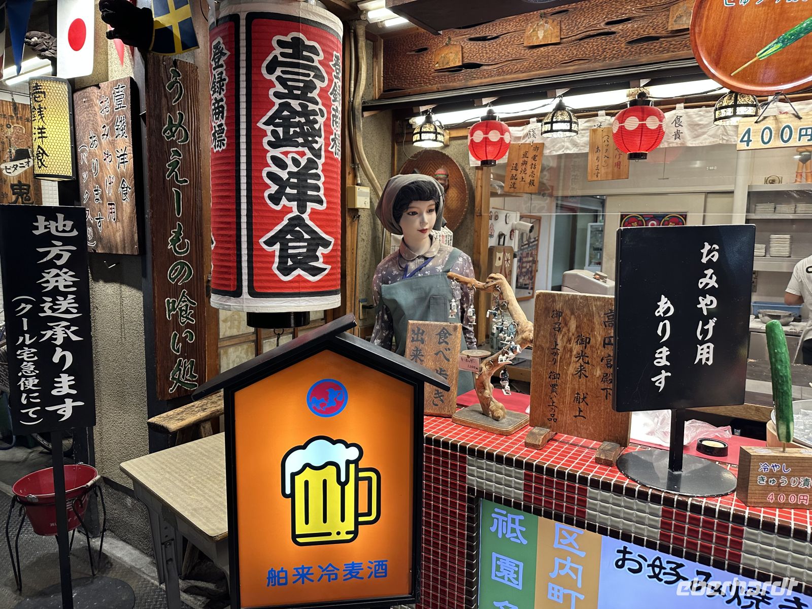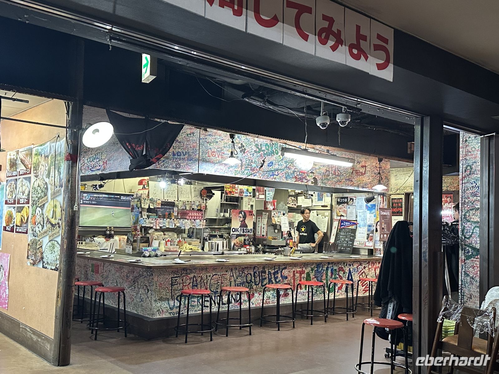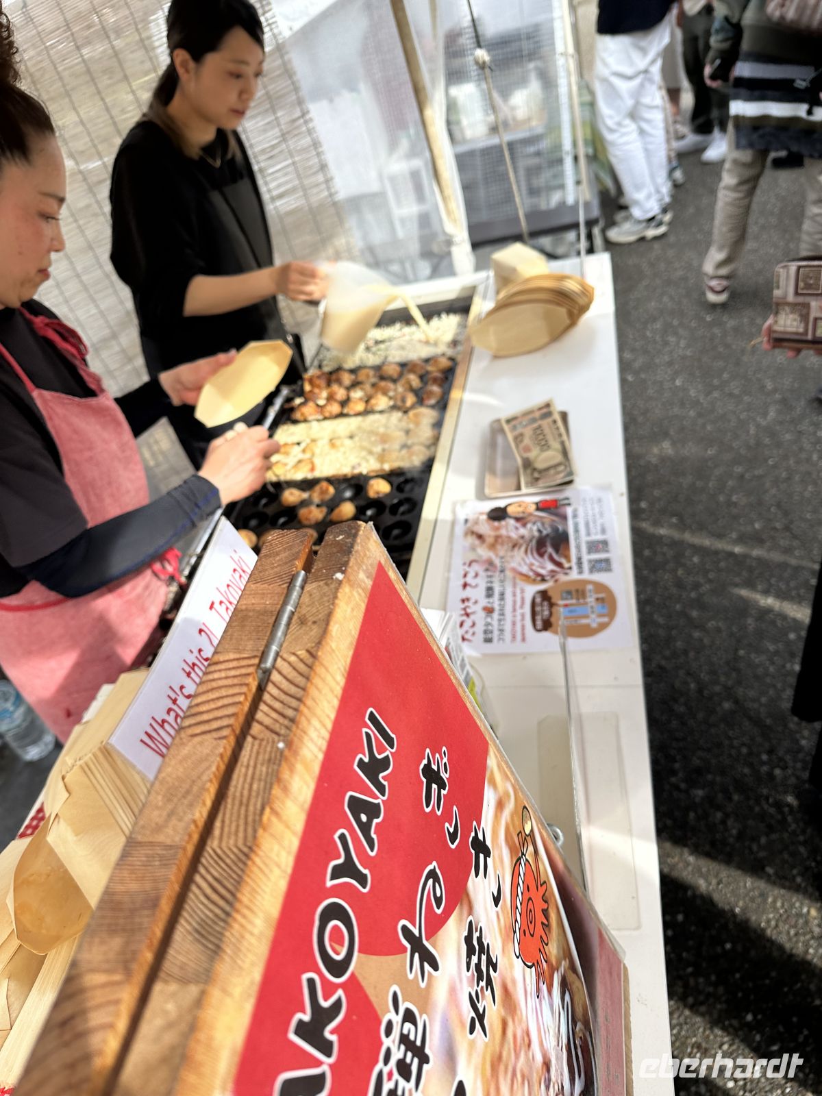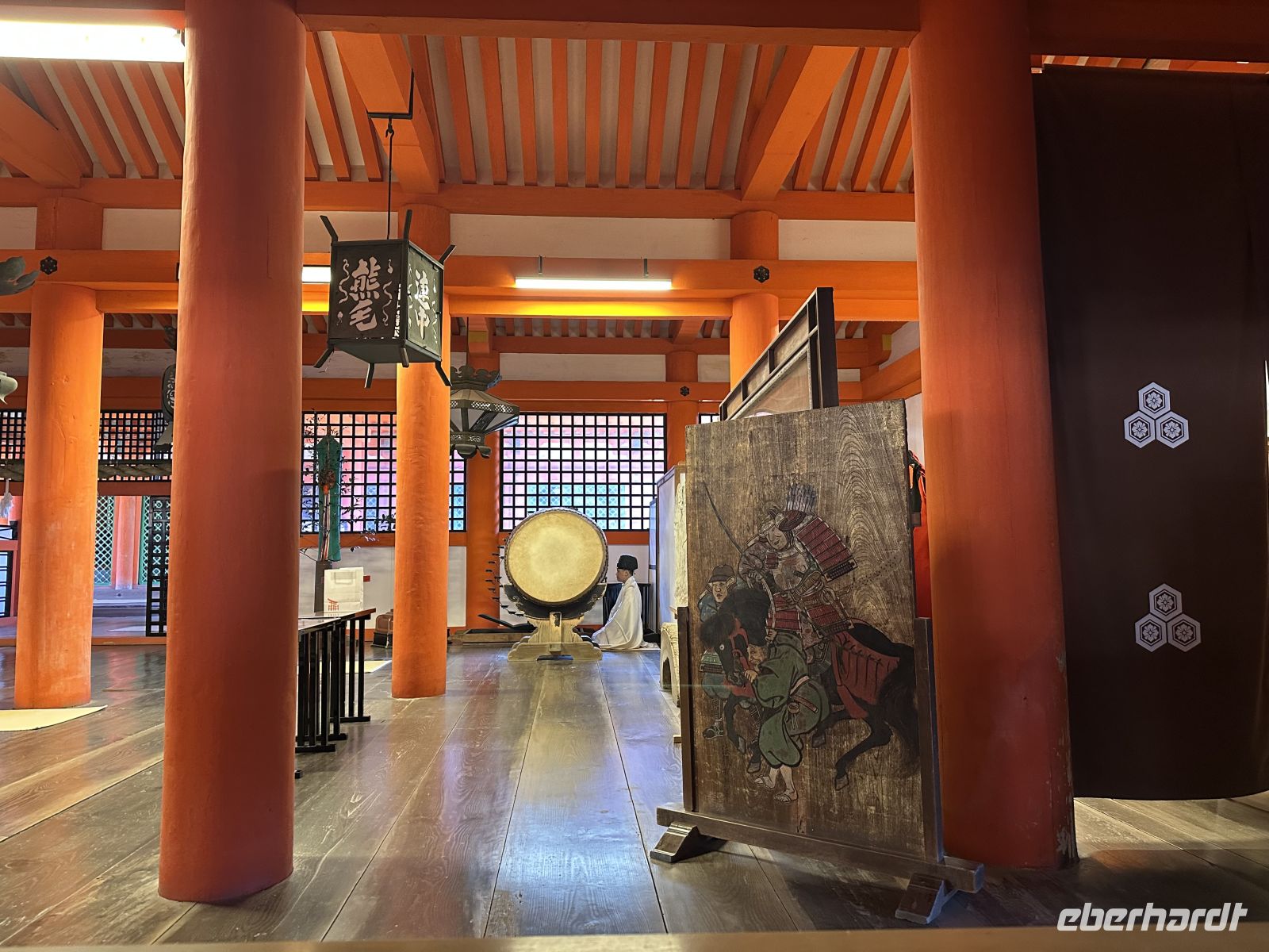 Nach einer kurzen Pause brechen wir zu einem Abendspaziergang auf. Unser Ziel ist der Yasaka-Schrein, der im Herzen von Gion liegt. Schon beim Betreten des Geländes empfängt uns eine wunderbare, fast volksfestartige Stimmung. Direkt hinter dem Eingangsbereich, mitten auf dem Tempelgelände, sind zahlreiche Imbiss-Stände aufgebaut. Es duftet nach gegrillten Spezialitäten, und wir lassen uns von der lebhaften Atmosphäre mitreißen, während wir zwischen den Ständen umherschlendern.