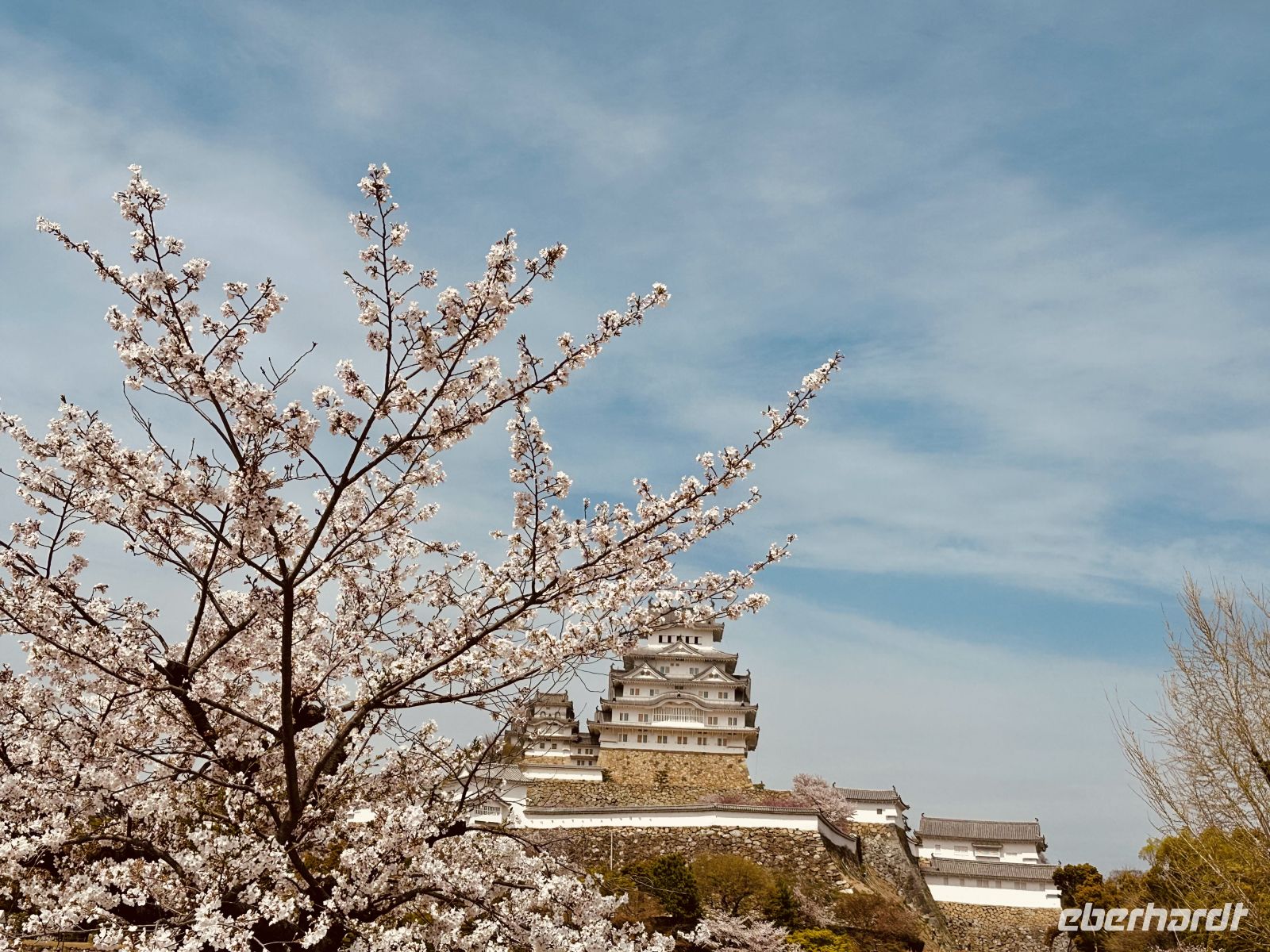 Mit dem Shinkansen geht es in rasanter Fahrt Richtung Süden nach Himeji. Dort erwartet uns die Burg Himeji, die aufgrund ihrer strahlend weißen Fassade und der eleganten Form auch Burg des weißen Reihers genannt wird. Es ist ein magischer Anblick, wie sich die weiße Festung vor dem blauen Himmel abhebt, während die Kirschblüten auf dem Gelände in voller Pracht stehen. Wir nehmen uns Zeit, die Anlage zu erkunden und die filigrane Holzarchitektur zu bewundern, die seit Jahrhunderten nahezu unverändert geblieben ist.