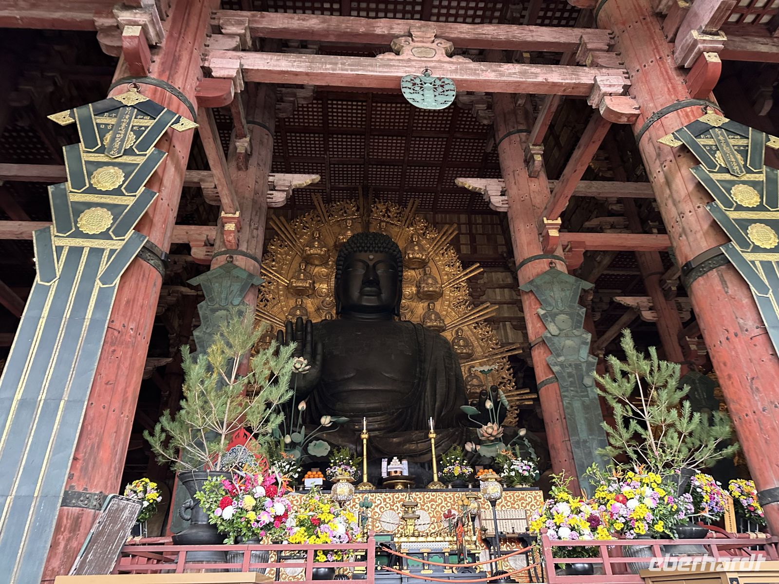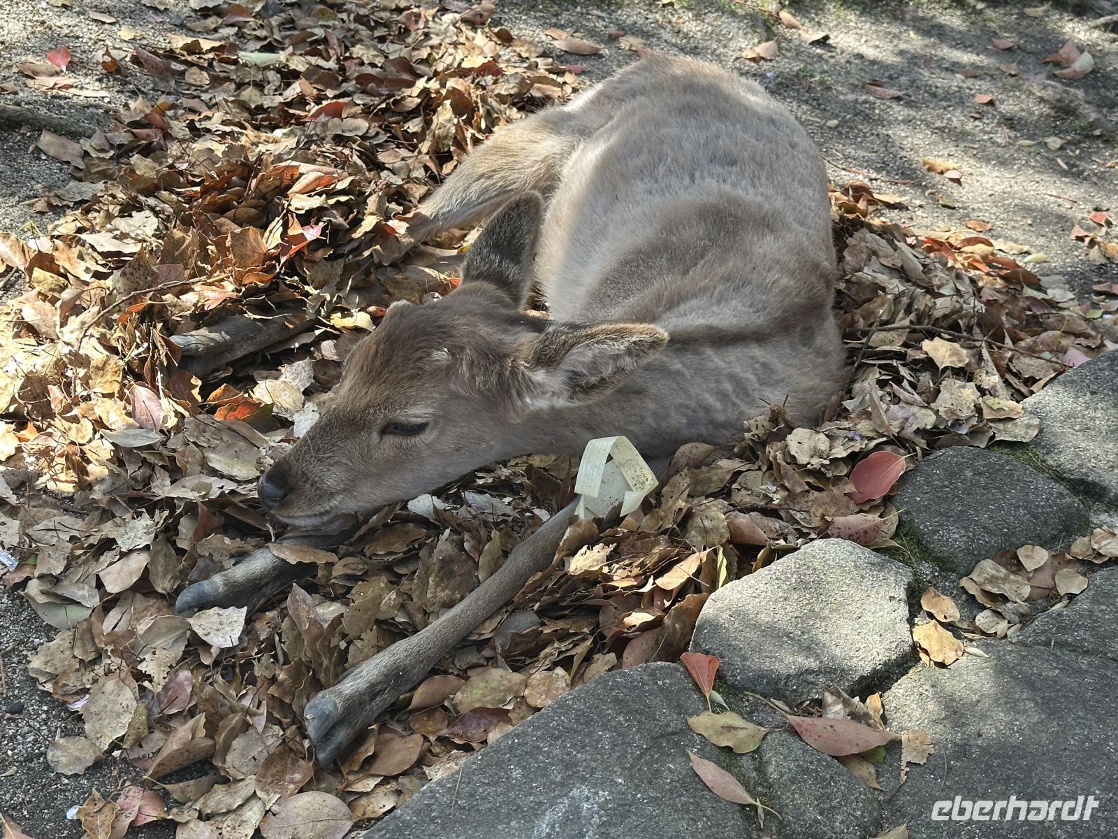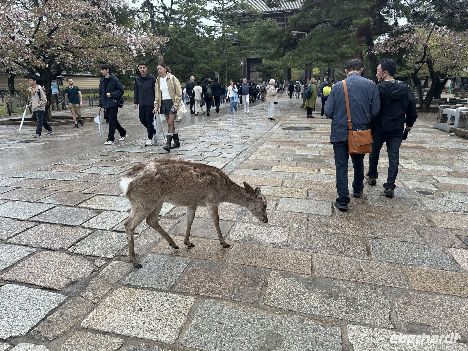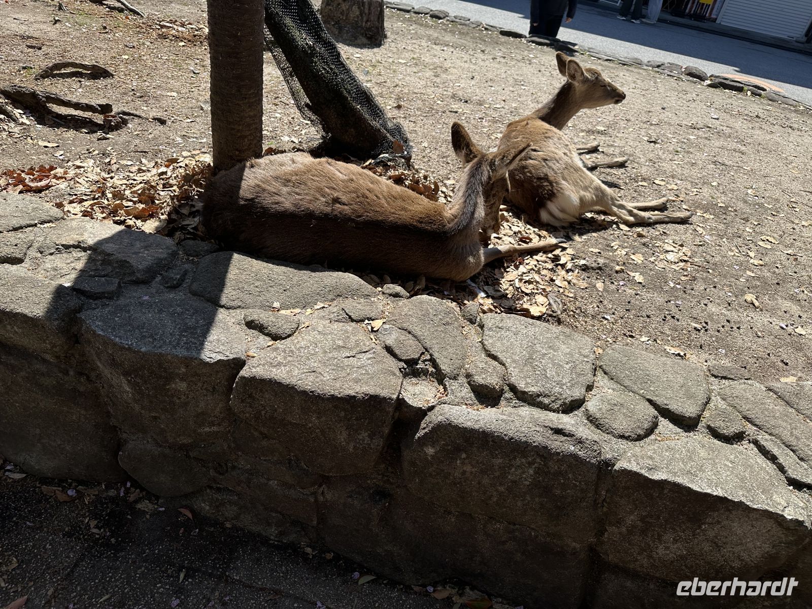 Wir lassen das Gewusel hinter uns und fahren weiter nach Nara. Im berühmten Nara-Park werden wir sofort von den tierischen Bewohnern begrüßt. Die Hirsche hier sind alles andere als scheu und knabbern neugierig an allem herum, was sie finden können – Taschen, Karten und Jacken sind vor ihren sanften, aber hartnäckigen Mäulern nicht sicher.