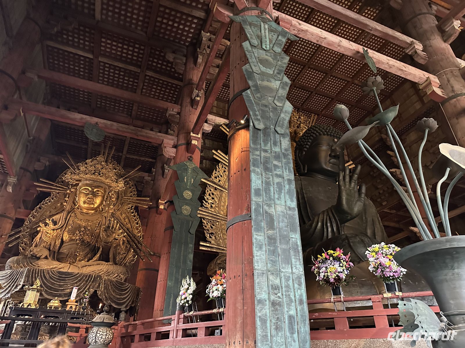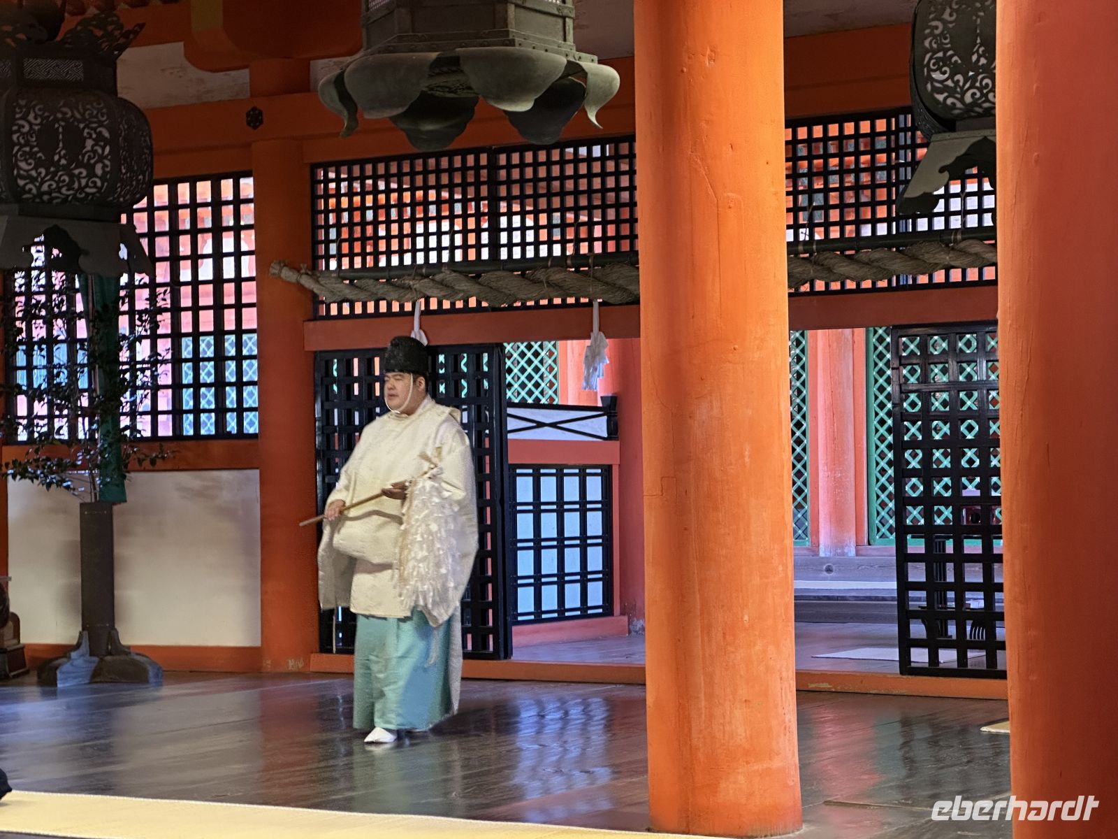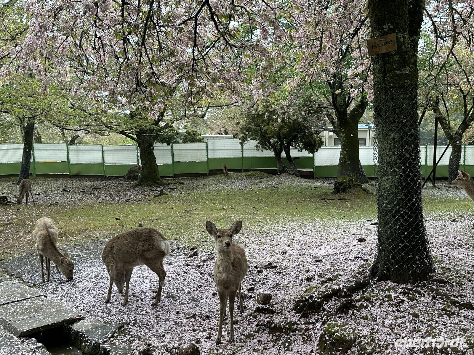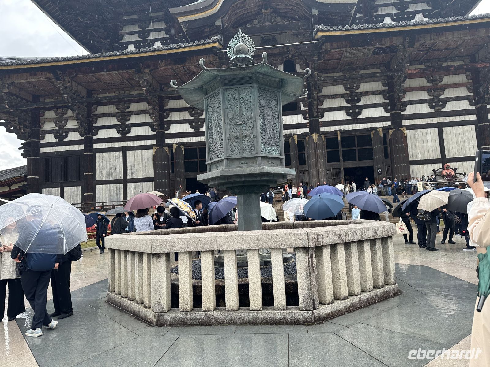 Wir lassen das Gewusel hinter uns und fahren weiter nach Nara. Im berühmten Nara-Park werden wir sofort von den tierischen Bewohnern begrüßt. Die Hirsche hier sind alles andere als scheu und knabbern neugierig an allem herum, was sie finden können – Taschen, Karten und Jacken sind vor ihren sanften, aber hartnäckigen Mäulern nicht sicher.