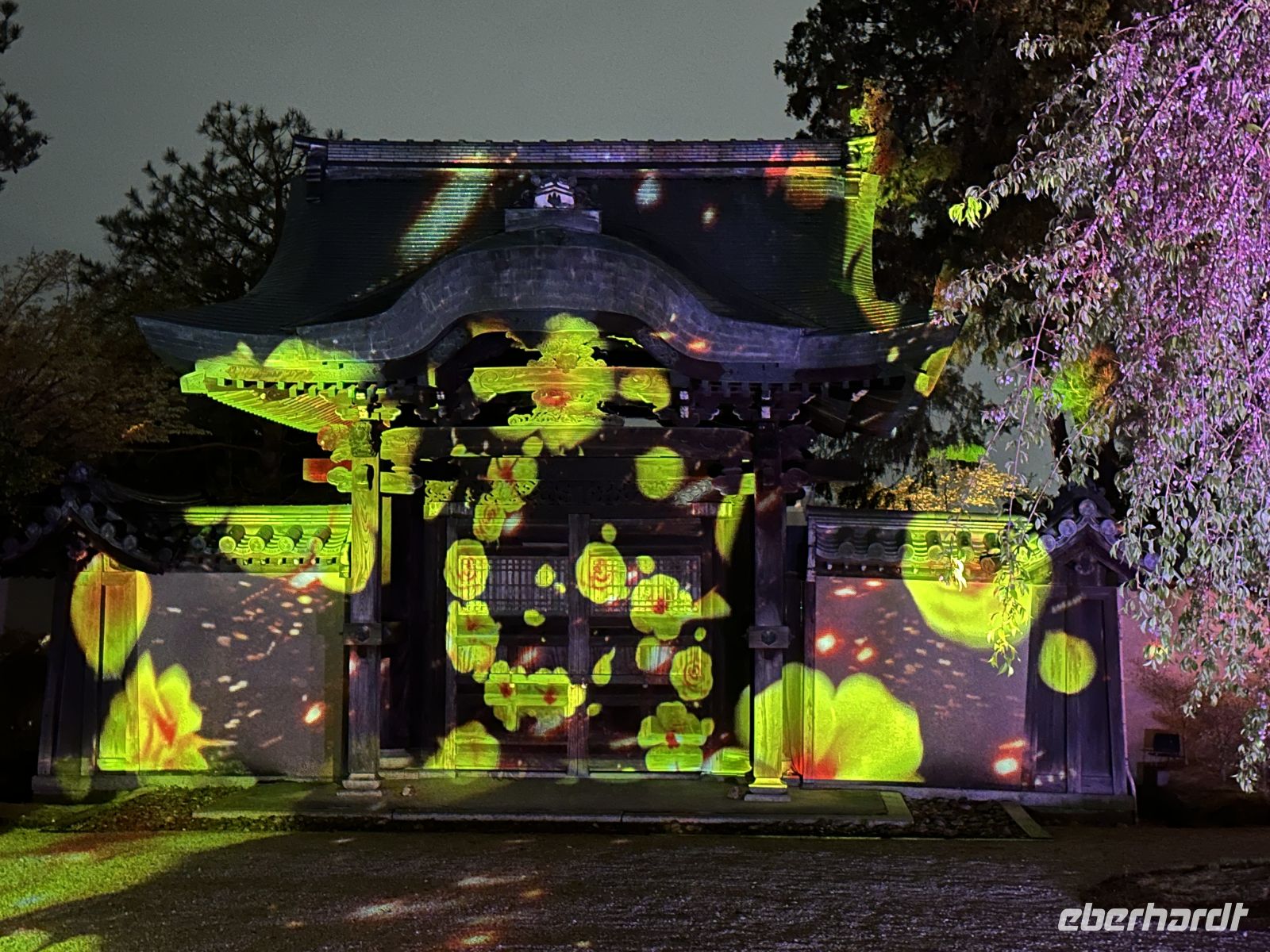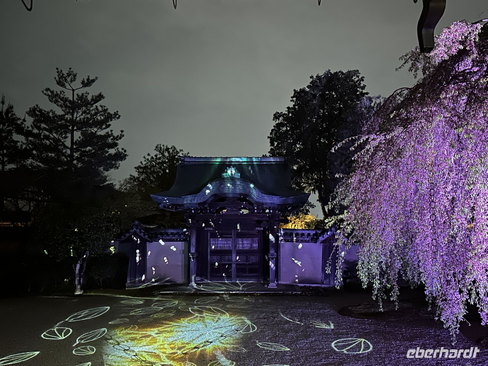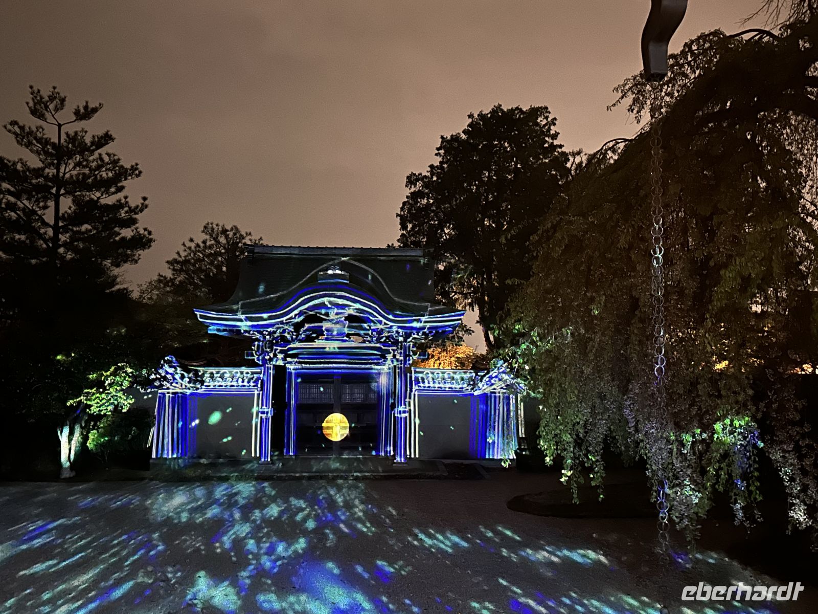 Doch was uns am Yasaka-Schrein selbst erwartet, übertrifft alle Erwartungen. Es ist ein monumentales Lichtkunst-Spektakel. Die Haupttore und die traditionellen Gebäude des Schreins dienen als Leinwand für ein faszinierendes Projection Mapping. Wir sind völlig gebannt, wie sich die Architektur durch die Projektionen ständig verwandelt. Einmal scheint das Holz in Flammen zu stehen, dann wieder tanzen abstrakte Muster in tiefem Blau und Grün über die Wände. Silhouetten von Besuchern, teilweise in traditionellen Kimonos, bewegen sich durch das Spiel aus Licht und Schatten. Es ist eine magische Verbindung von uralter Tradition und modernster Technik, die wir so schnell nicht vergessen werden.