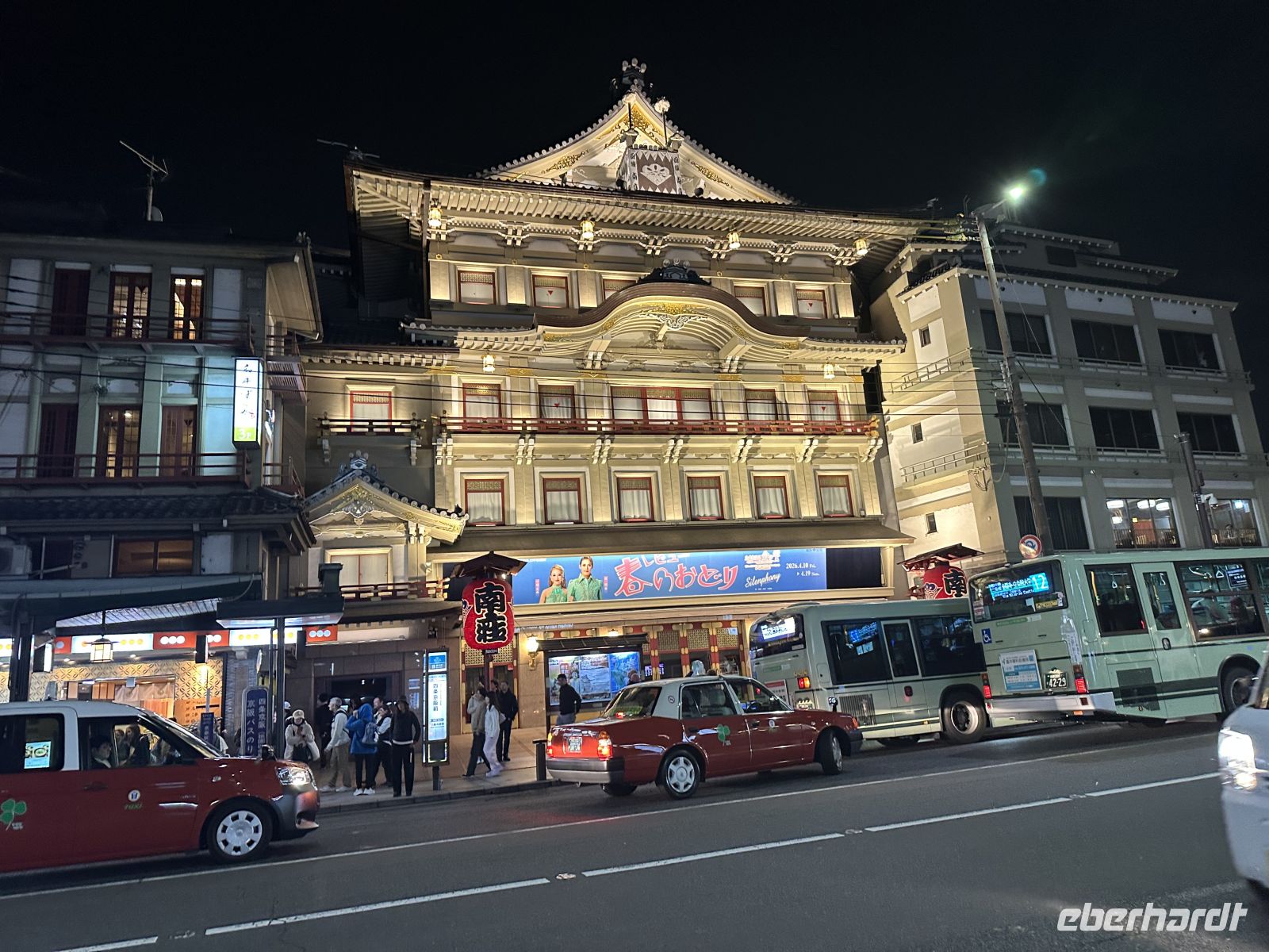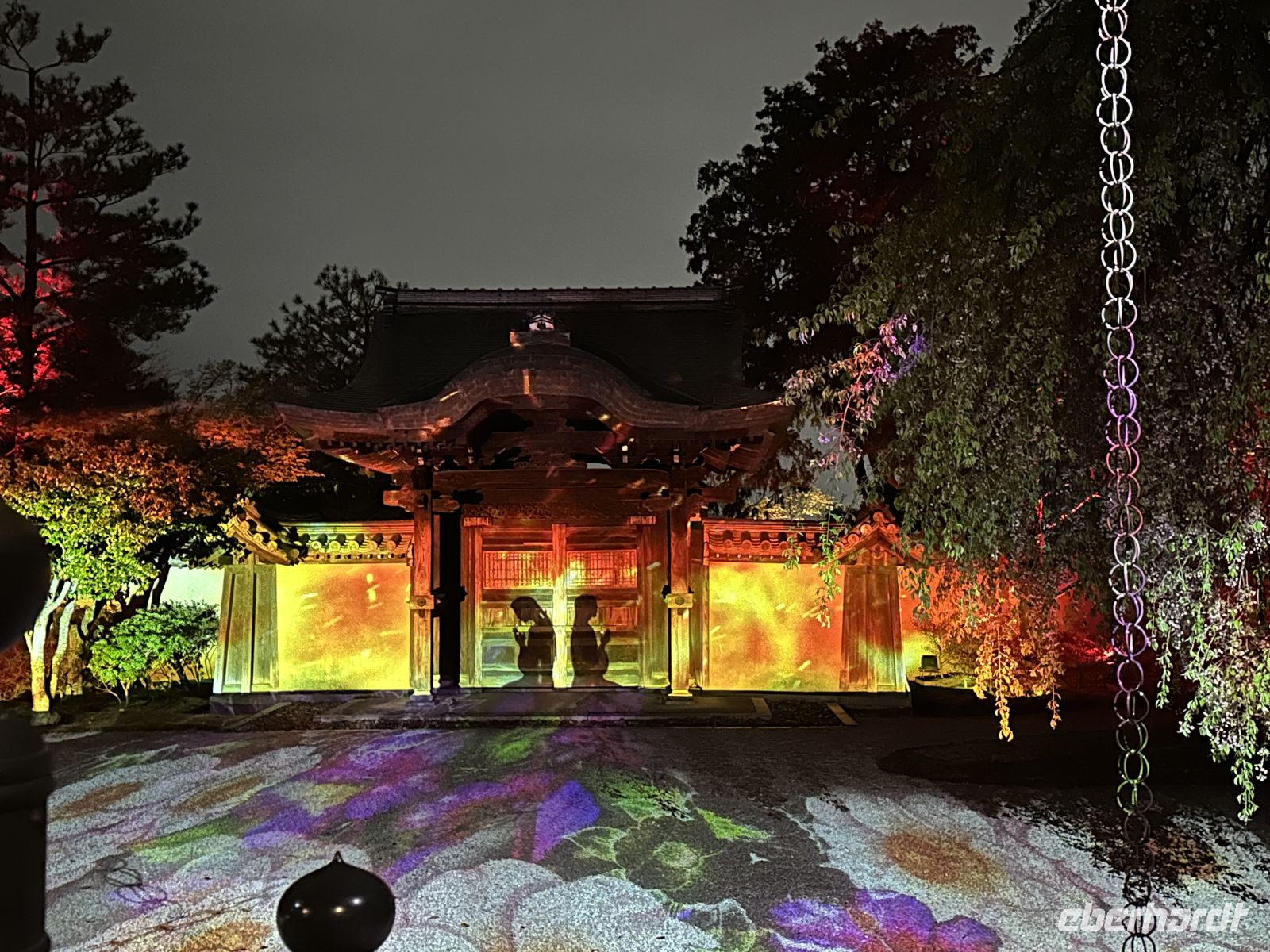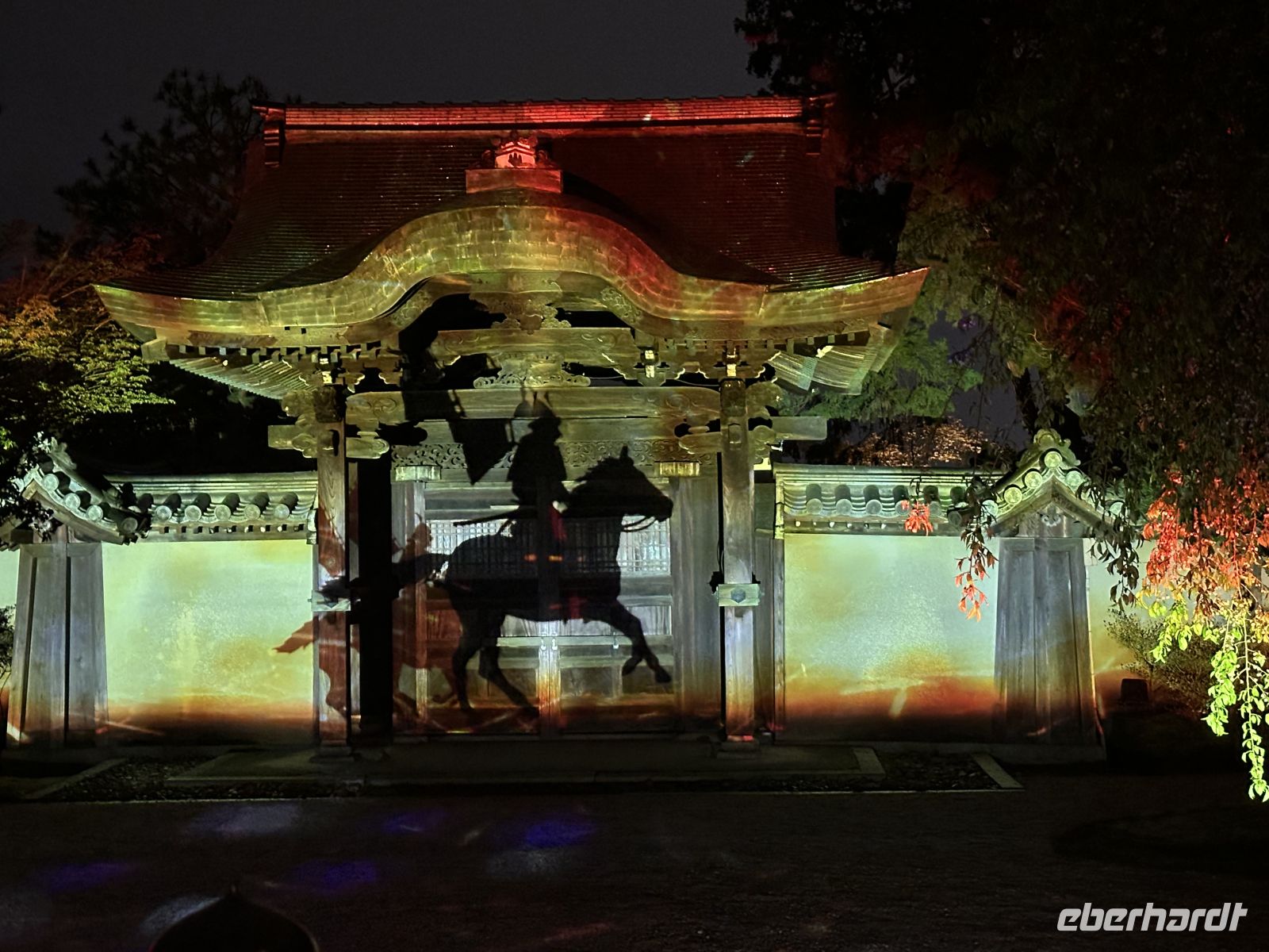 Doch was uns am Yasaka-Schrein selbst erwartet, übertrifft alle Erwartungen. Es ist ein monumentales Lichtkunst-Spektakel. Die Haupttore und die traditionellen Gebäude des Schreins dienen als Leinwand für ein faszinierendes Projection Mapping. Wir sind völlig gebannt, wie sich die Architektur durch die Projektionen ständig verwandelt. Einmal scheint das Holz in Flammen zu stehen, dann wieder tanzen abstrakte Muster in tiefem Blau und Grün über die Wände. Silhouetten von Besuchern, teilweise in traditionellen Kimonos, bewegen sich durch das Spiel aus Licht und Schatten. Es ist eine magische Verbindung von uralter Tradition und modernster Technik, die wir so schnell nicht vergessen werden.
