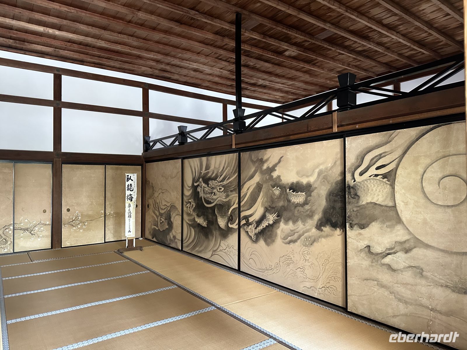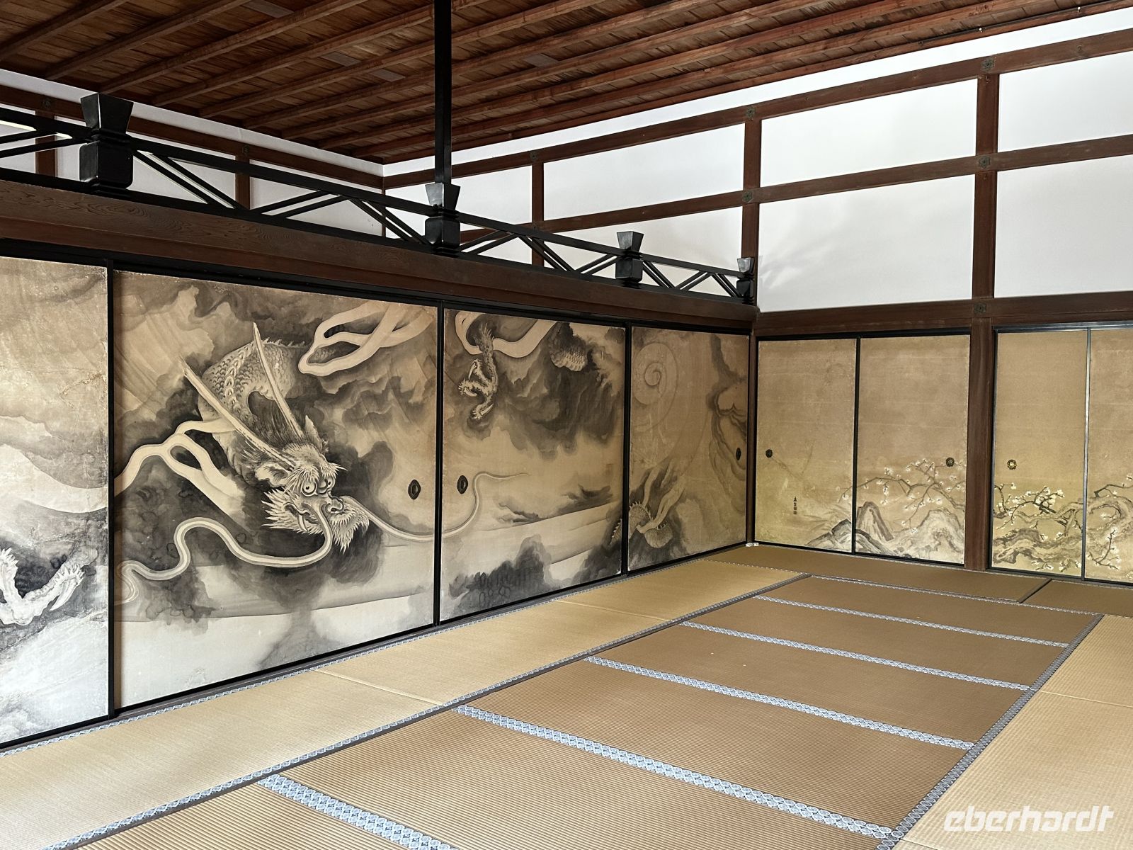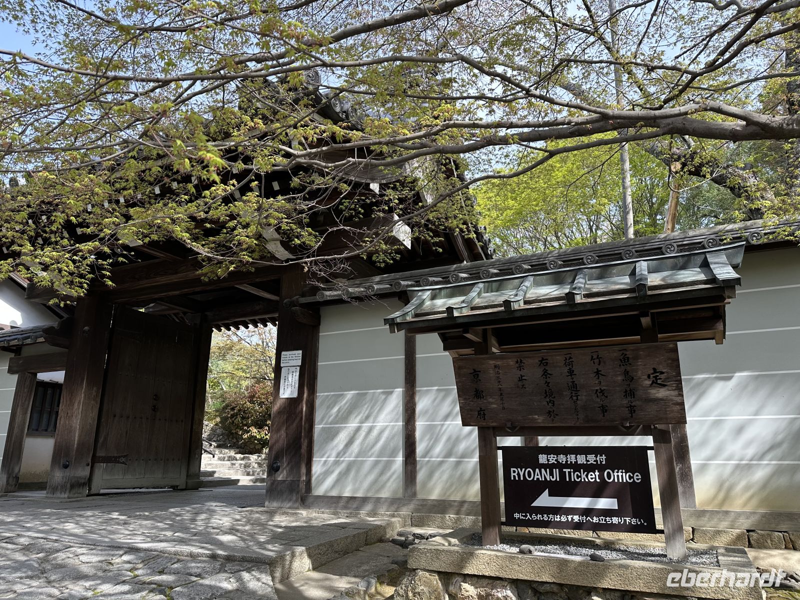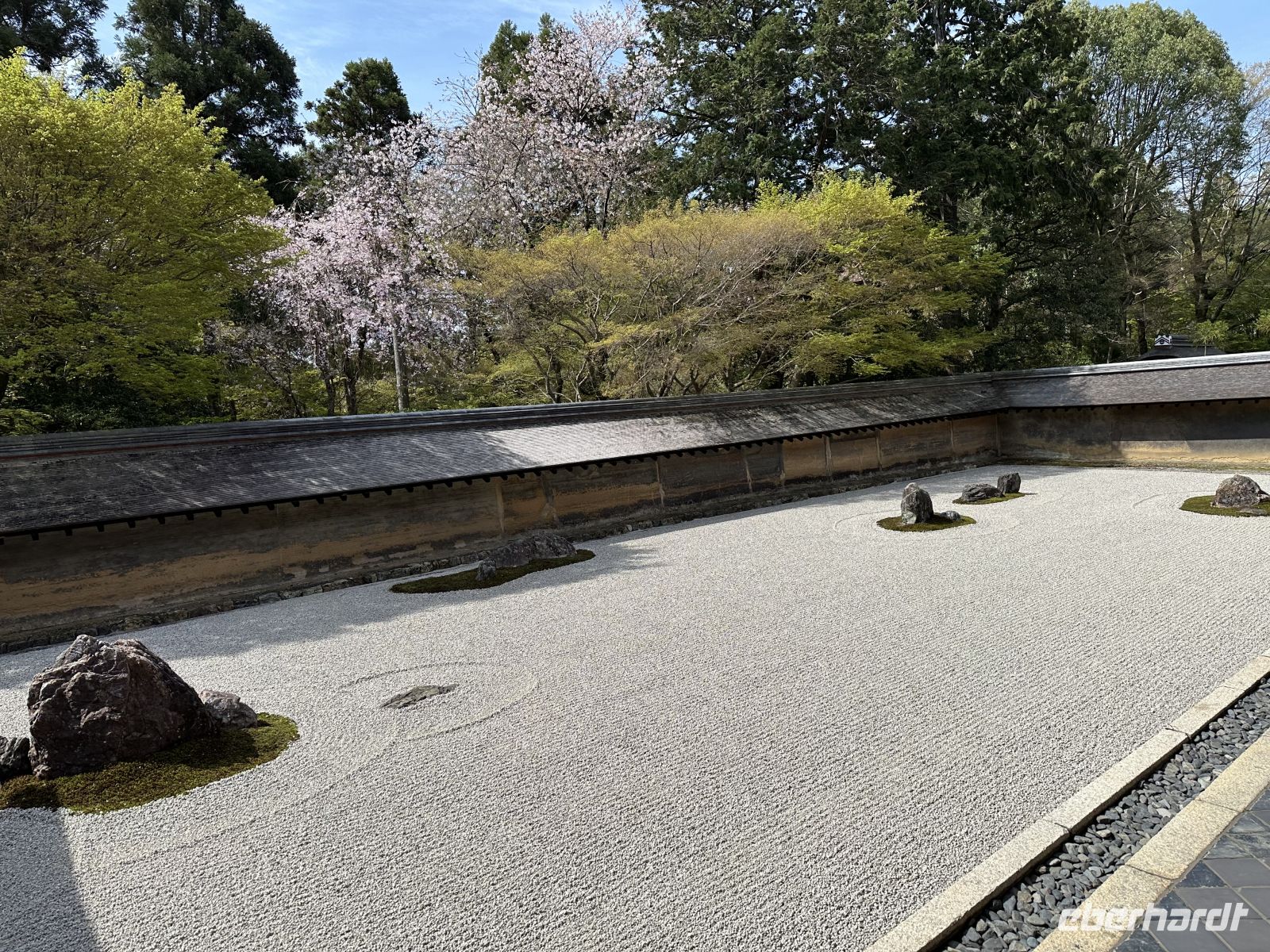 Unser Tag in Kyoto beginnt mit der vollkommenen Ruhe des Ryoanji-Tempels. Der berühmte Zen-Steingarten mit seinen 15 sorgsam platzierten Steinen inmitten von geharktem weißem Kies lädt uns zum Innehalten und Nachdenken ein. Es ist faszinierend zu versuchen, alle Steine gleichzeitig zu erblicken – was laut Legende nur demjenigen gelingt, der die Erleuchtung erlangt hat.