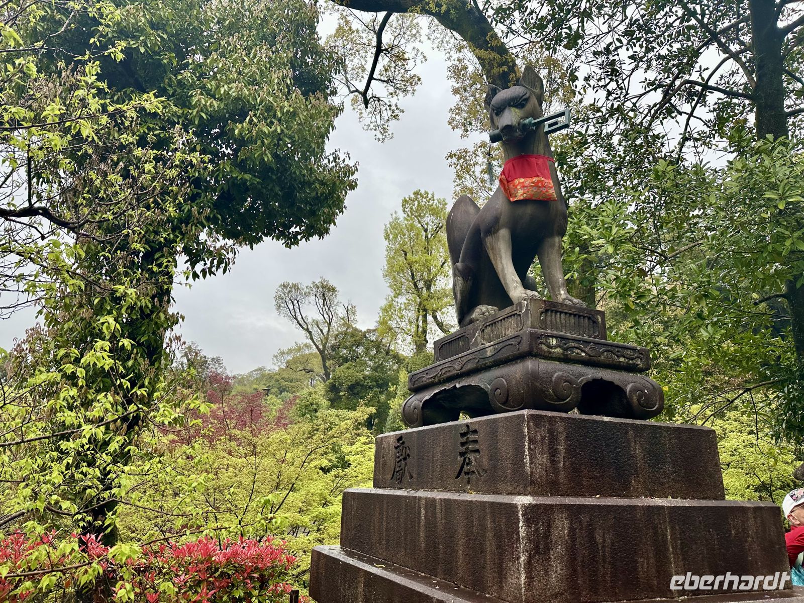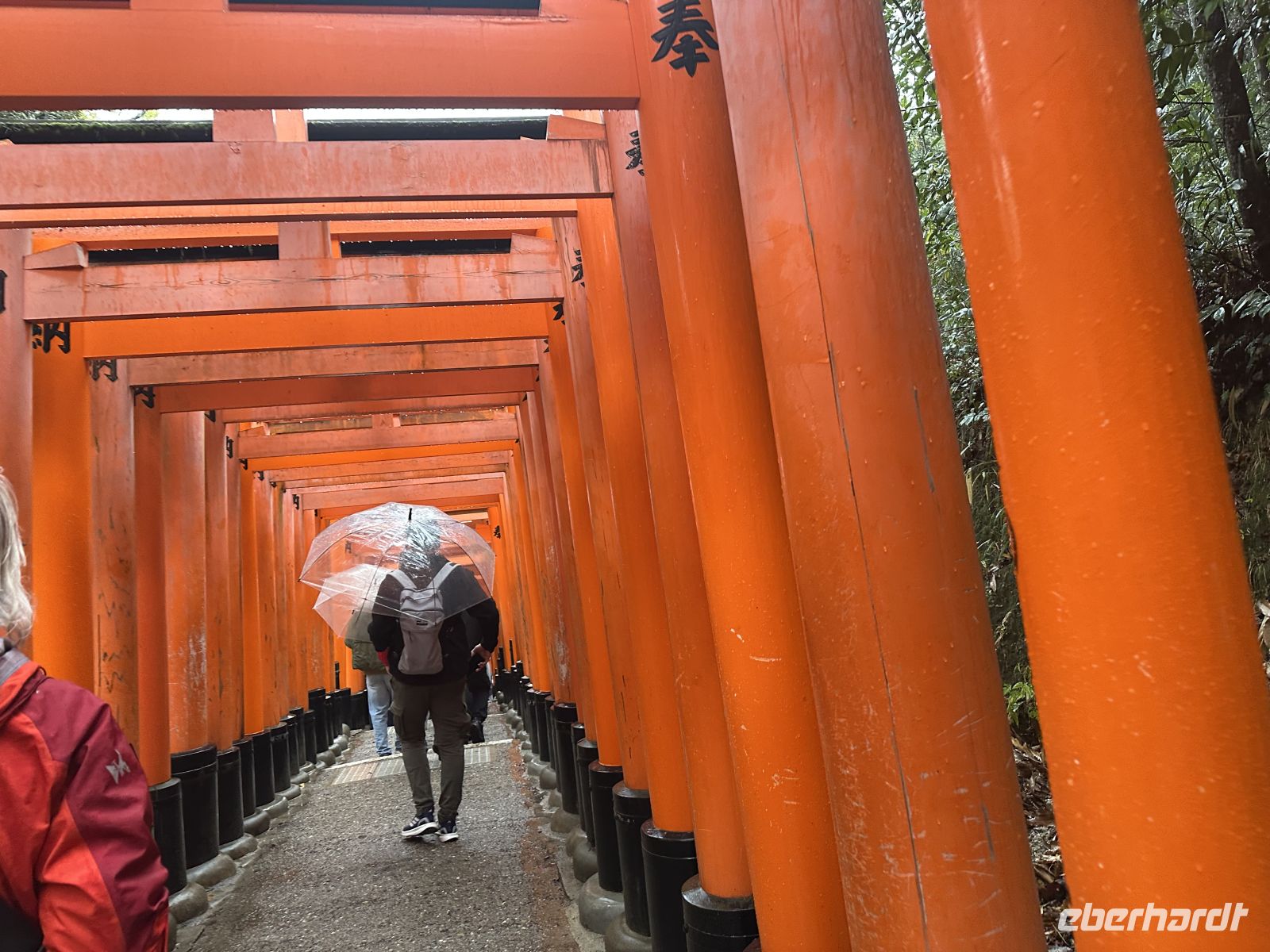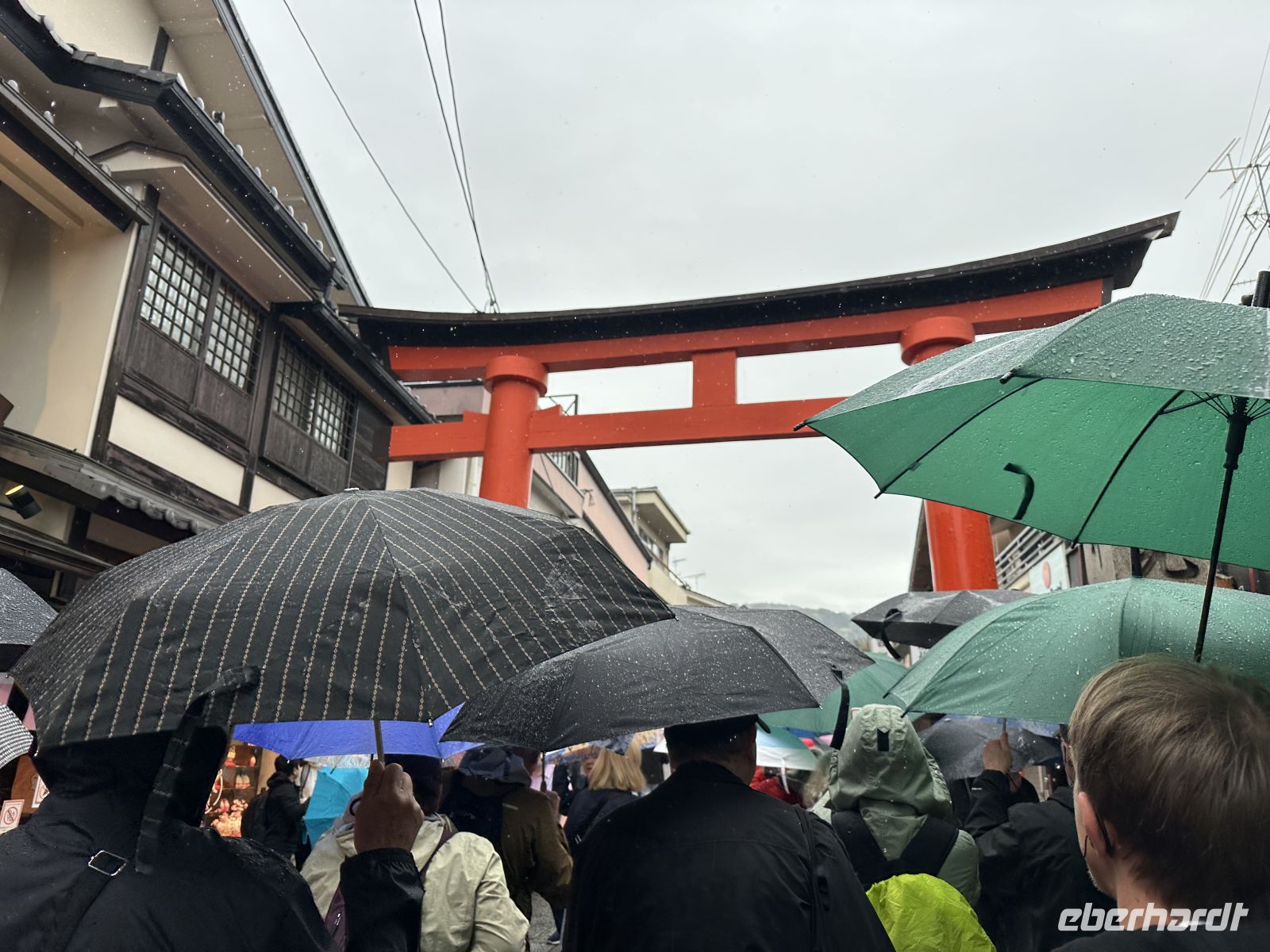 Der Tag beginnt mit einer eigentlich tollen Idee: dem Besuch des Fushimi Inari-Schreins, bekannt für seine schier endlosen Alleen aus tausenden orange-roten Torii-Toren. Doch die Realität holt uns schnell ein. Es ist unnormal voll – hunderte Menschen drängen sich durch die Pfade. Dazu öffnet der Himmel seine Schleusen und es regnet wie aus Kannen. Das dichte Gedränge unter den Regenschirmen macht das Vorankommen zu einer echten Herausforderung, und die mystische Stimmung der Tore geht im Trubel fast ein wenig unter.