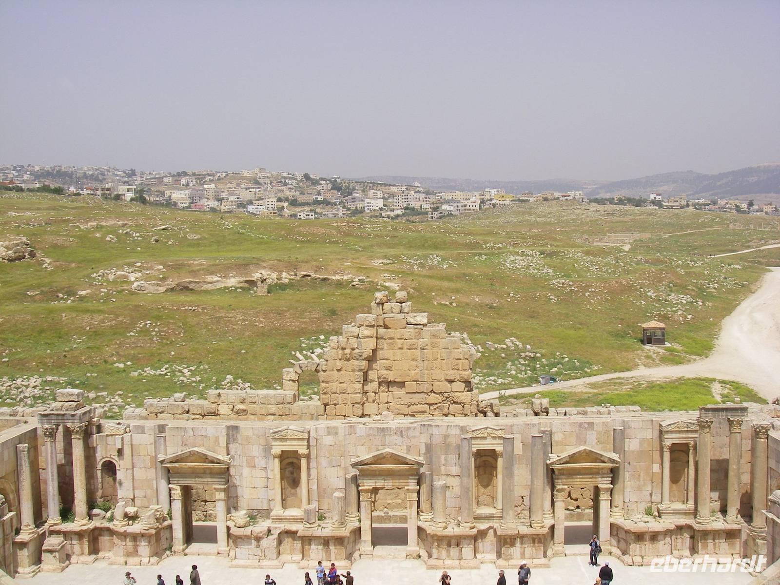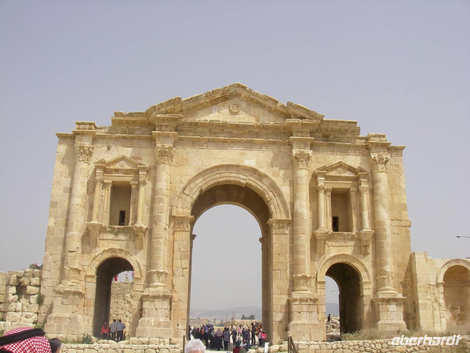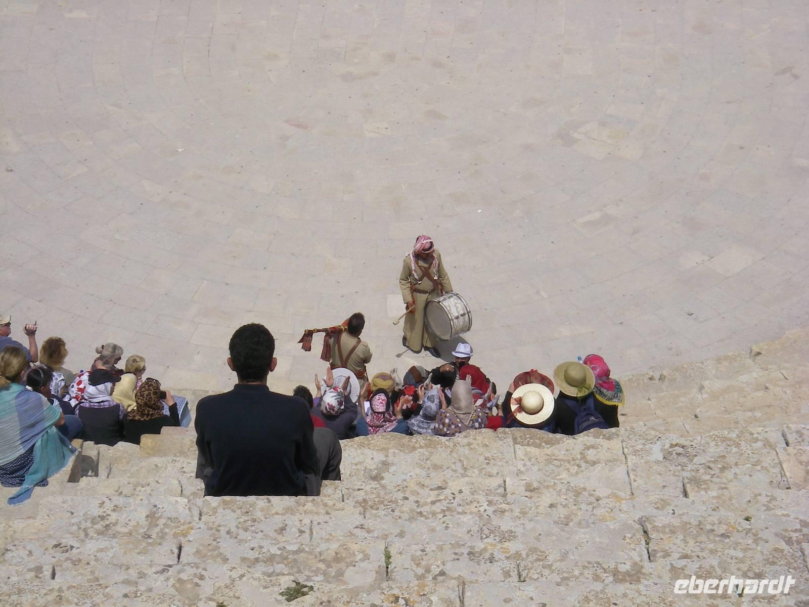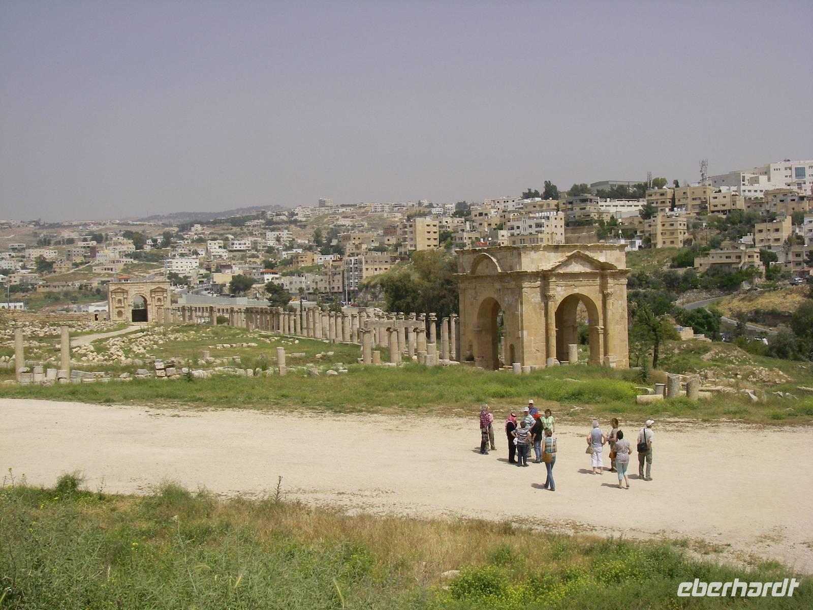 Unsere Fahrt führt zuerst nach Ajlun, einer der fruchtbarsten Regionen Jordaniens, wo es im Winter auch schon einmal schneien kann. Schon unterwegs bemerken wir, dass wir durch ein ganz anderes Landschaftsbild als gestern fahren. Alles ist grün und überall findet man Pinien- und Steineichenwälder, welche teilweise auch durch Aufforstung entstanden sind. In Ajlun angekommen, sehen wir schon von weitem die Mittelalterburg Qal'at ar-Rabad, die sich über der Stadt befindet. Nachdem Mahmoud die Tickets für uns geholt hat, fahren wir mit unserem Bus hoch zur Burg, wo er uns zunächst die Geschichte der Burg darstellt. Qal'at ar-Rabad ist die einzige mittelalterliche Burg Jordaniens, welche im 12. Jhd. von dem Neffen von Saladin, Izz ed-Din Usama, erbaut wurde. Entstanden ist die Burg zum Schutz der Pilger nach Mekka und als Verteidigungsanlage gegen die Kreuzritter, welche hier als Frankenkrieger bezeichnet wurden. Zudem wurde die Burg angeblich zur Übertragung von Nachrichten in Form von Taubenpost genutzt. Wir gehen durch die Burg und schauen uns die unterschiedlichsten Räume an. Oben angekommen genießen wir den schönen Rundumblick in die umliegende Landschaft und erkennen in der Ferne schon das Jordantal. Bei unserer Besichtigungstour durch die Burg machen wir auch Bekanntschaft mit jordanischen Mädchen, welche sich ausgelassen mit uns unterhalten und zahlreiche Fotos mit uns schießen. Im Anschluss lädt uns Mahmoud zu einem Tee bzw. arabischen Kaffee mit Kardamon zubereitet ein. Nun geht es weiter nach Jerash, der ehemaligen römischen Siedlung Gerasa. Hier angekommen, kämpfen wir uns durch einen sehr, sehr gut besuchten Basar zu der Ausgrabungsstätte, welche die bedeutendste römische Ausgrabung in Jordanien ist. Auch zahlreiche Schulgruppen besuchen heute diese Stätte, so dass wir unterwegs immer wieder von sehr aufgedrehten Kindern angesprochen werden. Zu Anfang unseres Rundgangs sehen wir vor den Stadtmauern den Hadrian-Triumphbogen und das Hippodrom, eine Pferderennbahn und gelangen schließlich zum Südtor, wo wir die Stadt betreten. Von hier aus gehen wir zum ovalen Platz, welcher aufgrund seiner Form diesen Namen trägt. Er ist von 56 ionischen Säulen umrahmt und mit großen Pflastersteinen ausgelegt. Von hier laufen wir über den Zeus-Tempel zum Südtheater. Dieses bietet Platz für etwa 3.000 Besucher und zählt zu den besterhaltenen Bauwerken auf dem Ruinengelände von Jerash. Einige Gäste lassen es sich nicht nehmen und gehen die 65 Stufen hoch zu den obersten Rängen. Hier hat man eine tolle Aussicht über die gesamte Stadt. Andere verweilen derzeit im unteren Teil des Theaters und lassen sich von der Dudelsackmusik der jordanischen Militärkapelle und den dazu tanzenden Einheimischen unterhalten. Da kommt Stimmung auf. Nach diesem Erlebnis führen wir mit dem Gebetsruf des Muezzins in den Ohren unseren Rundgang fort und sehen unterwegs den Drei-Kirchen-Komplex, den Artemistempel, das Nordtheater, die Westbäder und schließlich das Nordtor. Auf der Hauptstraße, dem Cardo, der 700 m lang und von mehr als 250 Säulen gesäumt ist, spazieren wir schließlich zurück zum ovalen Platz. Nach diesem ausführlichen Rundgang erholen wir uns bei einer Mittagspause in einem Restaurant vor dem Tor der Ausgrabungsstätte bei einem frisch gepressten kalten Zitronensaft mit Minze - lecker !!