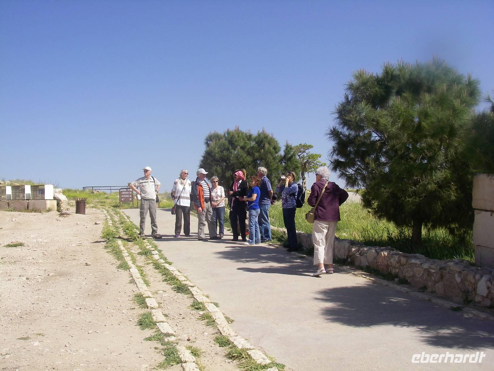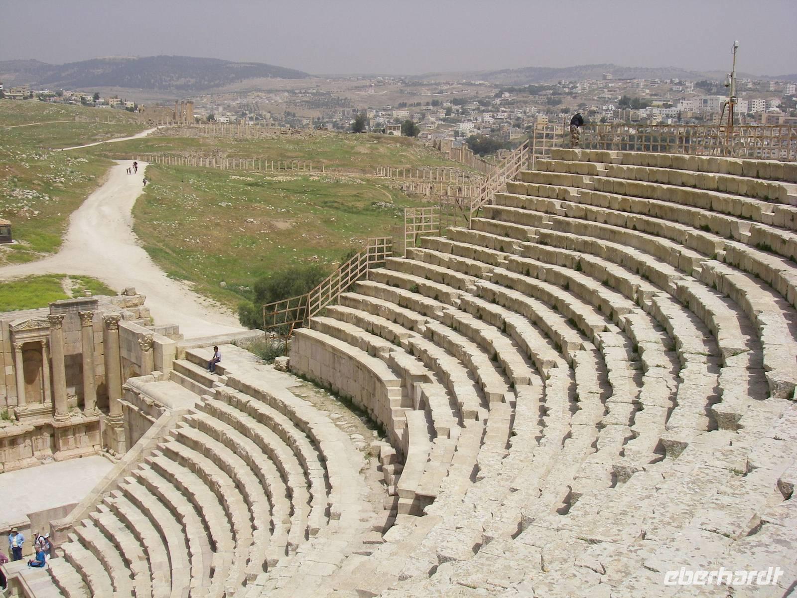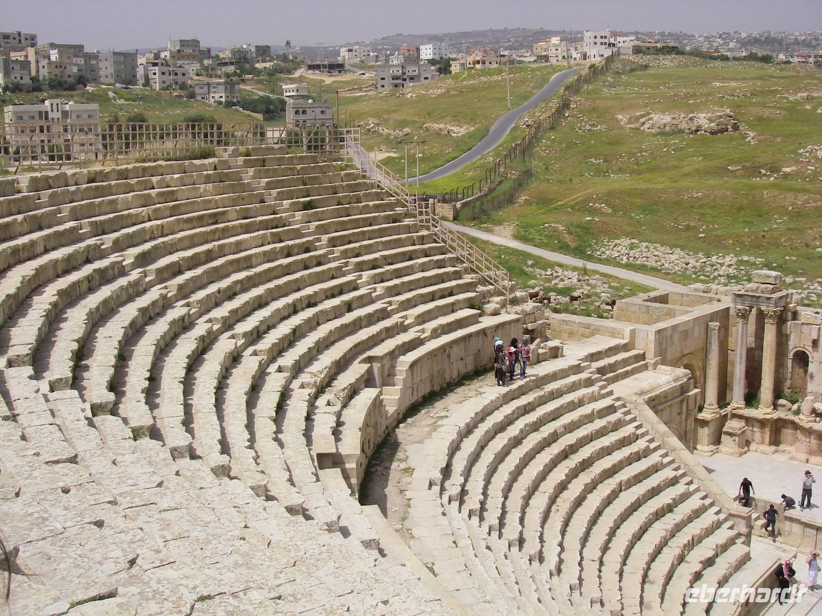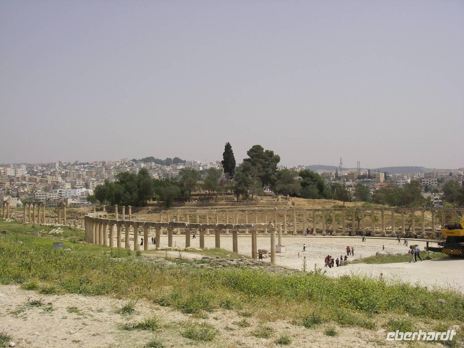 Unsere Fahrt führt zuerst nach Ajlun, einer der fruchtbarsten Regionen Jordaniens, wo es im Winter auch schon einmal schneien kann. Schon unterwegs bemerken wir, dass wir durch ein ganz anderes Landschaftsbild als gestern fahren. Alles ist grün und überall findet man Pinien- und Steineichenwälder, welche teilweise auch durch Aufforstung entstanden sind. In Ajlun angekommen, sehen wir schon von weitem die Mittelalterburg Qal'at ar-Rabad, die sich über der Stadt befindet. Nachdem Mahmoud die Tickets für uns geholt hat, fahren wir mit unserem Bus hoch zur Burg, wo er uns zunächst die Geschichte der Burg darstellt. Qal'at ar-Rabad ist die einzige mittelalterliche Burg Jordaniens, welche im 12. Jhd. von dem Neffen von Saladin, Izz ed-Din Usama, erbaut wurde. Entstanden ist die Burg zum Schutz der Pilger nach Mekka und als Verteidigungsanlage gegen die Kreuzritter, welche hier als Frankenkrieger bezeichnet wurden. Zudem wurde die Burg angeblich zur Übertragung von Nachrichten in Form von Taubenpost genutzt. Wir gehen durch die Burg und schauen uns die unterschiedlichsten Räume an. Oben angekommen genießen wir den schönen Rundumblick in die umliegende Landschaft und erkennen in der Ferne schon das Jordantal. Bei unserer Besichtigungstour durch die Burg machen wir auch Bekanntschaft mit jordanischen Mädchen, welche sich ausgelassen mit uns unterhalten und zahlreiche Fotos mit uns schießen. Im Anschluss lädt uns Mahmoud zu einem Tee bzw. arabischen Kaffee mit Kardamon zubereitet ein. Nun geht es weiter nach Jerash, der ehemaligen römischen Siedlung Gerasa. Hier angekommen, kämpfen wir uns durch einen sehr, sehr gut besuchten Basar zu der Ausgrabungsstätte, welche die bedeutendste römische Ausgrabung in Jordanien ist. Auch zahlreiche Schulgruppen besuchen heute diese Stätte, so dass wir unterwegs immer wieder von sehr aufgedrehten Kindern angesprochen werden. Zu Anfang unseres Rundgangs sehen wir vor den Stadtmauern den Hadrian-Triumphbogen und das Hippodrom, eine Pferderennbahn und gelangen schließlich zum Südtor, wo wir die Stadt betreten. Von hier aus gehen wir zum ovalen Platz, welcher aufgrund seiner Form diesen Namen trägt. Er ist von 56 ionischen Säulen umrahmt und mit großen Pflastersteinen ausgelegt. Von hier laufen wir über den Zeus-Tempel zum Südtheater. Dieses bietet Platz für etwa 3.000 Besucher und zählt zu den besterhaltenen Bauwerken auf dem Ruinengelände von Jerash. Einige Gäste lassen es sich nicht nehmen und gehen die 65 Stufen hoch zu den obersten Rängen. Hier hat man eine tolle Aussicht über die gesamte Stadt. Andere verweilen derzeit im unteren Teil des Theaters und lassen sich von der Dudelsackmusik der jordanischen Militärkapelle und den dazu tanzenden Einheimischen unterhalten. Da kommt Stimmung auf. Nach diesem Erlebnis führen wir mit dem Gebetsruf des Muezzins in den Ohren unseren Rundgang fort und sehen unterwegs den Drei-Kirchen-Komplex, den Artemistempel, das Nordtheater, die Westbäder und schließlich das Nordtor. Auf der Hauptstraße, dem Cardo, der 700 m lang und von mehr als 250 Säulen gesäumt ist, spazieren wir schließlich zurück zum ovalen Platz. Nach diesem ausführlichen Rundgang erholen wir uns bei einer Mittagspause in einem Restaurant vor dem Tor der Ausgrabungsstätte bei einem frisch gepressten kalten Zitronensaft mit Minze - lecker !!