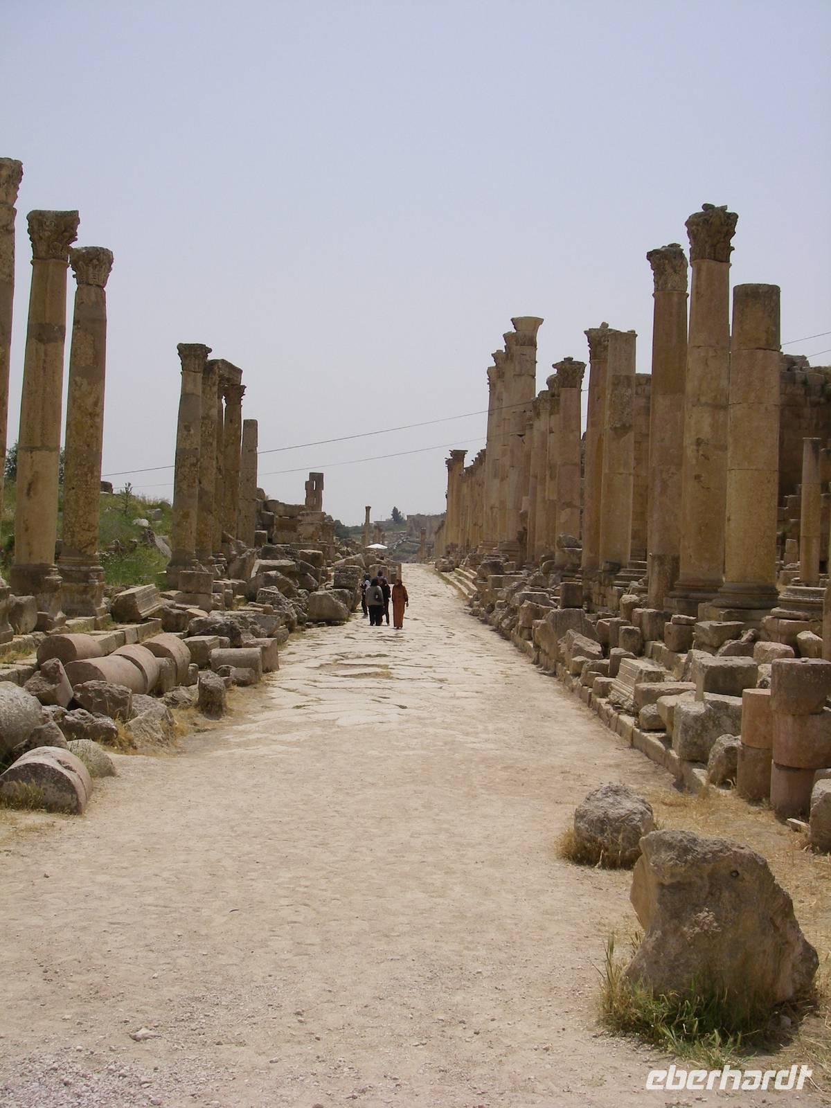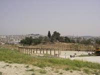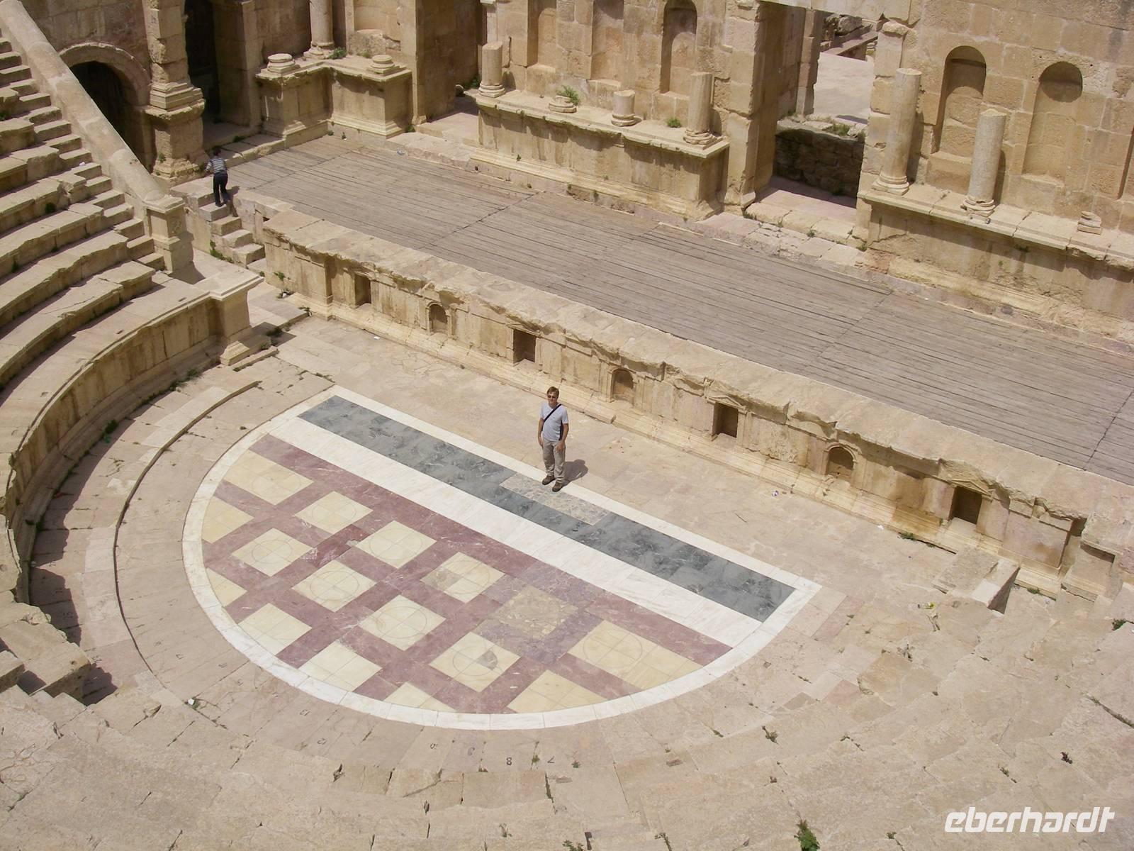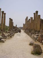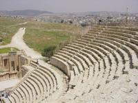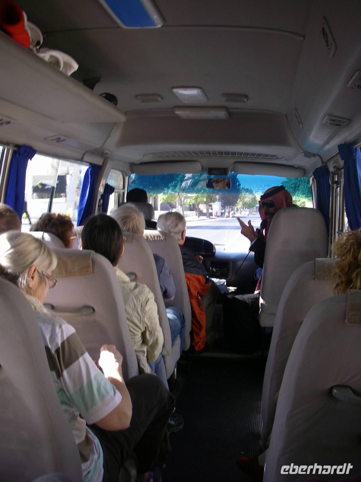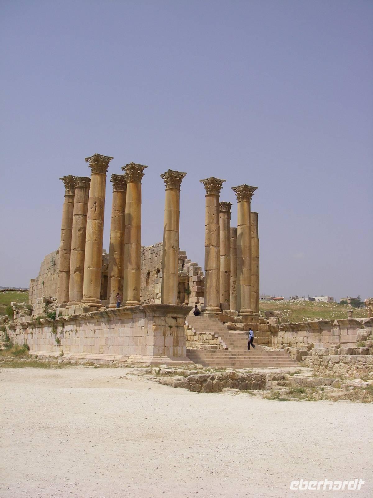 Unsere Fahrt führt zuerst nach Ajlun, einer der fruchtbarsten Regionen Jordaniens, wo es im Winter auch schon einmal schneien kann. Schon unterwegs bemerken wir, dass wir durch ein ganz anderes Landschaftsbild als gestern fahren. Alles ist grün und überall findet man Pinien- und Steineichenwälder, welche teilweise auch durch Aufforstung entstanden sind. In Ajlun angekommen, sehen wir schon von weitem die Mittelalterburg Qal'at ar-Rabad, die sich über der Stadt befindet. Nachdem Mahmoud die Tickets für uns geholt hat, fahren wir mit unserem Bus hoch zur Burg, wo er uns zunächst die Geschichte der Burg darstellt. Qal'at ar-Rabad ist die einzige mittelalterliche Burg Jordaniens, welche im 12. Jhd. von dem Neffen von Saladin, Izz ed-Din Usama, erbaut wurde. Entstanden ist die Burg zum Schutz der Pilger nach Mekka und als Verteidigungsanlage gegen die Kreuzritter, welche hier als Frankenkrieger bezeichnet wurden. Zudem wurde die Burg angeblich zur Übertragung von Nachrichten in Form von Taubenpost genutzt. Wir gehen durch die Burg und schauen uns die unterschiedlichsten Räume an. Oben angekommen genießen wir den schönen Rundumblick in die umliegende Landschaft und erkennen in der Ferne schon das Jordantal. Bei unserer Besichtigungstour durch die Burg machen wir auch Bekanntschaft mit jordanischen Mädchen, welche sich ausgelassen mit uns unterhalten und zahlreiche Fotos mit uns schießen. Im Anschluss lädt uns Mahmoud zu einem Tee bzw. arabischen Kaffee mit Kardamon zubereitet ein. Nun geht es weiter nach Jerash, der ehemaligen römischen Siedlung Gerasa. Hier angekommen, kämpfen wir uns durch einen sehr, sehr gut besuchten Basar zu der Ausgrabungsstätte, welche die bedeutendste römische Ausgrabung in Jordanien ist. Auch zahlreiche Schulgruppen besuchen heute diese Stätte, so dass wir unterwegs immer wieder von sehr aufgedrehten Kindern angesprochen werden. Zu Anfang unseres Rundgangs sehen wir vor den Stadtmauern den Hadrian-Triumphbogen und das Hippodrom, eine Pferderennbahn und gelangen schließlich zum Südtor, wo wir die Stadt betreten. Von hier aus gehen wir zum ovalen Platz, welcher aufgrund seiner Form diesen Namen trägt. Er ist von 56 ionischen Säulen umrahmt und mit großen Pflastersteinen ausgelegt. Von hier laufen wir über den Zeus-Tempel zum Südtheater. Dieses bietet Platz für etwa 3.000 Besucher und zählt zu den besterhaltenen Bauwerken auf dem Ruinengelände von Jerash. Einige Gäste lassen es sich nicht nehmen und gehen die 65 Stufen hoch zu den obersten Rängen. Hier hat man eine tolle Aussicht über die gesamte Stadt. Andere verweilen derzeit im unteren Teil des Theaters und lassen sich von der Dudelsackmusik der jordanischen Militärkapelle und den dazu tanzenden Einheimischen unterhalten. Da kommt Stimmung auf. Nach diesem Erlebnis führen wir mit dem Gebetsruf des Muezzins in den Ohren unseren Rundgang fort und sehen unterwegs den Drei-Kirchen-Komplex, den Artemistempel, das Nordtheater, die Westbäder und schließlich das Nordtor. Auf der Hauptstraße, dem Cardo, der 700 m lang und von mehr als 250 Säulen gesäumt ist, spazieren wir schließlich zurück zum ovalen Platz. Nach diesem ausführlichen Rundgang erholen wir uns bei einer Mittagspause in einem Restaurant vor dem Tor der Ausgrabungsstätte bei einem frisch gepressten kalten Zitronensaft mit Minze - lecker !!