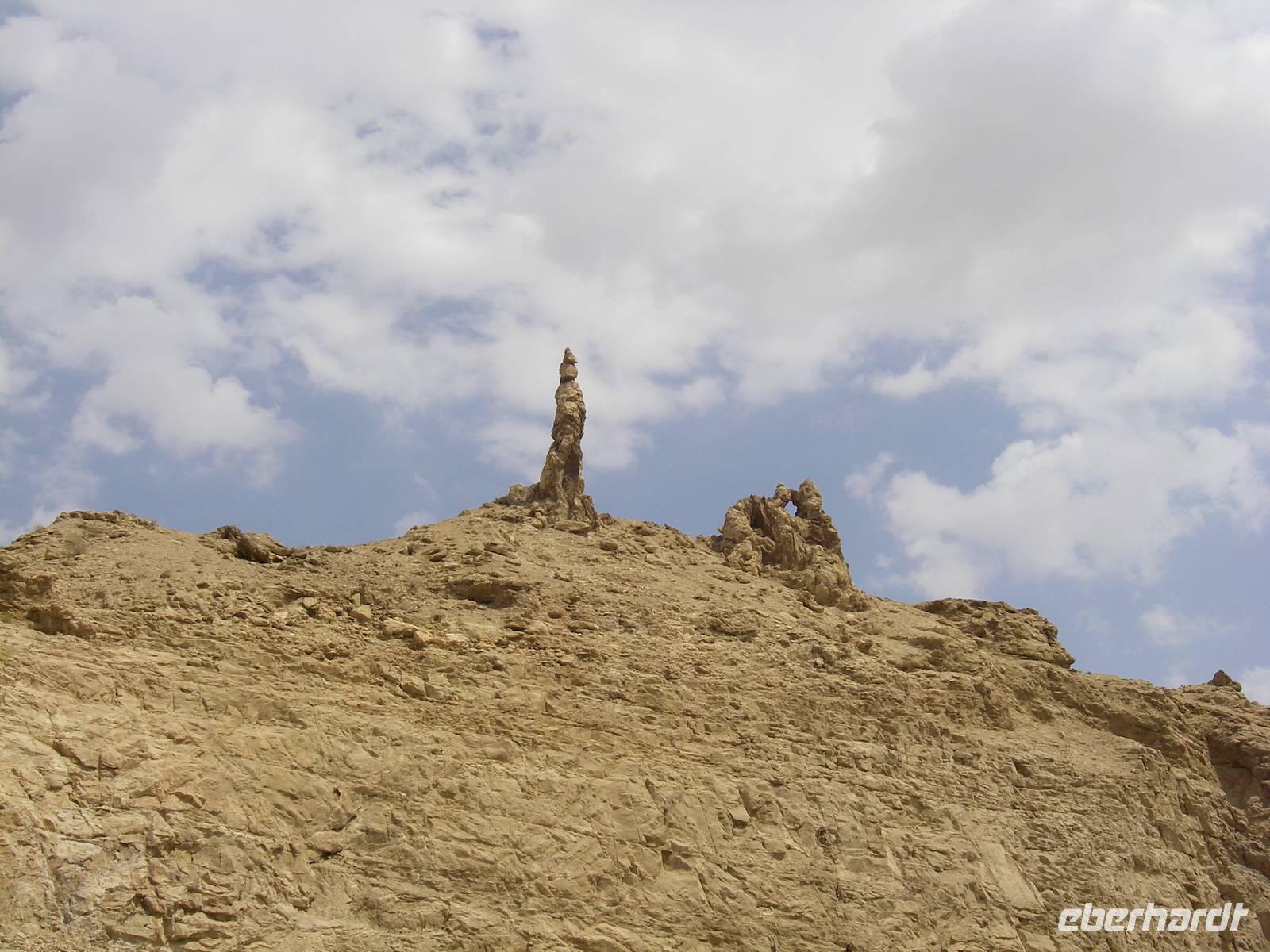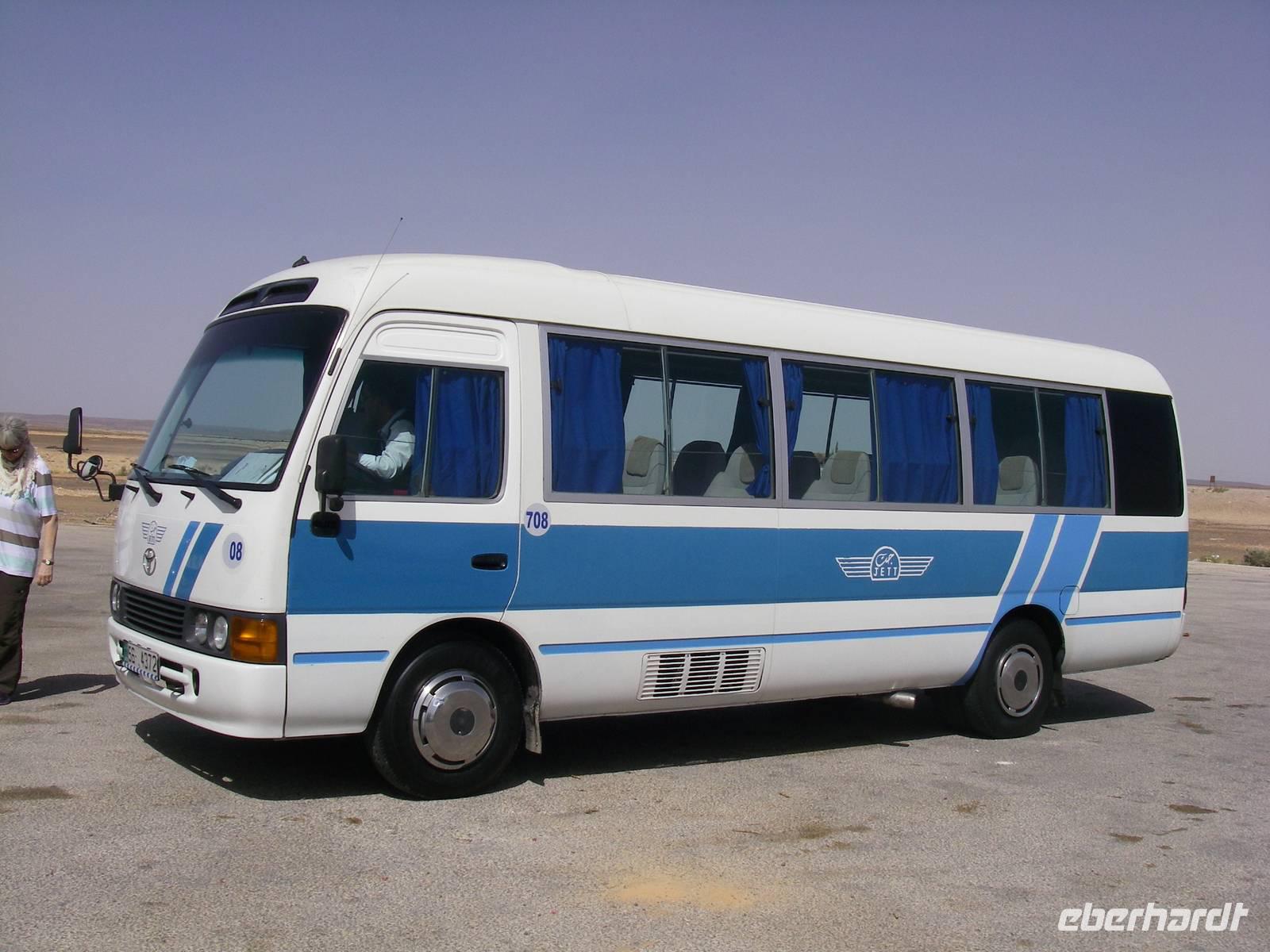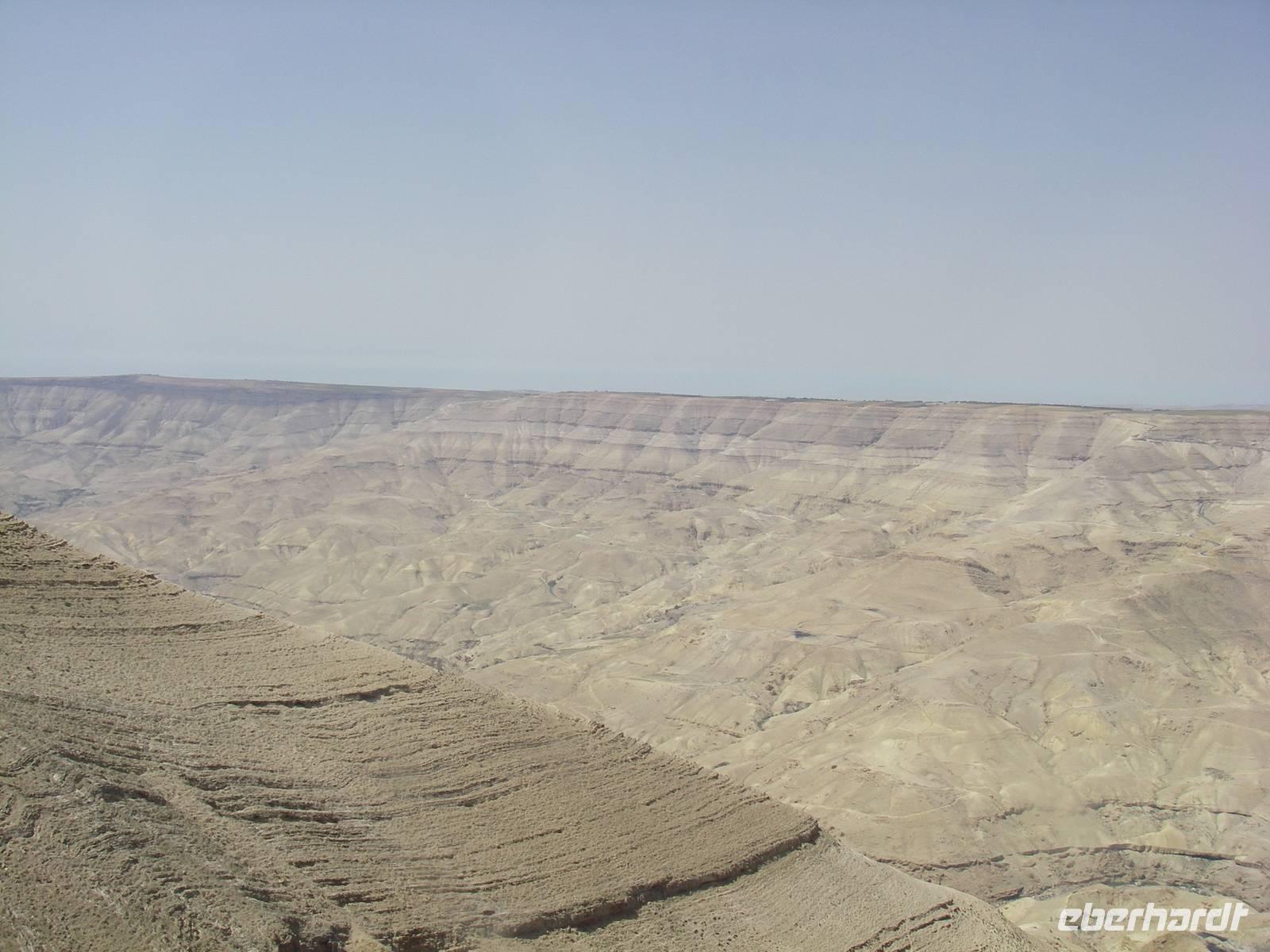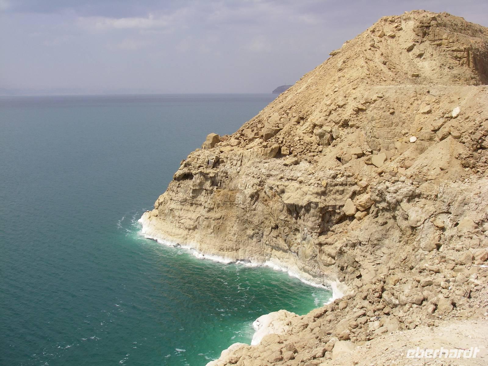 Nachdem wir heute ausgeschlafen haben, machen wir uns gegen 10:30 Uhr auf den Weg zu unserer letzten Etappe. Vorbei am Flughafen von Aqaba und entlang der Grenze zu Israel fahren wir durch das Wadi Aqaba und nähern uns langsam dem Toten Meer. Um die Zeit im Bus angenehmer zu gestalten, hören wir typisch arabische Musik. Nach einer kurzen Kaffeepause sehen wir endlich das Südufer des Toten Meeres. Dieses weist einen Seespiegel von 418 m unter NN auf und ist damit das tiefst gelegene Gewässer der Erde. Neben dieser Besonderheit hat es zudem einen Salzgehalt von durchschnittlich 31,5 % und ist deshalb auch extrem arm an Flora und Fauna. An der Ostküste des Meeres fahren wir bis zu einem Aussichtpunkt, wo wir uns die Küstenline sehr gut anschauen können. Hier befindet sich auch angeblich Lots Frau, welche sich der Sage nach entgegen dem Befehl von Gott nach den brennenden Städten Sodom und Gomorrha umdrehte und deshalb zu einer Salzsäule erstarrte.