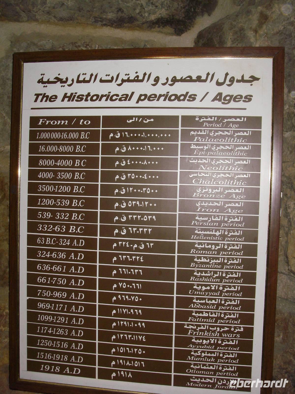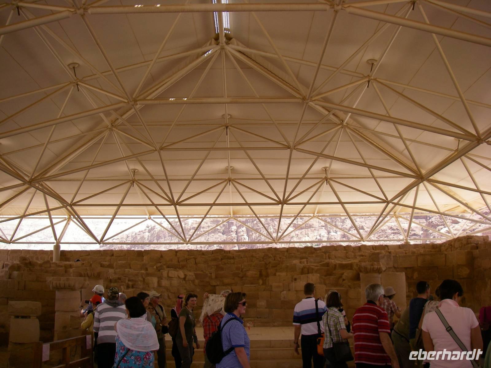 Nach einer kurzen Nachtruhe und einem reichhaltigen Frühstück begeben wir uns bei strahlend blauem Himmel gegen 09:00 Uhr auf den Weg zu unserem ersten Erkundungstag im Königreich Jordanien. Bei einer Stadtrundfahrt durch das moderne und relativ junge West-Amman lassen wir uns von dem Baustil der zahlreichen Villen und den ausgefallenen Baumschnitten beeindrucken. Aber neben diesen faszinierenden „Palästen" stellen wir auch fest, dass in Amman überall gebaut wird und die Stadt somit eine große Baustelle ist. Das Geld für diese unzähligen Baumaßnahmen stammt aus dem arabischen Golf. Nachdem wir mehrmals bergauf und bergab und wieder bergauf gefahren sind, erreichen wir schließlich die Zitadelle, welche sich auf einem 837 m hohen Hügel mitten in der Stadt Amman befindet. Von hier oben bietet sich uns ein unvergesslicher Rundumblick über die weiße Stadt. Auch das römische Amphitheater sowie der 126,8 m hohe Flaggenmast mit der jordanischen Flagge (Maße 60 x 30 m) kann von der Zitadelle aus erspäht werden. Während der Besichtigungstour über die Zitadelle sehen wir unterschiedlichste Ausgrabungen aus den verschiedenen Epochen der Stadtgeschichte und erfahren von Mahmoud viele wichtige Ereignisse aus der Geschichte von Amman und Jordanien. So erzählt er uns zum Beispiel, dass Amman die erste Stadt auf der Welt war, welche Philadelphia hieß. Denn nachdem Alexander der Große die Stadt erobert hatte, wurde sie unter der Herrschaft von Ptolemäus II. Philadelphos in Philadelphia umbenannt. Bei unserem Spaziergang über die Zitadellen sehen wir unter anderem einen kleinen Friedhof, Überreste eines römischen Tempels und den omaijadischen Palastkomplex mit der gut erhaltenen Wartehalle. Zum Abschluss besuchen wir das archäologische Museum, wo wir noch einmal anhand von verschiedenen Funden die Geschichte von Jordanien nachverfolgen. Nachdem alle wieder im Bus sitzen, verlassen wir Amman in Richtung Osten. Durch unendlich scheinende Steppenlandschaft fahrend, erreichen wir schließlich die Oase Al Azraq, welche die Hauptstadt Amman teilweise mit Wasser versorgt. Hier leben auf der einen Seiten der Straßen die Tscherkessen, auf der gegenüberliegenden Seite hingegen die Drusen. In Al Azraq angekommen, besichtigen wir zunächst die gleichnamige Schlossruine Qasr al-Azraq. Dieses Wüstenschloss besteht im Vergleich zu den anderen Schlössern, welche aus Kalkstein sind, aus Basalt und wurde ursprünglich von den Römern als Verteidigungsanlage gegen Beduinen aus der arabischen Wüste genutzt. Später wurde die Festung dann von Lawrence von Arabien als Hauptquartier während des Aufstandes der Araber gegen die Osmanen eingesetzt. Nach einem Mittagessen mit typisch arabischen Spezialitäten und einem süßem arabischen Kaffee führt uns die Fahrt zum nächsten Wüstenschloss, dem Lustschlösschen Qusair Amra. Dieses gehört zum UNESCO-Weltkulturerbe und gilt als das schönste Wüstenschloss in Jordanien. Wir bestaunen hier besonderes die zahlreichen Fresken im Innenbereich des Schlosses und lassen uns von Mahmoud den Hintergrund dieser erläutern. Anschließend geht es zum letzten Schloss für diesen Tag, dem gigantischen Wüstenschloss Qasr al-Kharana. Es weist einen quadratischen Grundriss von 44x44 m auf und hat 64 Räume, was von außen kaum zu glauben ist. Wie uns Mahmoud erzählt, kann hier eigentlich nicht von einem Schloss gesprochen werden, da Qasr al-Kharana in der Vergangenheit höchstwahrscheinlich als Karawanserei für die Pilger auf dem Weg nach Mekka genutzt wurde. Dies beweisen beispielsweise die Stallungen und Lagerräume im Erdgeschoss des zweistöckigen Gebäudes. Zurück im Hotel lassen wir den Tag bei einem gemeinsamen Abendessen in Form eines Menüs ausklingen und begeben uns anschließend sofort auf unsere Zimmer um etwas Schlaf nachzuholen.