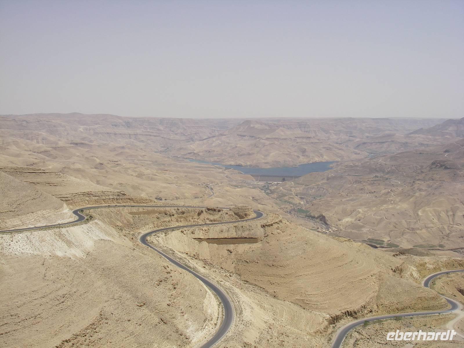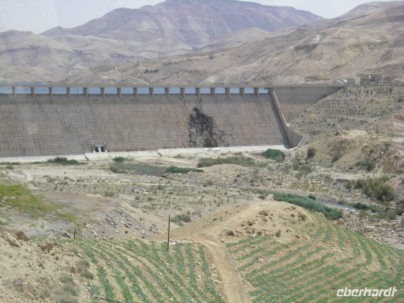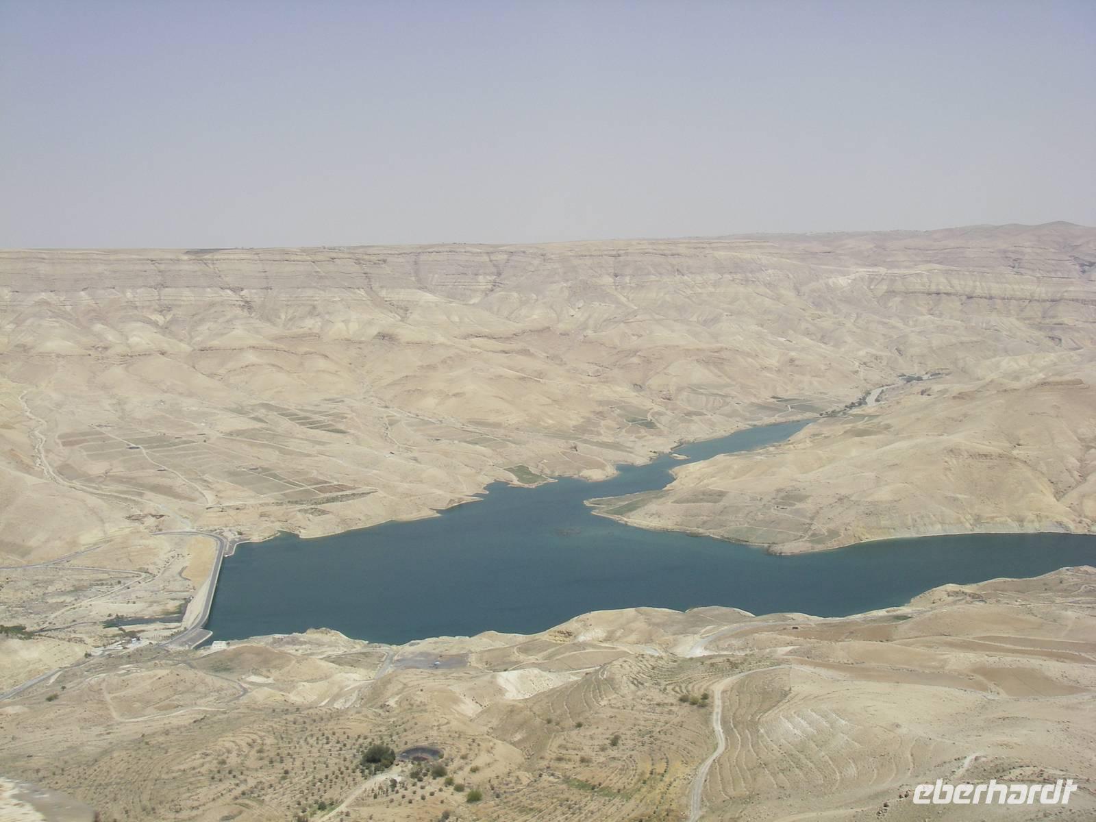 Bevor wir anschließend wieder zum Hotel in Amman fahren, schlendern wir noch etwas über den kleinen Basar am Parkplatz und erstehen erste kleine Souvenirs. Auf dem Weg zurück nach Amman legen wir noch einen kurzen Fotostopp an dem größten Stausee von Jordanien, dem Stausee König Abdullah, ein.