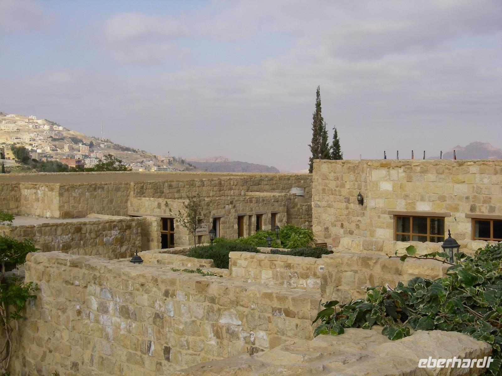 Mit gepackten Koffern starten wir heute gegen 08:00 Uhr vom Hotel. Doch bevor wir die Hauptstadt verlassen, besuchen wir noch die König Abdullah Moschee, die größte und schönste Moschee im Königreich Jordanien. Hier müssen wir Frauen uns alle mit einem schwarzen Gewand mit Kapuze verhüllen, um die Moschee überhaupt betreten zu dürfen. Am Eingang zur Moschee ziehen alle ihre Schuhe aus und betreten anschließend den Gebetsraum, wo Mahmoud uns ausführlich über den Islam - wie die 5 Fundamente des Islams, die Gebetszeremonie usw. - informiert. An einer Anzeigetafel sehen wir, dass nach Mondrechnung heute nicht der 14.04.2013 sondern der 03.06.1434 ist. Nachdem wir diesen Gebetssaal, welcher über die größte Kuppel der Welt ohne Stützen verfügt, besichtigt haben, dürfen sich ausschließlich die Damen noch den Gebetsraum der Frauen anschauen. Denn im Islam ist es vorgeschrieben, dass Männer und Frauen immer getrennt beten. Nun heißt es Abschied nehmen von Amman. In Richtung Süden erreichen wir nach einstündiger Fahrzeit den Berg Nebo, von dem Moses das „Heilige Land" gesehen haben soll und wo er angeblich auch beerdigt ist. Jedoch gibt es bis heute keine Spuren von seinem Grab. Wir genießen von hier oben die einmalige Aussicht über das „Heilige Land" und erkennen in der Ferne sogar andeutungsweise das Tote Meer. An diesem Aussichtspunkt erzählt uns Mahmoud auch die Geschichte zu dem Eisernen Kreuz, das von einer Schlange umwunden und hier zu sehen ist. Auch Papst Johannes Paul II. war im Jahre 2009 auf dem Berg Nebo, um den Blick über das „Heilige Land" zu genießen. Da die Gedächtniskirche auf dem Berg Nebo immer noch restauriert wird, schauen wir uns in einem Besucherzentrum die Mosaiken, welche die Archäologen in der Kirche gefunden haben, an. Dann geht es auch schon weiter nach Madaba, die Stadt der Mosaike, die wir nach nur wenigen Kilometern erreichen. Nach einem kleinen Spaziergang durch die Straßen von Madaba gelangen wir zu der griechisch-orthodoxen St. Georgskirche, die eine einzigartige Mosaik-Landkarte von Palästina beherbergt. Die Landkarte stammt wahrscheinlich aus dem 6. Jhd. und bestand ursprünglich aus ca. 2,3 Mio. Steinen. Ein einziger Arbeiter legt am Tag ca. 200 Steine. Demzufolge kann man sich ausrechnen, wie viele Arbeiter bzw. Tage an dieser Karte wohl gearbeitet haben bzw. wurde. Mahmoud erläutert uns die Karte zunächst an einem Schaubild außerhalb der Kirche. Hierbei stellen wir auch fest, dass sie einen Fehler beinhaltet, da der Flussverlauf vom Nil falsch ist. Dieser verläuft nicht etwa wie auf der Karte dargestellt von Ost nach West, sondern von Süden nach Norden. Anschließend gehen wir in die Kirche und schauen uns die Mosaik-Landkarte im Original an. Nun fahren wir weiter in Richtung Süden. Doch bevor wir Madaba verlassen, überrascht uns Mahmoud noch mit süßen einheimischen Bananen. Gestärkt machen wir uns auf den Weg nach Kerak. Unterwegs fahren wir durch die atemberaubende Landschaft des Grand Canyons von Jordanien, dem Wadi al-Mujib. Nach dem Mittagessen in Kerak besuchen wir die über der Stadt thronende gleichnamige Kreuzritterburg Kerak. Sie wurde 1142 von Payen le Bouteillier errichtet, um den Pilger- und Handelsverkehr zwischen Damaskus und Mekka zu kontrollieren. Hier erzählt uns Mahmoud auch von dem Kreuzritter Rainald von Châtillon, dem Burgherr nach Bouteillier. Er gilt als Sadist, da er die Gefangenen, welche er bei Überfallen auf die Karawanen nahm, quälte. Wir besichtigen die dunklen Gänge und Räume der Burg und sehen dabei unter anderem eine ehemalige Weizenmühle bzw. Weinpresse und einen Backoffen. Von Kerak geht es weiter in Richtung Petra. Um uns unterwegs noch einmal die Beine zu vertreten, machen wir eine kurze Pause an einer Raststätte. Nach Sonnenuntergang erreichen wir schließlich Wadi Musa, welches sich unweit von Petra befindet. Unser Hotel für die kommenden drei Nächte ist das „Beit Zaman". Dieses basiert auf einem ehemaligen Dorf, welches modernisiert wurde, aber in der alten Form bestehen blieb. Nach diesem langen Tag fallen wir nach unserem Abendessen im Hotel tot müde ins Bett.