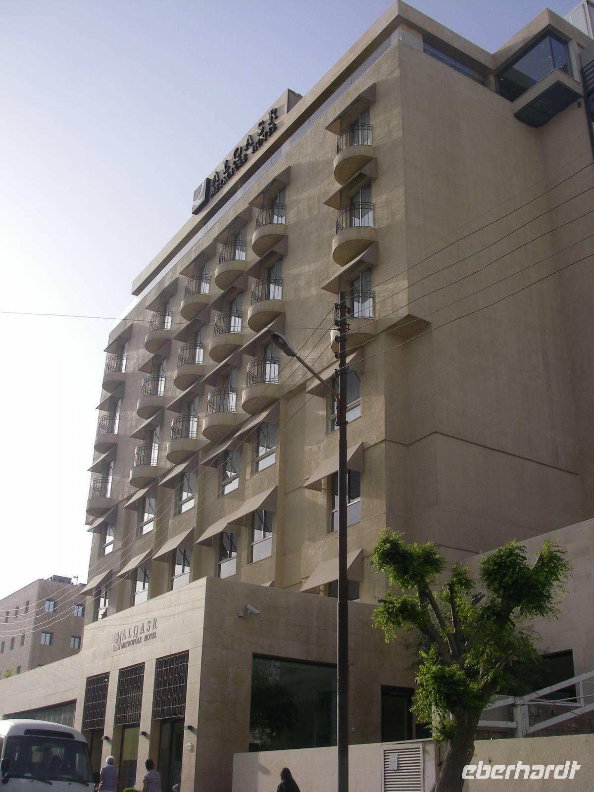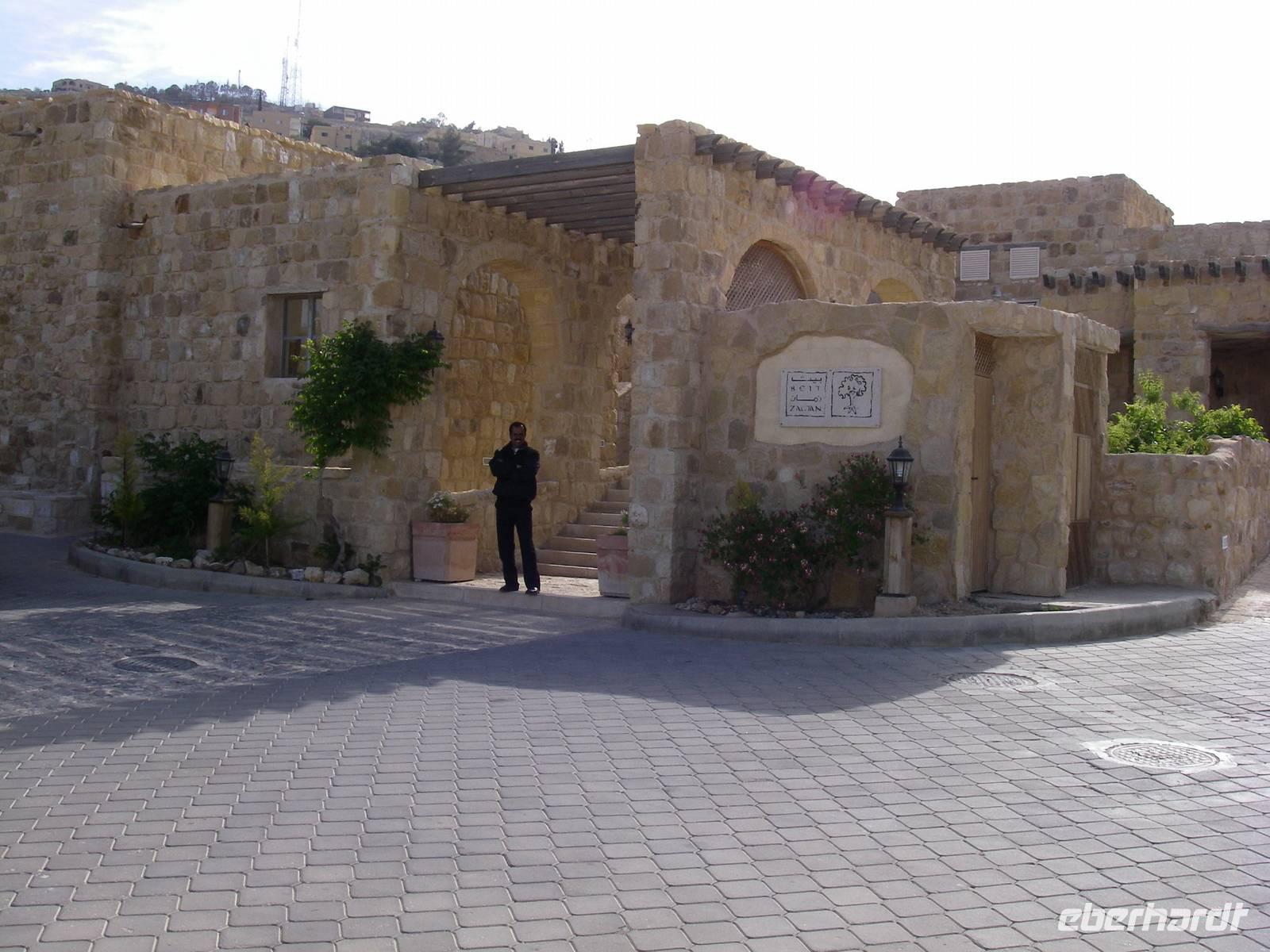 Dank der immer noch frischen Temperaturen in Deutschland fällt uns der Abschied nicht schwer. Nachdem wir unsere Koffer am Schalter der Lufthansa abgegeben haben, gönnen wir uns noch einen gemeinsamen Snack im Restaurant "Chili". Frisch gestärkt und mit voller Vorfreude auf unsere bevorstehende Reise in den Orient begeben wir uns durch die Sicherheitskontrolle zu unserem Abfluggate und starten pünktlich Richtung Frankfurt. Dort angekommen, müssen wir einen doch etwas weiteren Weg zurücklegen um zu unserem Weiterfluggate zu gelangen. Doch wir haben genügend Zeit und machen alles in Ruhe. Später stoßen auch die Gäste aus Leipzig und Berlin zu uns. Gemeinsam starten wir am Abend schließlich in Richtung Jordanien. Nachdem wir im Flugzeug ein warmes Abendessen erhalten haben, ruhen wir uns noch etwas aus. Beim Landeanflug auf Amman bietet sich uns ein herrlicher Blick und der Pilot erklärt, wo sich welche Städte befinden. Gegen 01:00 Uhr Ortszeit landen wir an dem kürzlich neu eröffneten Flughafenterminal des "Queen Alia International Airport" in Amman. Kaum haben wir die Maschine verlassen, werden wir schon von einem Mitarbeiter der örtlichen Agentur erwartet, welcher die Visa für uns besorgt. Mit den Koffern in der Hand und dem Visum im Pass verlassen wir das Flughafengebäude. Hier treffen wir auch schon gleich auf Mahmoud, unseren Reiseleiter, welcher uns in den kommenden Tagen durch sein Heimatland Jordanien führt. Mit ihm machen wir uns auf den Weg zu unserem Hotel in Amman. Auf der Fahrt gibt uns Mahmoud schon erste Informationen zu unserem Reiseland. Tot müde kommen wir im Hotel an und gehen sofort zu Bett.