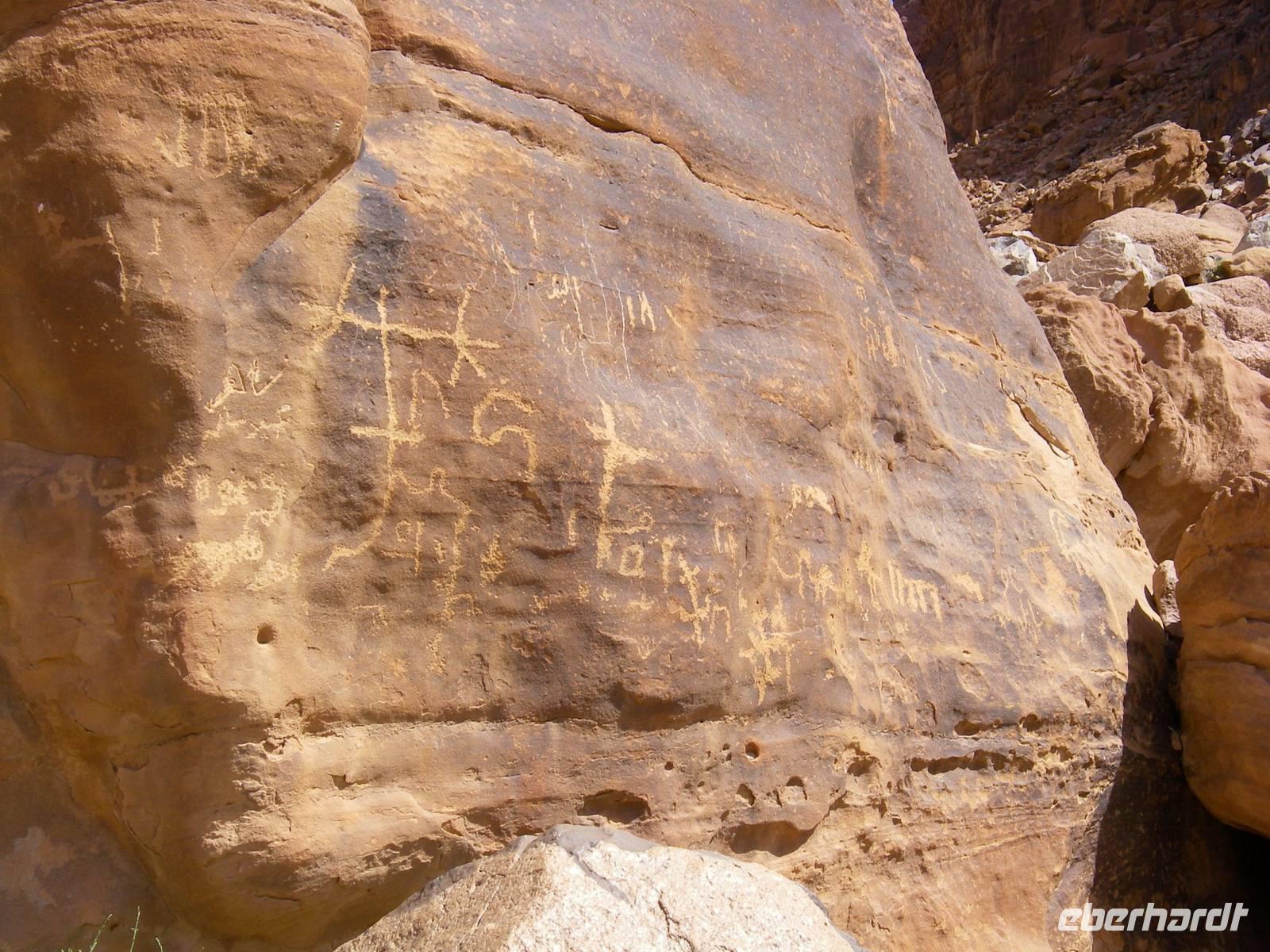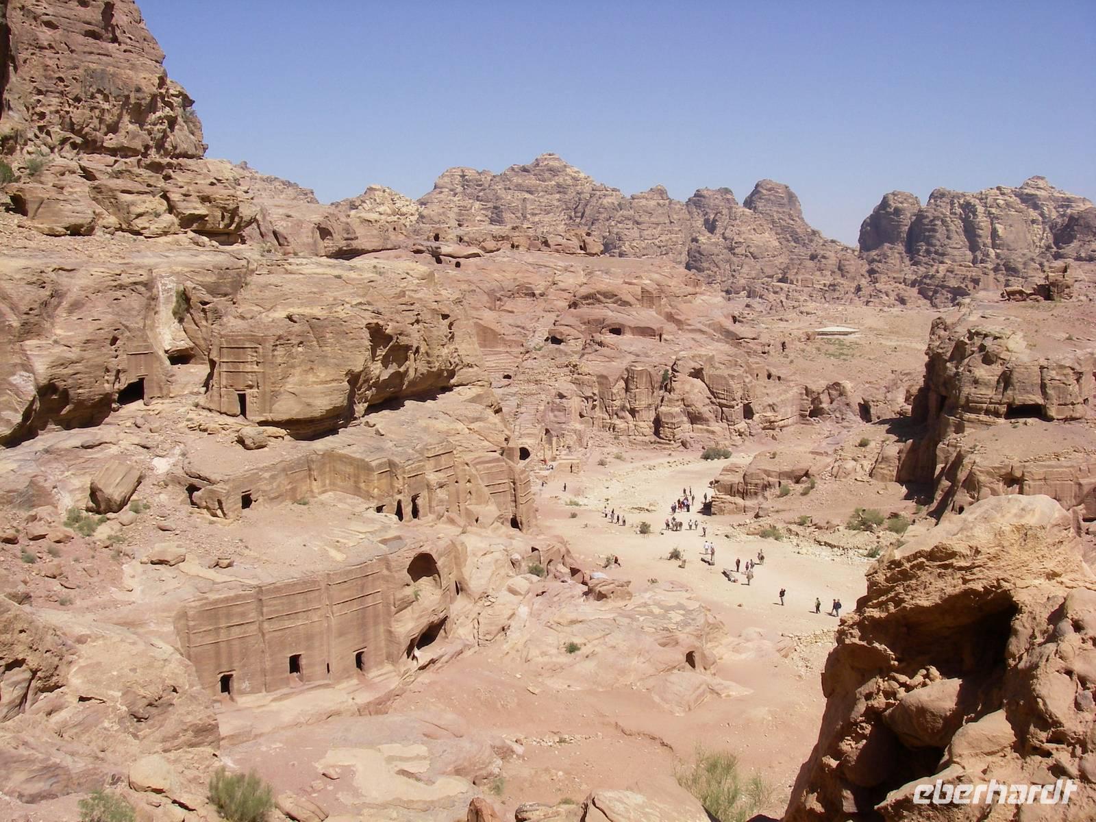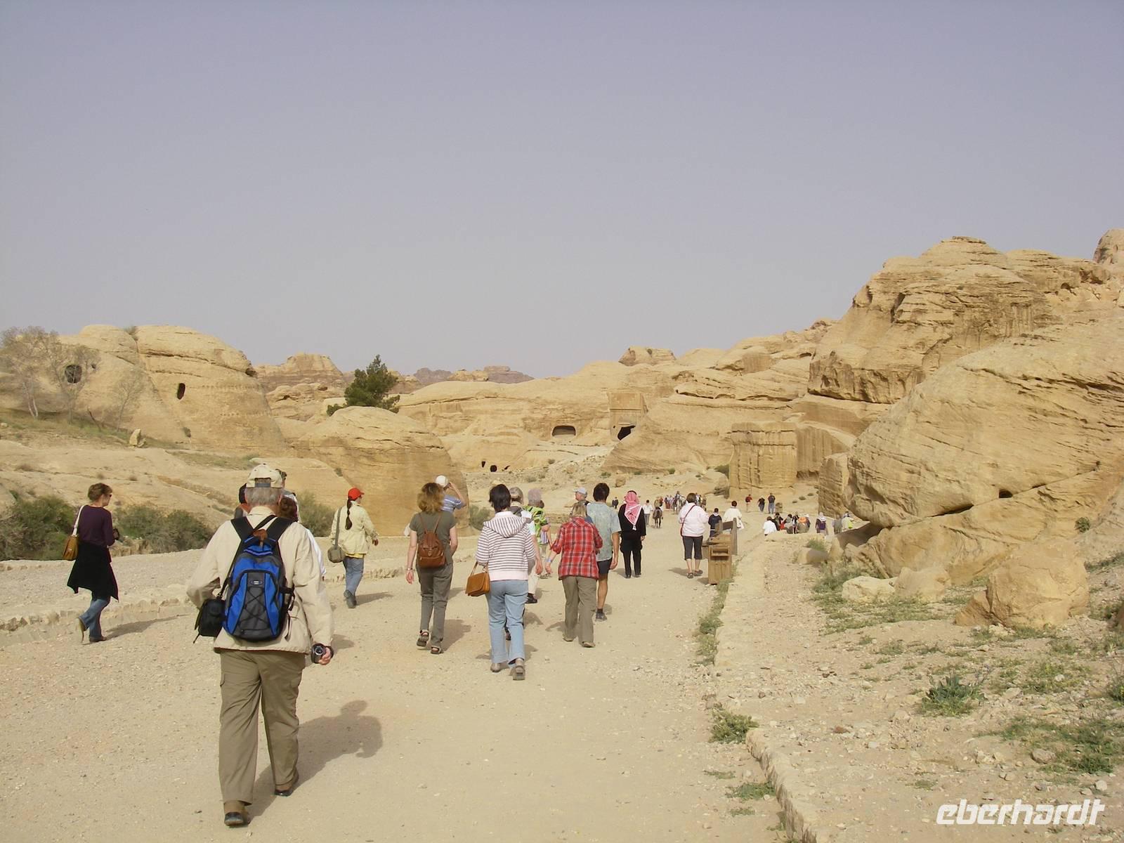 Der heutige Tag steht zur individuellen Erkundung von Petra zur Verfügung. Da sich einige Gäste am gestrigen Tag bereits einen für sie ausreichenden Überblick über die Felsenstadt verschafft haben, machen sie heute bei einem Bummel durch Wadi Musa die Stadt unsicher. Der Rest macht sich durch den Siq wieder auf den Weg in die Nabatäer-Hauptstadt. Da sich nicht alle Gäste für den Aufstieg auf den Opferplatz entscheiden, trennen wir uns und verabreden uns für den Nachmittag am Ausgang. So dass einige den heutigen Tag für einen gemütlichen Spaziergang durch das weitläufige Areal nutzen und die restlichen 5 Gäste sich mit Mahmoud und mir auf den Weg zum Opferplatz machen. Nachdem wir vorbei an dem Schatzhaus und der Fassadenstraße sind, erreichen wir die Treppen hoch zum Opferplatz. Auf ca. 800 Stufen, welche teilweise in den Fels geschlagen sind, erreichen wir nach einem anstrengenden aber abwechslungsreichen Aufstieg den Opferplatz. Belohnt mit einer tollen Aussicht verweilen wir hier oben, erholen uns und machen natürlich als Beweis für unser Erklimmen des Opferplatzes ein Beweisfoto von der Gruppe. Auf einem anderen Weg als welchen wir zum Aufstieg genutzt haben, steigen wir wieder hinab ins Tal. Dabei sehen wir die Löwenfontäne, das Gartengrab, den Bunten Saal sowie das gegenüberliegende Soldatengrab und nicht zu vergessen das Renaissance-Grab. Auch die unterschiedlichsten Felsformationen werden von uns bewundert. Da in diesem Bereich von Petra nicht so viele Touristen unterwegs sind, fühlen wir manchmal so als hätten wir die Stadt für uns allein. Wieder im Tal angekommen, machen wir eine kleine Trinkpause und spazieren wieder zurück zum Bus. Da der Weg durch den Siq auch mit einer Kutsche zurückgelegt werden kann, entscheiden sich zwei Gäste für dieses Erlebnis. Gesund und munter treffen wir sie am Eingang wieder und fahren mit noch eben erstandenen Souvenirs zum Hotel, wo der Nachmittag zur freien Verfügung steht. Wie gewohnt treffen wir uns dann 18:30 Uhr zum Abendessen im Restaurant.