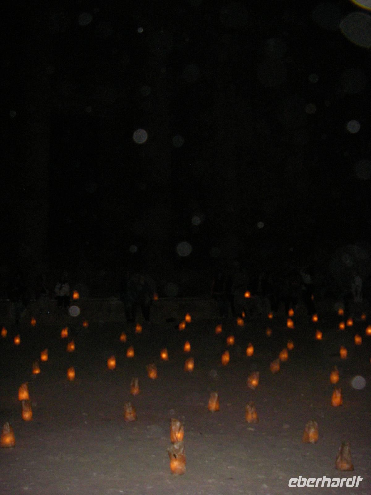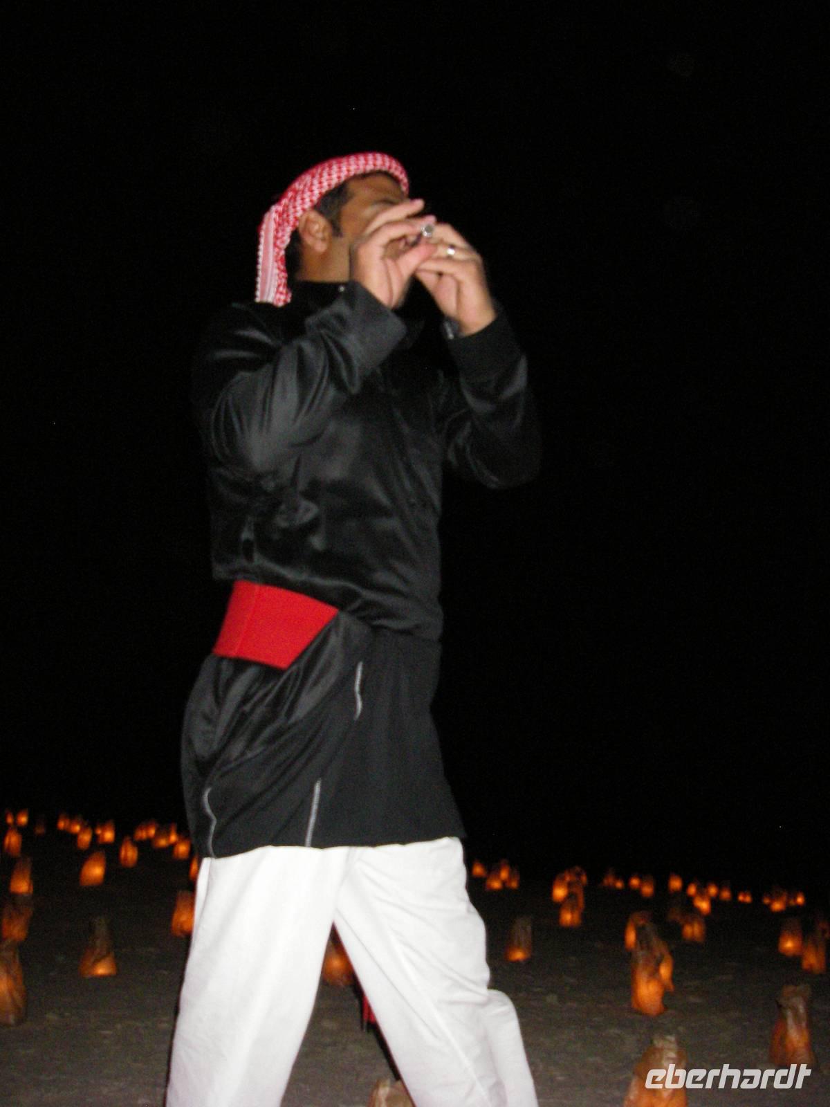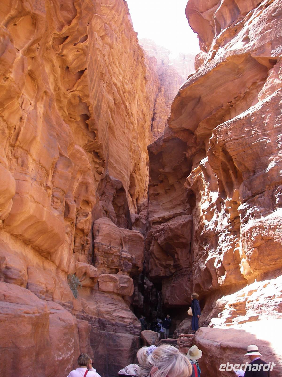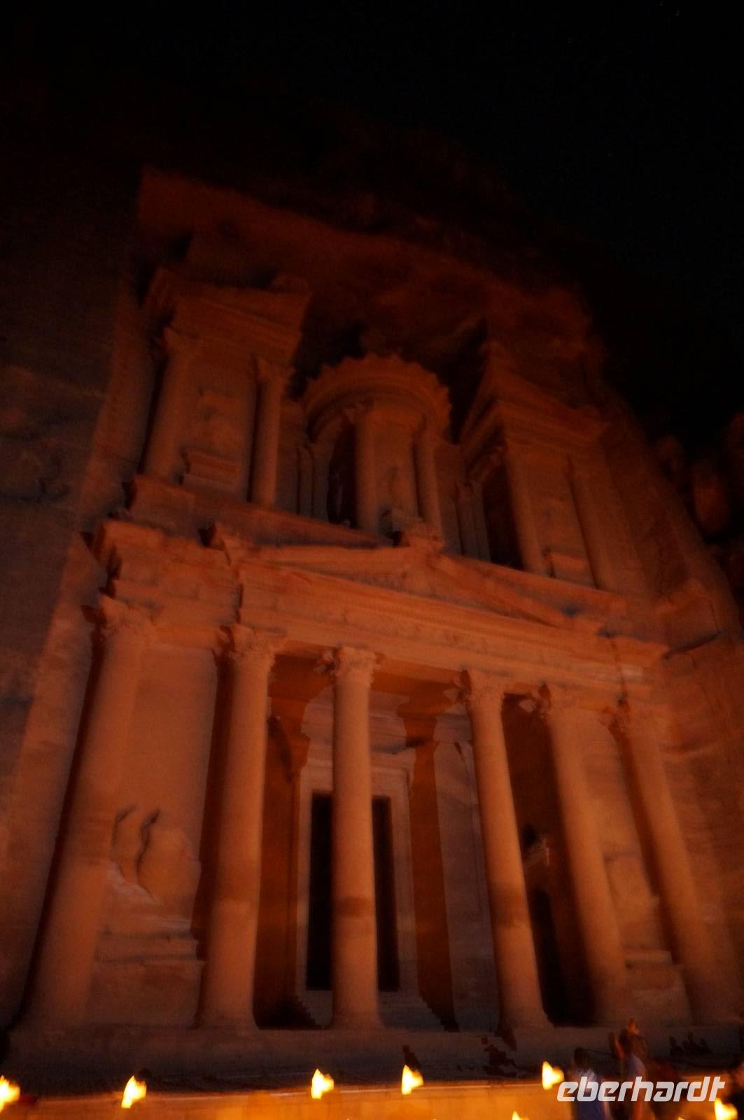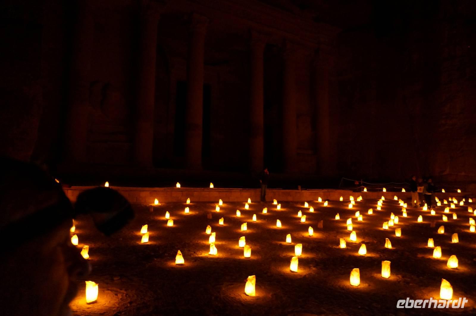 Nun geht es endlich durch den Siq, eine Art Schlucht, welche eine Länge von 1,2 km und eine Höhe von 80 bis 81 m aufweist. Fasziniert von den bizarren Felsformationen, die sich in den unterschiedlichsten Farbtönen darstellen, erreichen wir schließlich das weltberühmte Schatzhaus am Ende des Siqs. Den Namen erhielt dieses Gebäude aufgrund der fälschlichen Annahme, dass sich in der Urne auf der Spitze des Bauwerks ein Schatz eines Pharaos befindet. Eigentlich handelt es sich bei dem Schatzhaus um ein Grab oder aber um einen Tempel, welcher mit einer Höhe von ca. 40 m und einer Breite von ca. 30 m aus einem Fels gehauen wurde. Übrigens von oben nach unten, damit die bereits fertiggestellten Bereiche nicht beschädigt wurden. Nachdem wir unzählige Fotos und auch ein Gruppenbild gemacht haben, laufen wir auf der Fassadenstraße mit den nabatäischen Felsengräbern bis zum Theater. Auch dieses wurde von den Nabatäern errichtet und später von den Römern durch eine Schaubühne erweitert. Nun ist es Zeit für eine Pause. Bei einem leckeren Tee erholen wir uns und lassen die ersten Eindrücke dieser unvergleichlichen Felsenstadt Revue passieren. Dann führt uns der Rundgang zu dem Großen Tempel, welcher eine Fläche von 7000 m² aufweist und wo man anhand der umgestürzten Säulen gut die Spuren der Erdbeben erkennen kann, welche die Stadt Petra zerstörten. Auf der Säulenstraße (Hauptstraße) angekommen, laufen wir durch das Temenostor, wo wir von einer Darbietung Nabatäer-Krieger überrascht werden. Nachdem wir uns den Palast der Pharaonentochter angeschaut haben, führt uns unserer Weg weiter zu der byzantinischen Kirche, die zur Erhaltung der Mosaike überdacht wurde. Schließlich erreichen wir die eindrucksvollen königlichen Gräber, an welchen wir in folgender Reihenfolge vorbeilaufen: Etagengrab, korinthisches Grab, Seidengrab, Urnengrab. Nach diesem doch sehr ausgedehnten und auch anstrengenden Rundgang unter strahlenden Sonnenschein haben wir uns eine Pause verdient. Bei einem kalten Getränk und süßen Bananen entspannen wir im Schatten eines kleinen Cafés. Anschließend begeben wir uns bei einem gemütlichen Spaziergang durch den Siq zurück zum Bus und erreichen am Nachmittag ermattet das Hotel. Nachdem alle nach einer Ruhepause wieder zu Kräften gekommen sind, treffen wir uns zum Abendessen. Hier wartet eine kleine Überraschung auf die Gäste, welche jedem ein Lächeln ins Gesicht zaubert. Dann heißt es für einige Gäste wieder - auf zur Felsenstadt zu unserem Abendausflug Petra bei Nacht. Mit Taxen fahren wir erneut zum Besucherzentrum. Unter den ersten Gästen laufen wir auf dem von Kerzen gesäumten Siq bis zum Schatzhaus. Auch hier stehen hunderte von Kerzen, welche den gesamten Platz und auch natürlich das Schatzhaus beleuchten. Beeindruckt von der großartigen Atmosphäre nehmen wir Platz und warten mit einem Tee in der Hand auf den Beginn der Show. Dann wird es still und ein Araber beginnt auf einer alten Geige zu spielen und ein Klagelied zu singen. Anschließend lauschen wir der Melodie eines Flötenspielers, bevor der Veranstalter dieses Spektakels die Show mit einer Ansprache beendet. Fasziniert von dieser einmaligen Atmosphäre laufen wir durch den Siq zurück zu den Taxen und kommen gegen 23:00 Uhr wieder im Hotel an.
