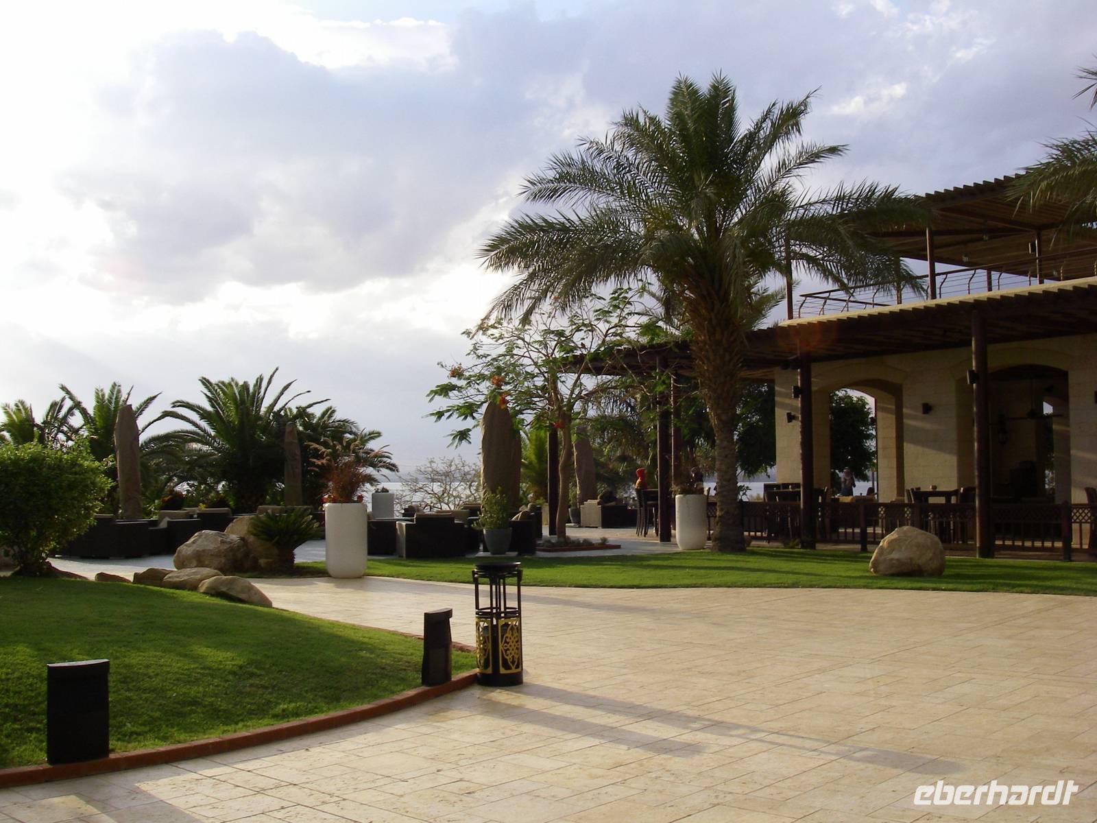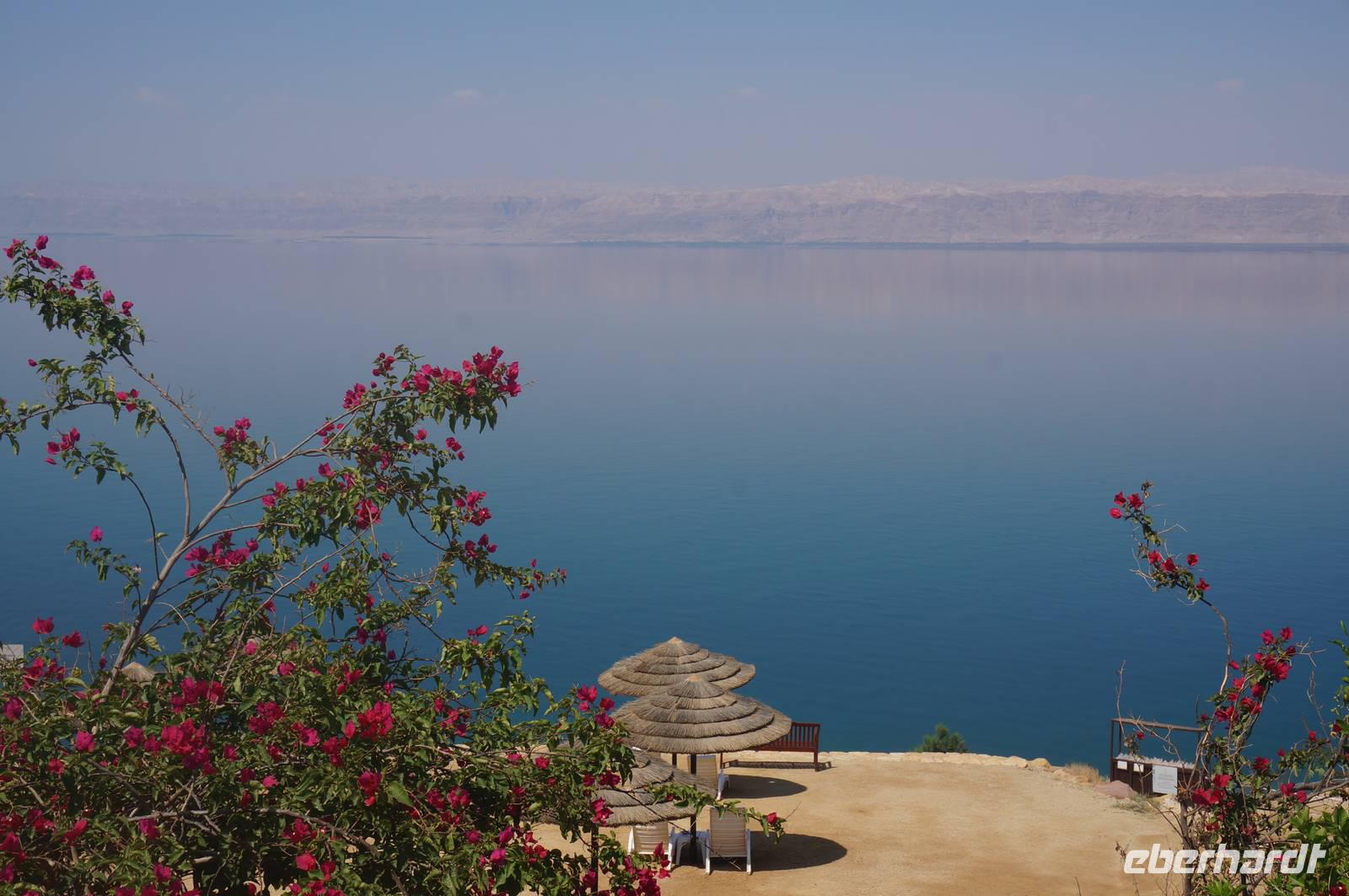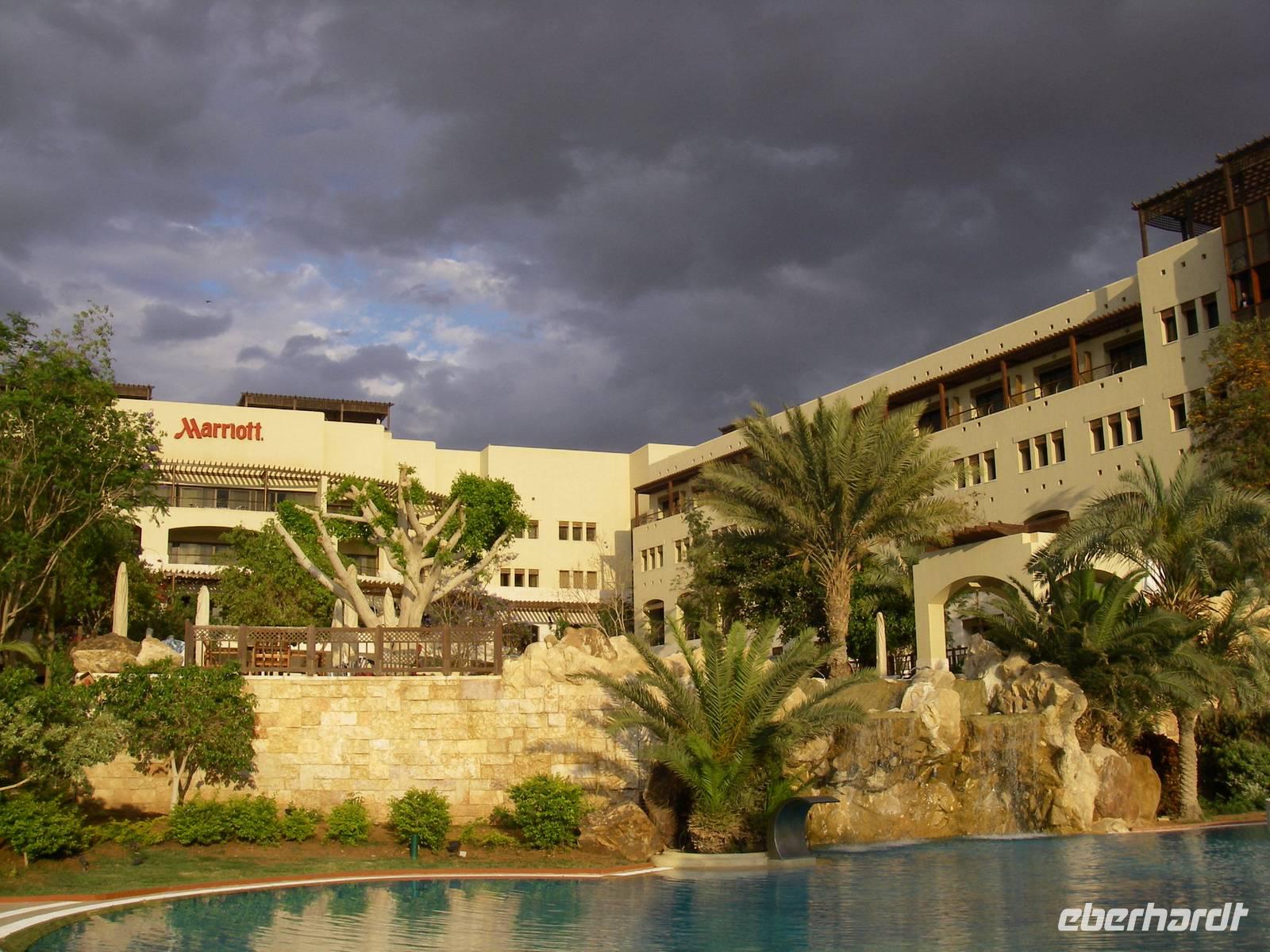 Am Nachmittag erreichen wir unser 5-Sterne-Hotel „Jordan Valley Marriott Resort & Spa", wo wir uns erst einmal von Mahmoud verabschieden und zügig unsere Zimmer beziehen. Das Hotel hat einen direkten Zugang zum Toten Meer, so dass wir uns sofort auf den Weg dorthin machen. Bevor wir uns natürlich in die Wellen stürzen, schmieren wir uns mit dem schwarzen Seeschlamm aus dem Toten Meer, welcher übrigens eine hohe Heilkraft gegen Rheuma und Hauterkrankungen aufweist, ein und gehen anschließend komplett „geteert" ins Meer. Schwebend aufgrund dieses hohen Salzgehaltes genießen wir das einzigartige Erlebnis und kommen anschließend mit Baby weicher Haut aus dem Wasser heraus. Bei unserem gemeinsamen Abendessen tauschen wir unsere Erfahrungen des heutigen Tages aus.