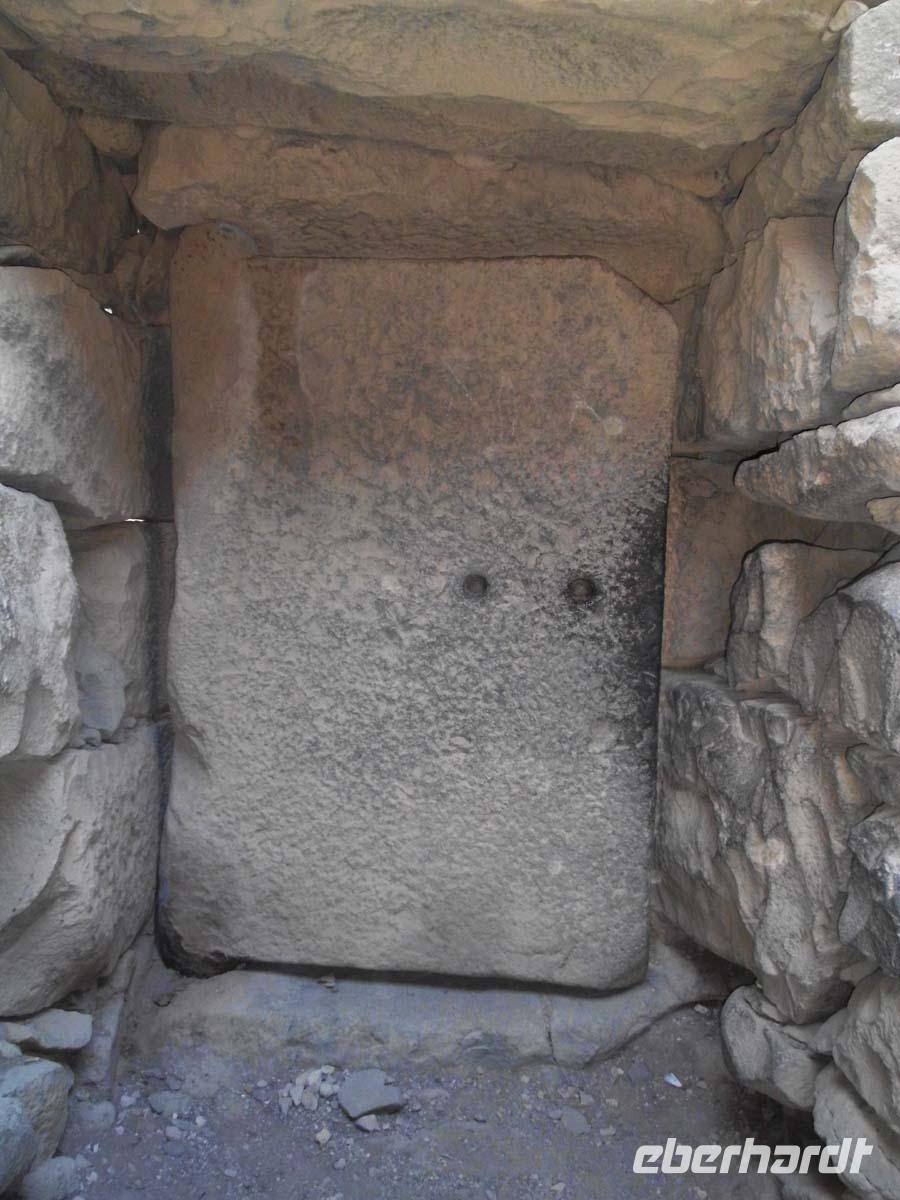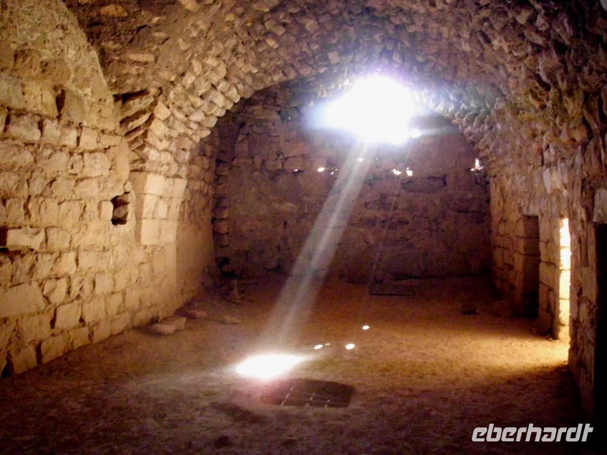 Das nächste Wüstenschloss ist eher ein Schlösschen. Sein Name, Qusair Amra, sagt das auch aus. Die Wände und Decken sind mit zahlreichen Fresken versehen. Dargestellt werden u .a. halbnackte Frauen. Im Islam ist es aber nicht gestattet Menschen abzubilden. So kann man daraus schließen, dass die Arbeiter welchen dieses Schlösschen bauten und gestalteten keine Araber waren. Vermutlich waren es Griechen. Dem damaligen Besitzer hat es aber wohl gefallen, er hat es sich extra als Lustschlösschen bauen lassen. Heute gehört das im Jahre 711 errichtet Schlösschen zum UNESCO Weltkulturerbe. Letzter Besichtigungspunkt für heute ist das Wüstenschloss Qasr al-Azraq. Nur wenige Minuten sind es mit dem Bus bis zum dritten Wüstenschloss. Qasr al-Kharana, ein trutzig in der Landschaft stehendes Bauwerk beeindruckt von außen mit seiner Größe. Normalerweise würde man hier auch nicht von einem Schloss reden. Mahmoud erklärt uns, dass es sich wohl um eine Karawanserei gehandelt hat. Im Innenhof war eine riesige Zisterne zur Versorgung der Kamele mit Wasser. Im Erdgeschoss des Gebäudes befanden sich Stallungen und Lagerräume. Man kann auch recht eindeutig nachweisen, aus welcher Zeit die Anlage stammt. Ein Bewohner hat am 24.11.710 dort übernachtet und ein Graffitti hinterlassen.