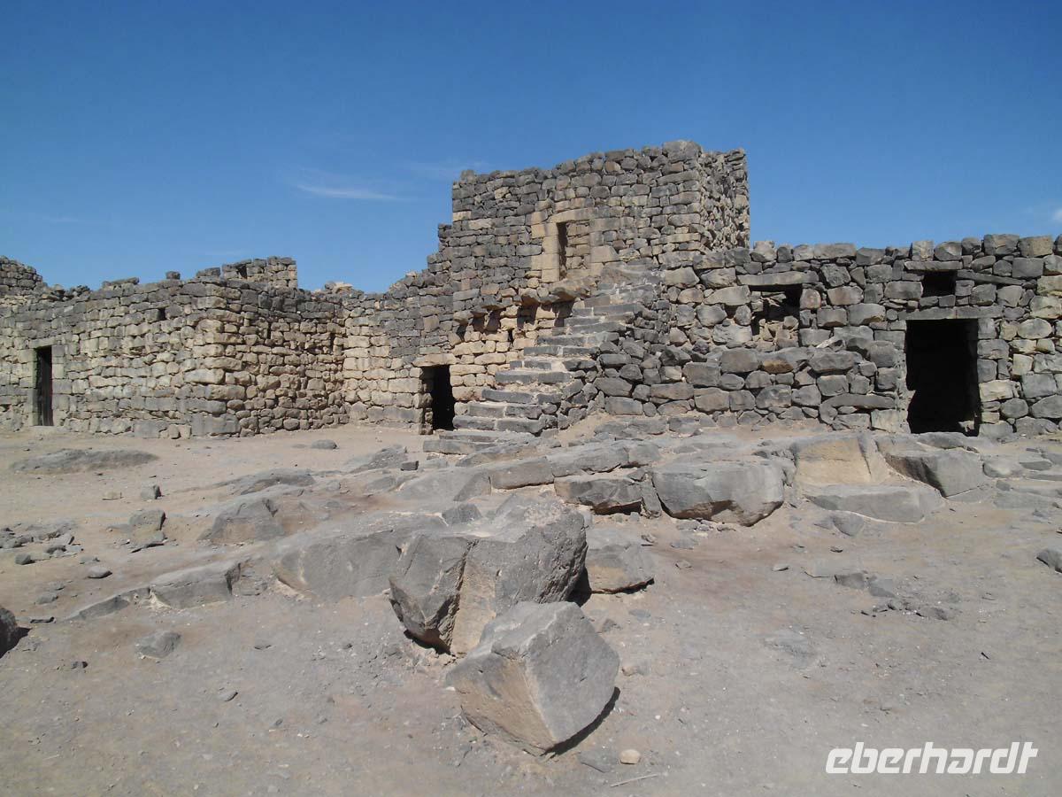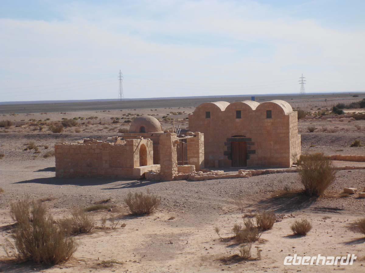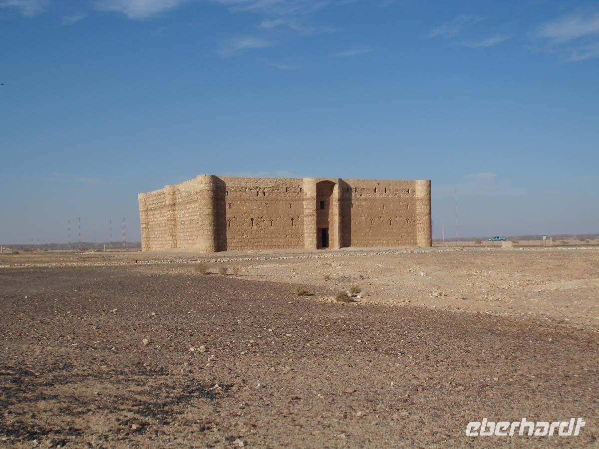 Omajadischen Wüstenschlösser zu besichtigen. Zuerst besuchen wir das Wüstenschloss Qasr al-Azraq. Es ist komplett aus dunklem Basalt errichtet, während alle anderen Wüstenschlösser aus aus Kalkstein gebaut sind. Im Winter 1917/1918 überwinterte Lawrence von Arabien hier. Seine Schildwachen schlossen jeden Abend die drei Tonnen schwere, heute immer noch vorhandene, Tür aus einer Granitplatte ab. 1927 wurde durch ein Erdbeben ein Großteil der Anlage schwer in Mitleidenschaft gezogen. Gleich in der Nähe haben wir die Möglichkeit Mittagspause im Restaurant Kings Castle zu machen. Dabei haben wir die Möglichkeit zum ersten Mal die gute jordanische Küche zu probieren. Unser Giude Mahmoud empfiehlt das Gericht namens „das Umgekippte". Reis, Gemüse und Huhn werden in einem großen Topf gekocht und dann umgestülpt serviert. Schmeckt köstlich.