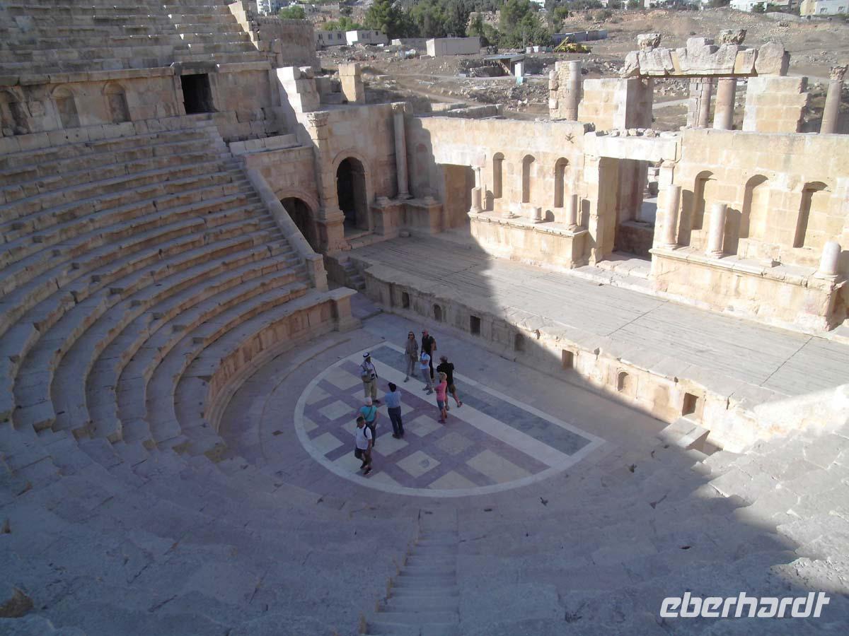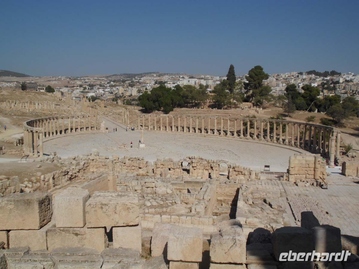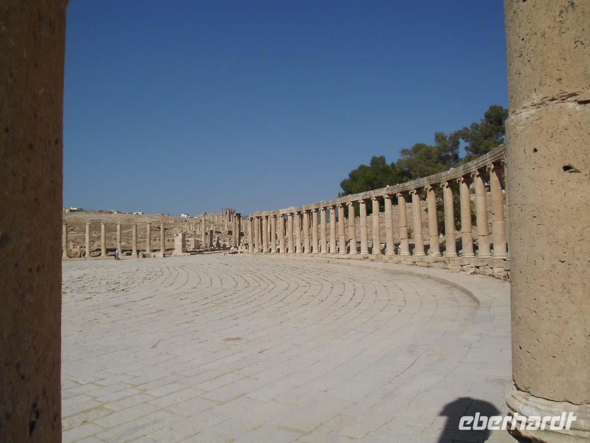 Nach ca. 45 Minuten Fahrt erreichen wir Jerash mit der bedeutendsten römischen Ausgrabung auf jordanischem Gebiet. Kaiser Hadrian rühmte sie „als die Stadt die alle Schönheiten in sich vereint". Und so ließ er sich auch gleich einen Triumphbogen bauen und dazu ein Hippodrom, eine Pferderennbahn. Dort zeigt man, natürlich gegen ein Entgelt, wie die Römer gekämpft haben. Wir lassen uns das nicht nehmen und sehen die Show an. Wir treten nach dem Mittagessen am Südtor in die Stadt ein und gelangen als erstes zum ovalen Platz, so genannt weil er nicht rund ist. Beeindruckend wird er von Säulen umrahmt. Wir besuchen dann das Südtheater, welches sich neben dem Zeustempel befindet. Selten hat man in einer römisch-antiken Stätte noch so viele aufrecht stehende Säulen gesehen. Nach dem Ende des gut zwei Stunden dauernden Rundgangs machen wir uns zurück nach Amman, wo wir den Feierabendverkehr erleben, wo jeder ohne Rücksicht auf Verluste ans Ziel kommen will.