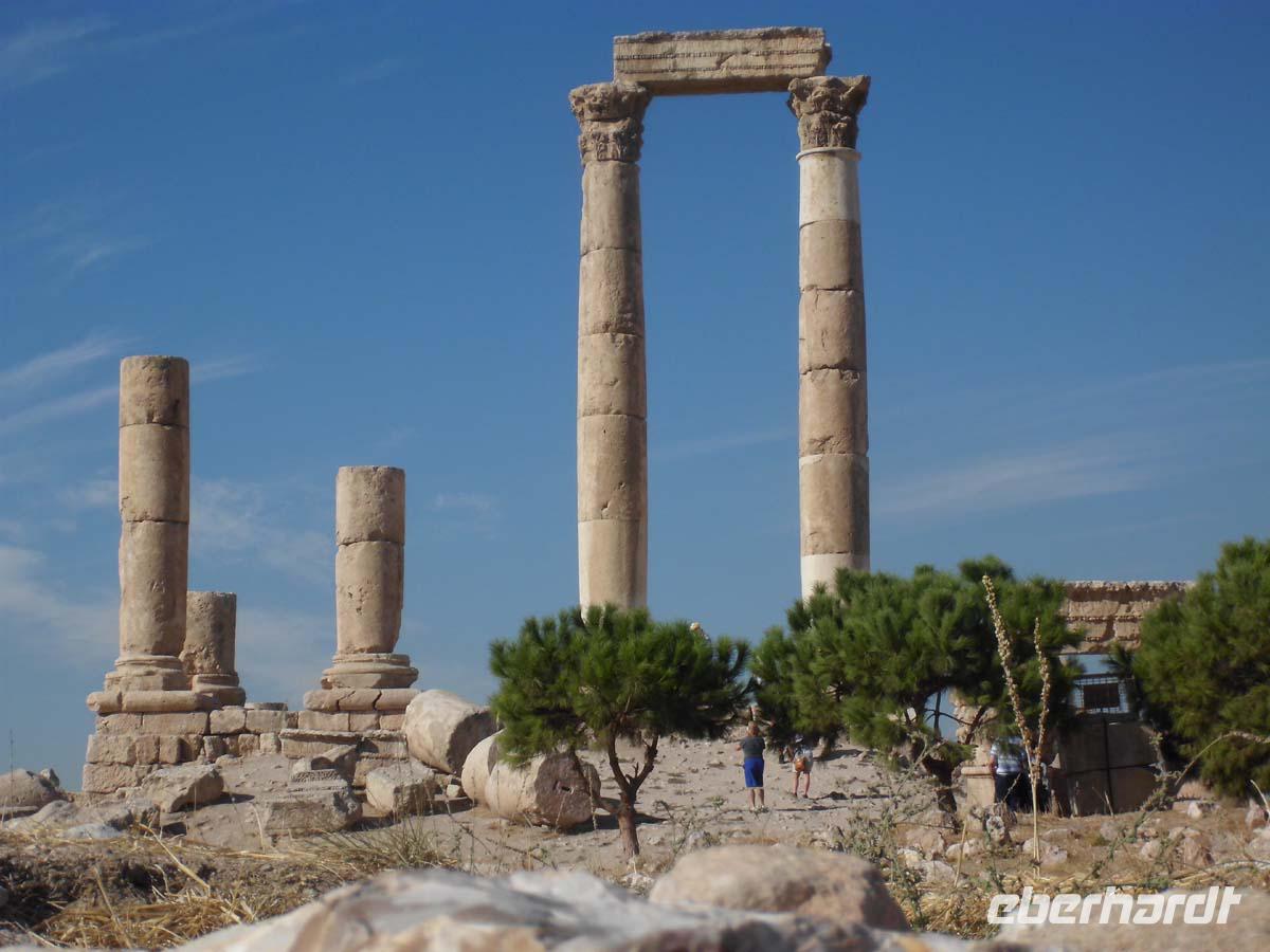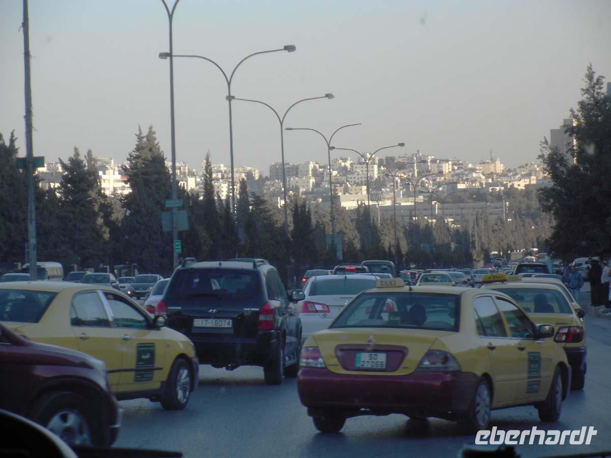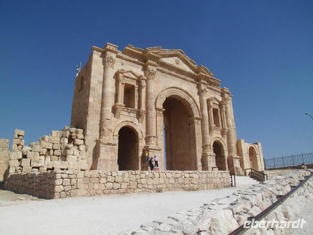 Nach ca. 45 Minuten Fahrt erreichen wir Jerash mit der bedeutendsten römischen Ausgrabung auf jordanischem Gebiet. Kaiser Hadrian rühmte sie „als die Stadt die alle Schönheiten in sich vereint". Und so ließ er sich auch gleich einen Triumphbogen bauen und dazu ein Hippodrom, eine Pferderennbahn. Dort zeigt man, natürlich gegen ein Entgelt, wie die Römer gekämpft haben. Wir lassen uns das nicht nehmen und sehen die Show an. Wir treten nach dem Mittagessen am Südtor in die Stadt ein und gelangen als erstes zum ovalen Platz, so genannt weil er nicht rund ist. Beeindruckend wird er von Säulen umrahmt. Wir besuchen dann das Südtheater, welches sich neben dem Zeustempel befindet. Selten hat man in einer römisch-antiken Stätte noch so viele aufrecht stehende Säulen gesehen. Nach dem Ende des gut zwei Stunden dauernden Rundgangs machen wir uns zurück nach Amman, wo wir den Feierabendverkehr erleben, wo jeder ohne Rücksicht auf Verluste ans Ziel kommen will.