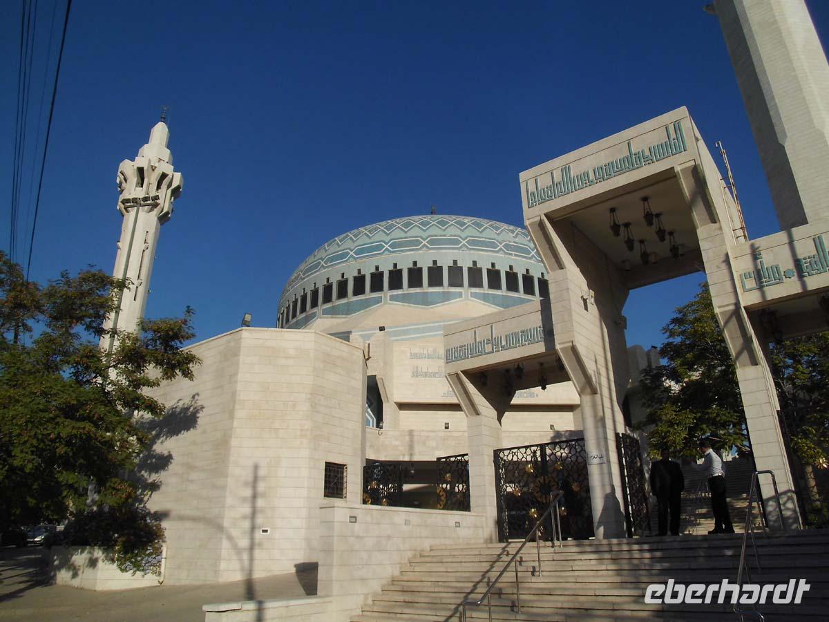 Bevor wir heute aus Amman abreisen besuchen wir noch die größte Moschee des Landes. Die König Abdullah Moschee, benannt nach dem Großvater von König Hussein, welcher am 20. Juli 1951 in der Al Aqsa Moschee in Jerusalem ermordet wurde. Wir betreten staunend den riesigen Raum. Vorher mussten sich jedoch die weiblichen Mitglieder der Gruppe in wallende Kapuzengewänder kleiden, welche die Körperformen total verwischen. Mahmoud erklärt uns hier die Grundlagen des islamischen Glaubens und spricht auch über den Koran. Die Frauen unserer Gruppe besuchen dann auch noch den Gebetsraum für Frauen, wir Männer dürfen da nicht mit hinein, ausgleichende Gerechtigkeit. Aber die Frauen haben die viel schönere Gebetsnische, sehen wir durch die Türe. Auf der anderen Straßenseite befindet sich eine christlich-orthodoxe Kirche, man könnte glatt von einem ökomenischen Beisammensein sprechen. Als wir die Moschee verlassen hören wir das Geläut der Kirche.