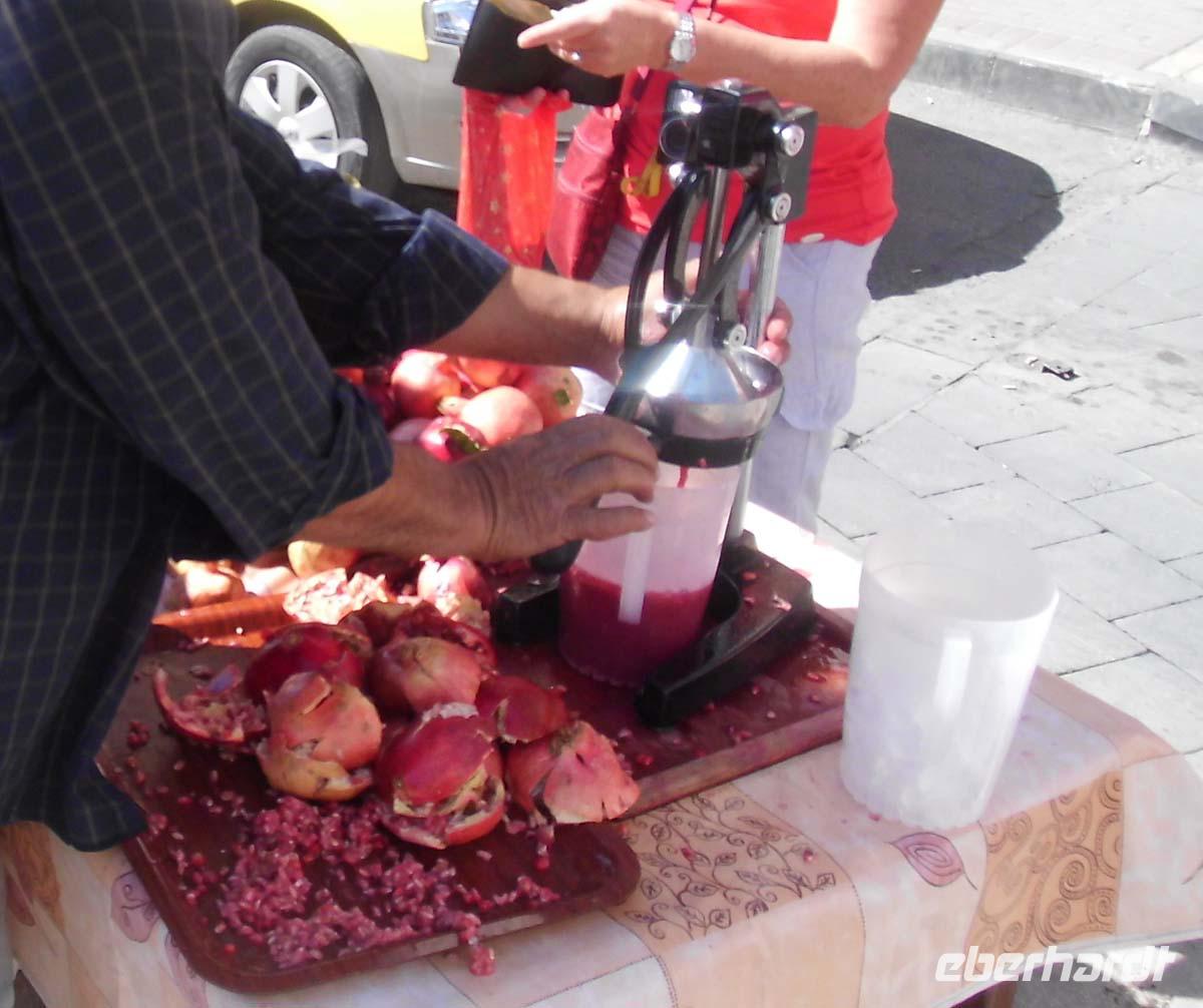 Danach fahren wir zum Berg Nebo. Hier soll Moses das gelobte Land erblickt haben, Betreten konnte er es nicht mehr, da er auf dem Berg starb. Sein Grab wurde bis heute nicht gefunden. Die berühmten Mosaike bleiben uns leider versperrt, weil die Kirche total neu errichtet wird. Alles ist Baustelle. Nur wenige Kilometer entfernt befindet sich die Stadt Madaba, das Zentrum der Mosaikkunst in Jordanien. Das berühmteste Mosaik besichtigen wir in der Kirche St. Georg, eine dreischiffige griechisch-orthodoxe Basilika. Das Mosaik stellt eine Landkarte von Palästina dar und stammt aus dem vermutlich aus der zweiten Hälfte des 6. Jh. Ursprünglich bestand das Mosaik aus 2,3 Mio. Steinen, ein Mosaikleger verarbeitet am Tag ca. 200 der Steinchen. Auf der Karte ist auch das Nil-Delta dargestellt, allerdings in der falschen Fließrichtung, Auf dem Weg zurück zum Bus schmeckt vielen ein frisch gepresster Granatapfelsaft sehr gut. Aber Vorsicht. Die Flecken gehen nie wieder raus, wenn man kleckert.