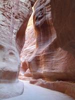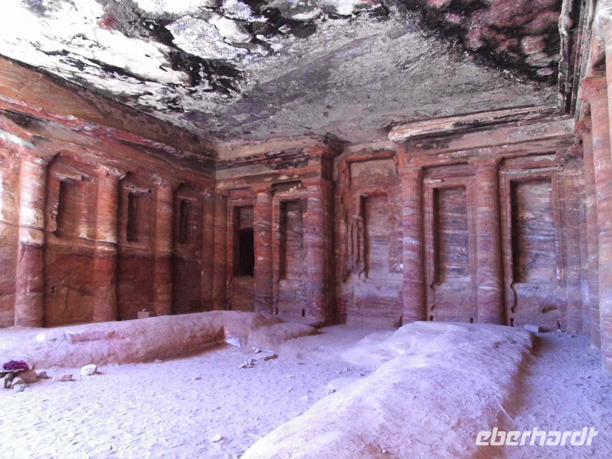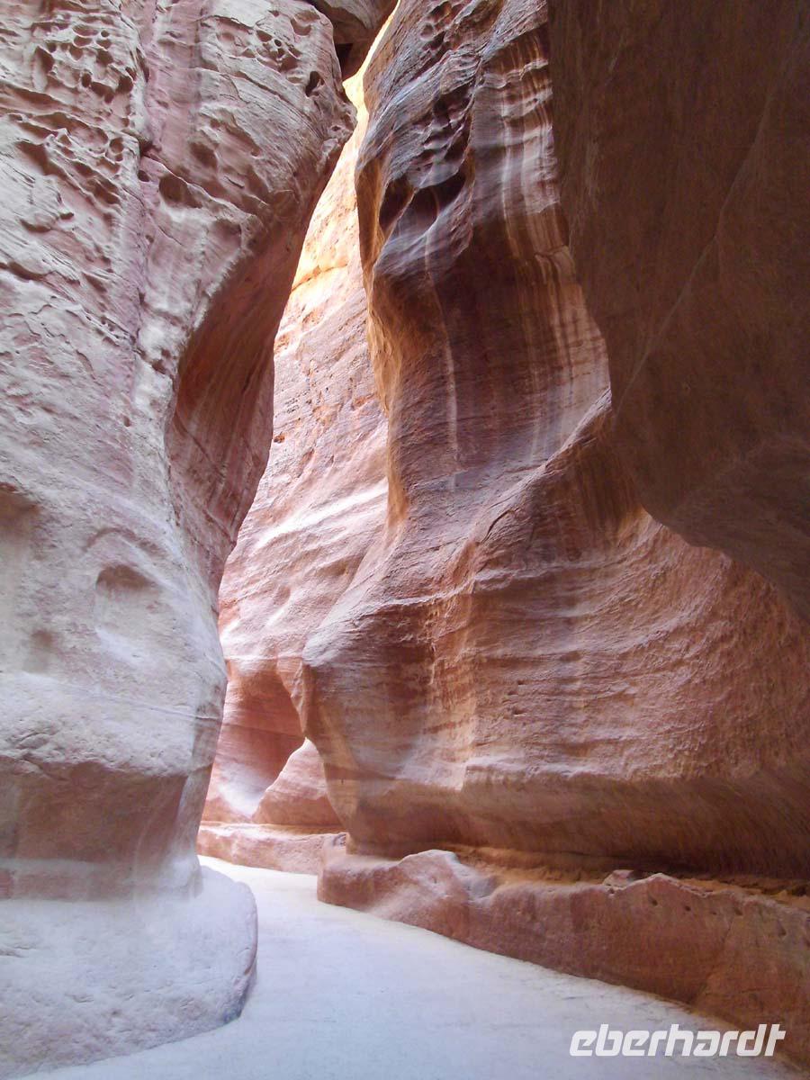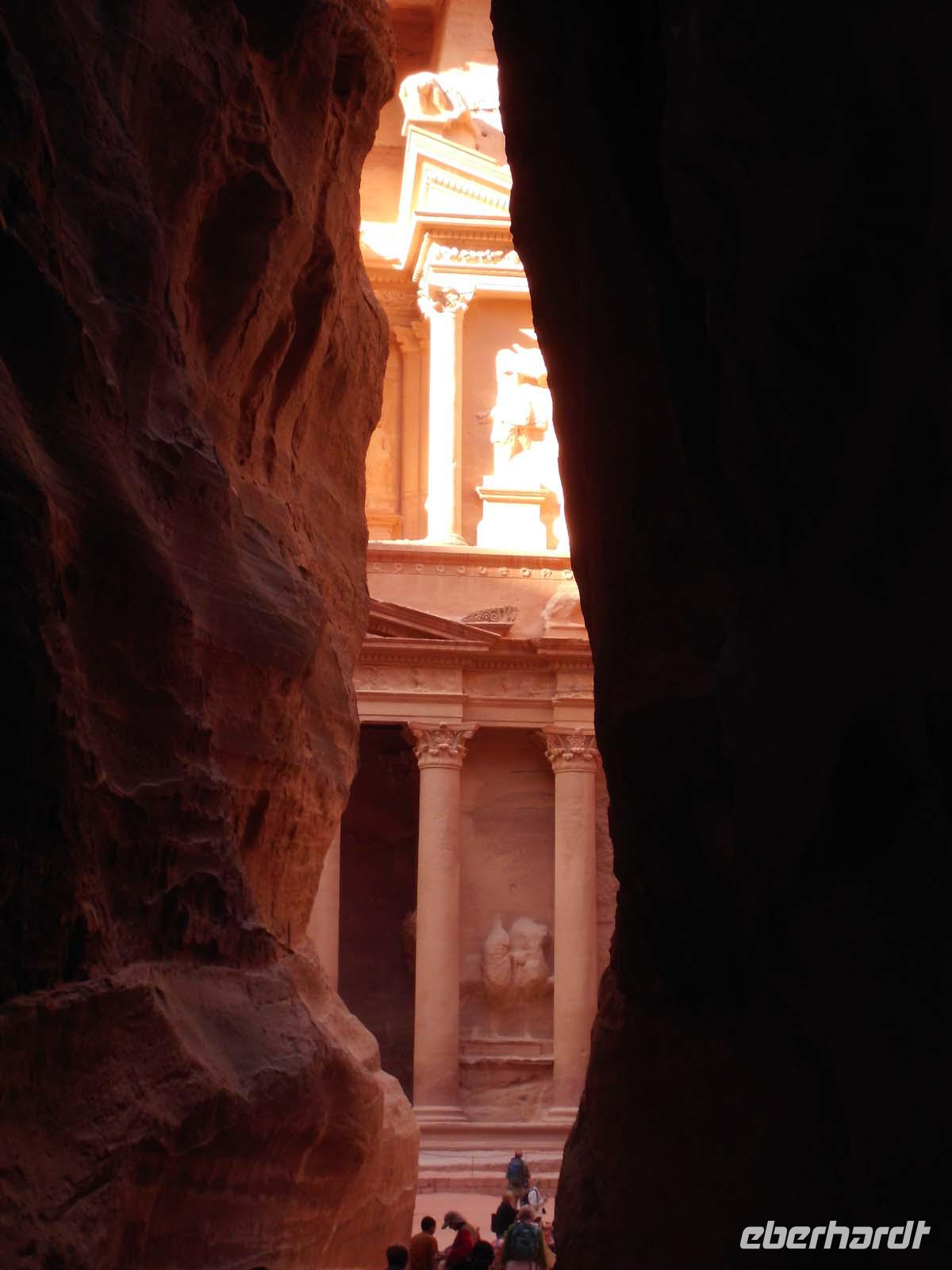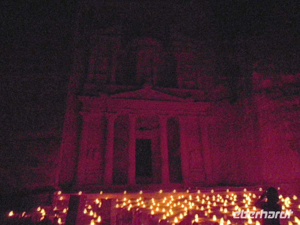 Jetzt steht der absolute Höhepunkt der Reise an. Das Weltkulturerbe Petra. Der Name Petra kommt von Petrus und bedeutet Felsen, wie mein Name und auch ein Reisegast trägt diesen Namen in weiblicher Form. Vom Visitor Center laufen wir bis zum Eingang des Sik, dabei kommen wir, sozusagen zur Einstimmung, an drei Blockgräbern vorbei. Die Nabatäer lebten ab dem 4. Jh. v. Chr. in dieser Gegend. Ursprünglich waren sie ein Nomadenvolk, entwickelten sich im Laufe der Zeit aber zu wichtigen Händlern von Luxusgütern auf der Weihrauchstrasse. Zugleich waren sie auch hervorragende Wasserbauingenieure. Das letzte Mal hörte man von den Nabatäern im Jahre 328, wie eine aramäische Inschrift belegt.Danach verliert sich ihre Spur im Dunkeln, es wird angenommen, dass sie von den Römern assimiliert wurden. Wiederentdeckt wurde der Ort erst zu Beginn des 19. Jh. unter kuriosen Umständen durch den Schweizer Orientalisten Johann Ludwig Burckardt. Aber nun geht es endlich durch den Siq, einem Canyon, 1,2 km lang, an der schmalsten Stelle nur 2 m breit. Die bizarren Sandsteinformationen in ihren unterschiedlichen Farbtönen sind ein faszinierendes Erlebnis. Dann ist es soweit und der Ausgang des Siq ist erreicht. Jetzt machen wir alle das berühmteste Foto von Jordanien, wir fotografieren das Schatzhaus. Wir sind in einer Nekropole, einem Bestattungsbezirk, der uns auch noch die nächsten 2 km begleiten wird, bevor wir in die eigentliche Stadt kommen. Wir sind in einer Stätte angekommen, wo die Zeit vor 1700 Jahren stehen geblieben ist. Nach der Besichtigung tun allen die Füße weh. Nach dem Abendessen wartet, fakultativ, noch ein besonderer Höhepunkt auf uns, Petra bei Nacht. Wir fahren mit Taxis bis zum Visitor Center und laufen dann auf dem mit Kerzen beleuchteten Weg durch den Sik bis zum Schatzhaus. Weil wir keine Lust haben uns auf den Boden zu setzen, haben wir durch Mahmoud abgesprochen dass wir Bänke bekommen. Der ganze Platz vor dem Schatzhaus ist ebenfalls mit Kerzen beleuchtet. Nach einer Weile des Wartens, in der noch Gäste eintrafen, wurde es ganz still. Zuerst spielte ein Beduine auf einer Rabarb, einer Art Urvioline und sang dazu. Danach spielte vor der Fassade des Schatzhauses ein Flötenspieler. Die nur von offenen Leuchten bestimmte Atmosphäre hat etwas einzigartiges. Nach einer dreivierte Stunde, die wir im Flug vergeht machen wir uns wieder auf den Heimweg.