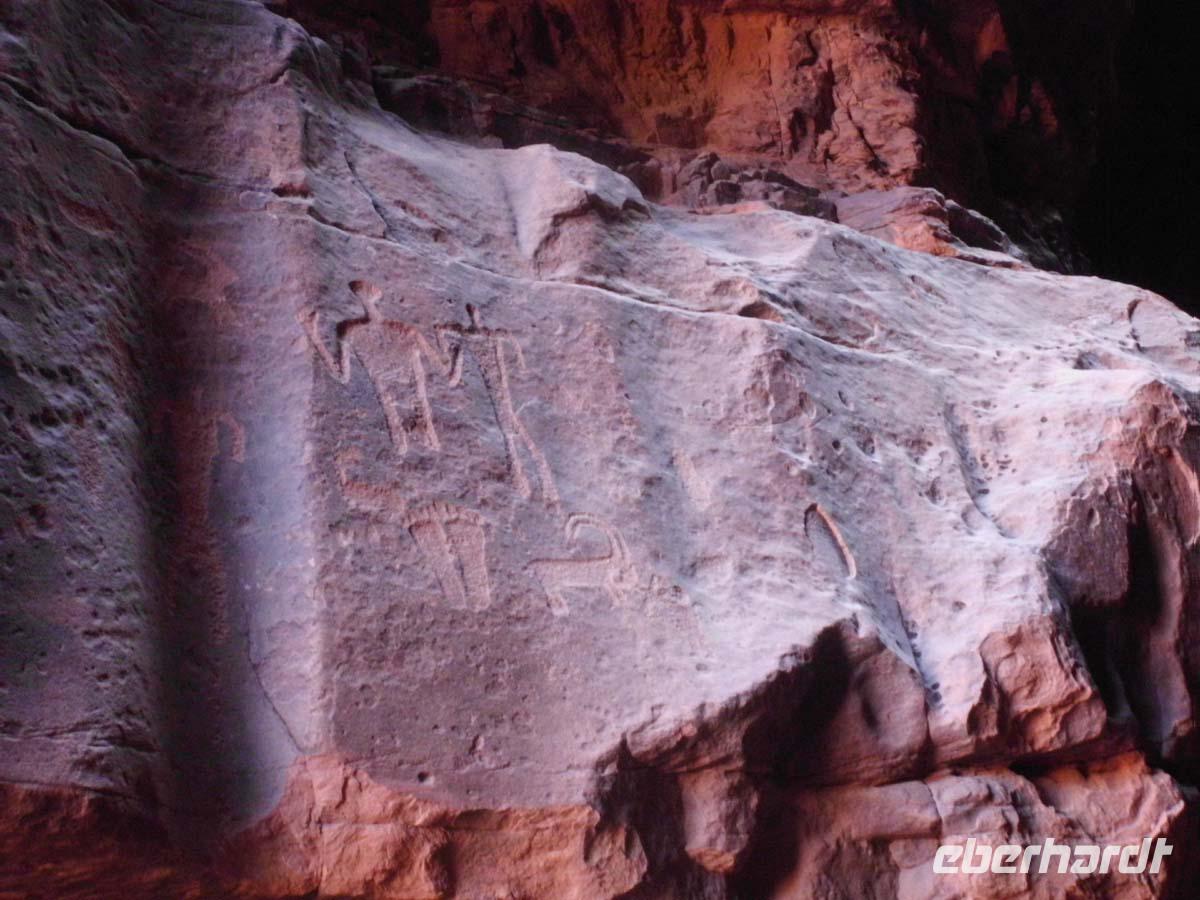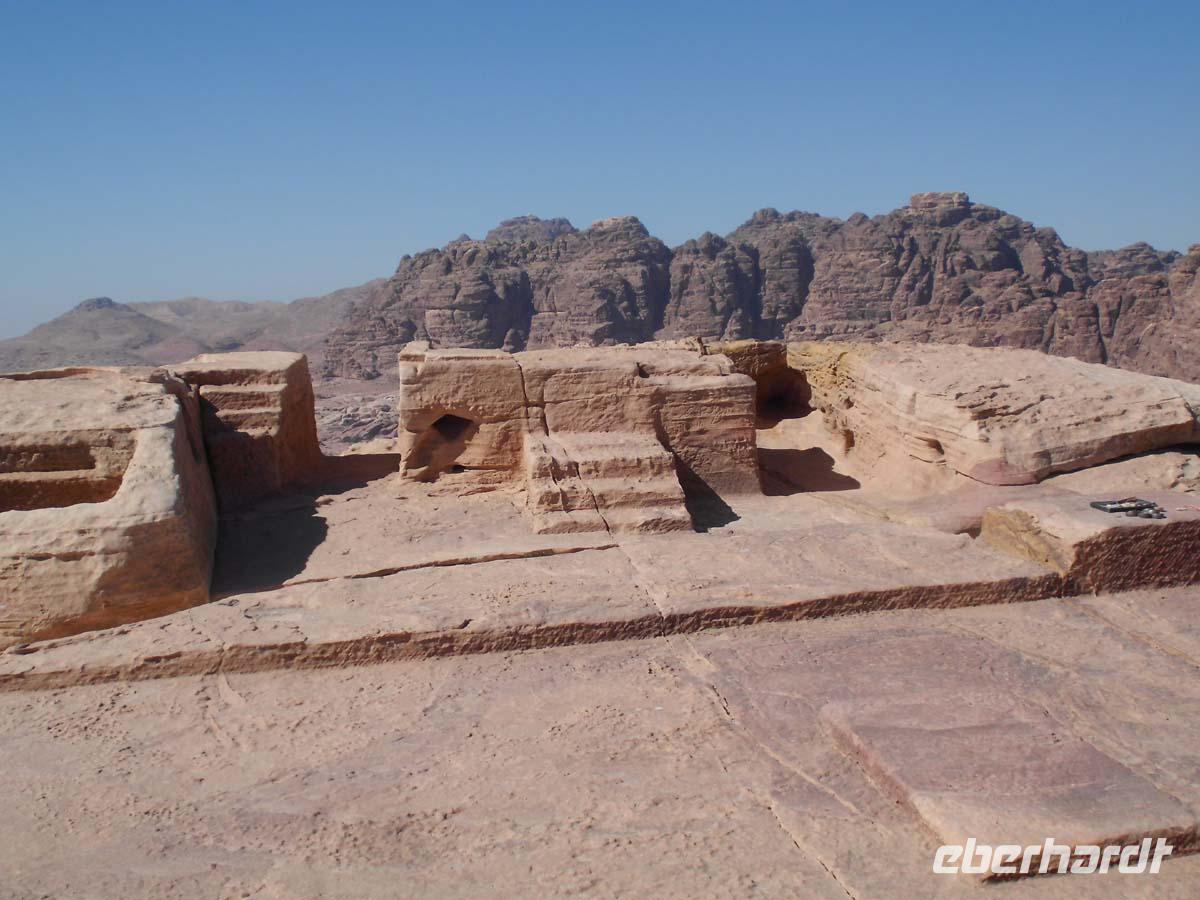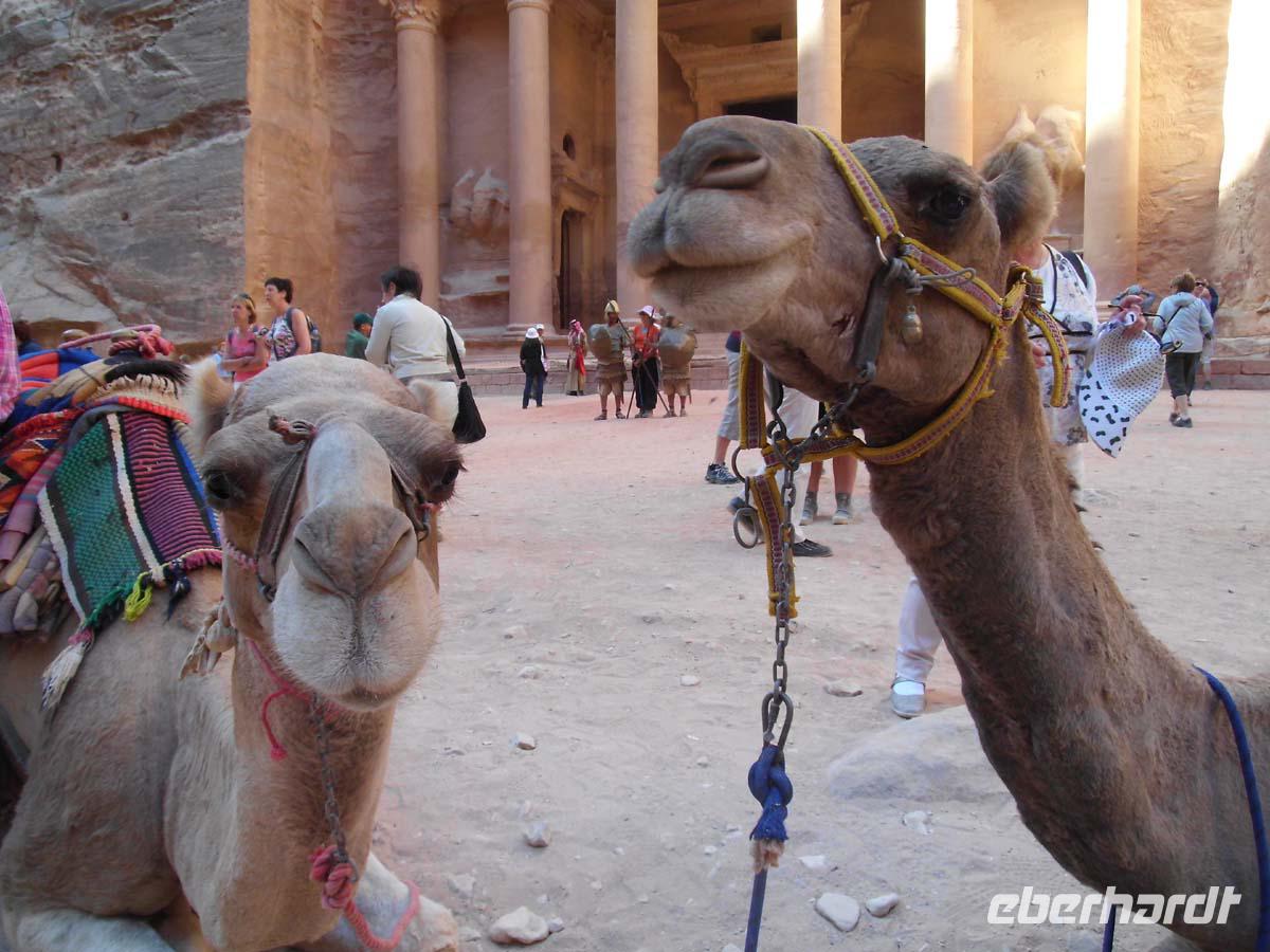 Nach dem reichhaltigen Frühstück begeben wir uns nochmals nach Petra. Der Aufenthalt heute ist zwar individuell, doch nehmen alle dankbar Mahmouds Angebot an, heute auf den Opferplatz über der Stadt zu gehen. Zunächst jedoch geben auf der Post alle ihre Ansichtskarten ab und man kann hier auch noch einmal Geld tauschen. Für Gäste, denen von gestern noch die Knie weh tun, gibt es die Möglichkeit, mit einer Pferdekutsche durch den Siq bis zum Schatzhaus zu fahren. Und auch bis zum Opferplatz, zu dem es 800 Stufen hinauf geht, kann man sich einen Esel mieten. Die Aussicht von hier oben auf die Nekropole und die Wohnstadt ist überwältigend. Erst von hier oben, wo heute ein starker Wind weht, kann man die riesige Ausdehnung der alten Stadt erfassen. Als Rückweg nehmen wir eine andere Strecke, abseits des Haupttouristenpfads. Auch hier kommen wir noch einmal an den prächtigsten Gräbern vorbei und sehen bunte Sandsteinformationen, die wie gemalt aussehen. In der Nekropole begeben wir uns zu einer wohlverdienten Pause wieder in das Cafe, in dem wir auch gestern schon geminzten Tee, oder Fruchtsäfte und den türkischen Kaffee genossen haben. So ausgeruht machen wir uns langsam auf den Rückweg und kommen zu dem Ergebnis, das die heutigen Eindrücke denen von gestern in keiner Weise nachstehen. Beim reichhaltigen Abendmenü in unserem Hotel beschließen wir den zweiten Tag in Wadi Musa, wie die Stadt nahe des antiken Petra heißt.