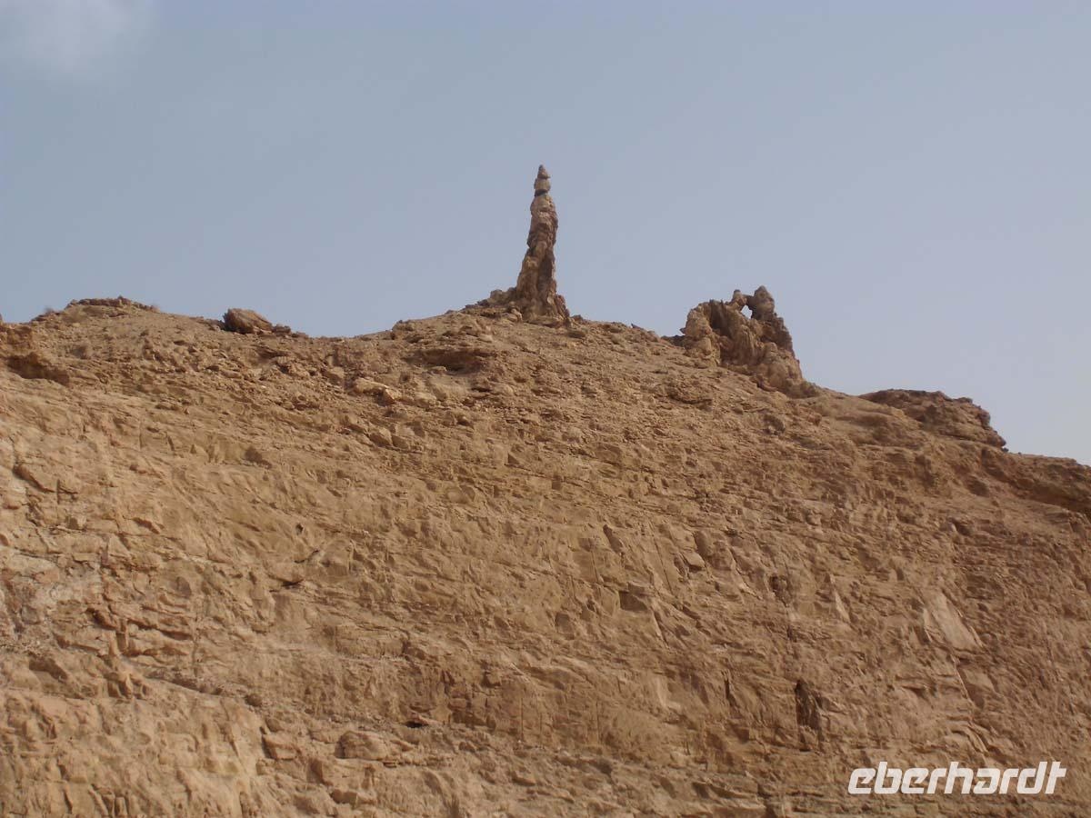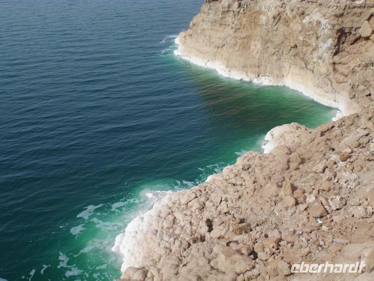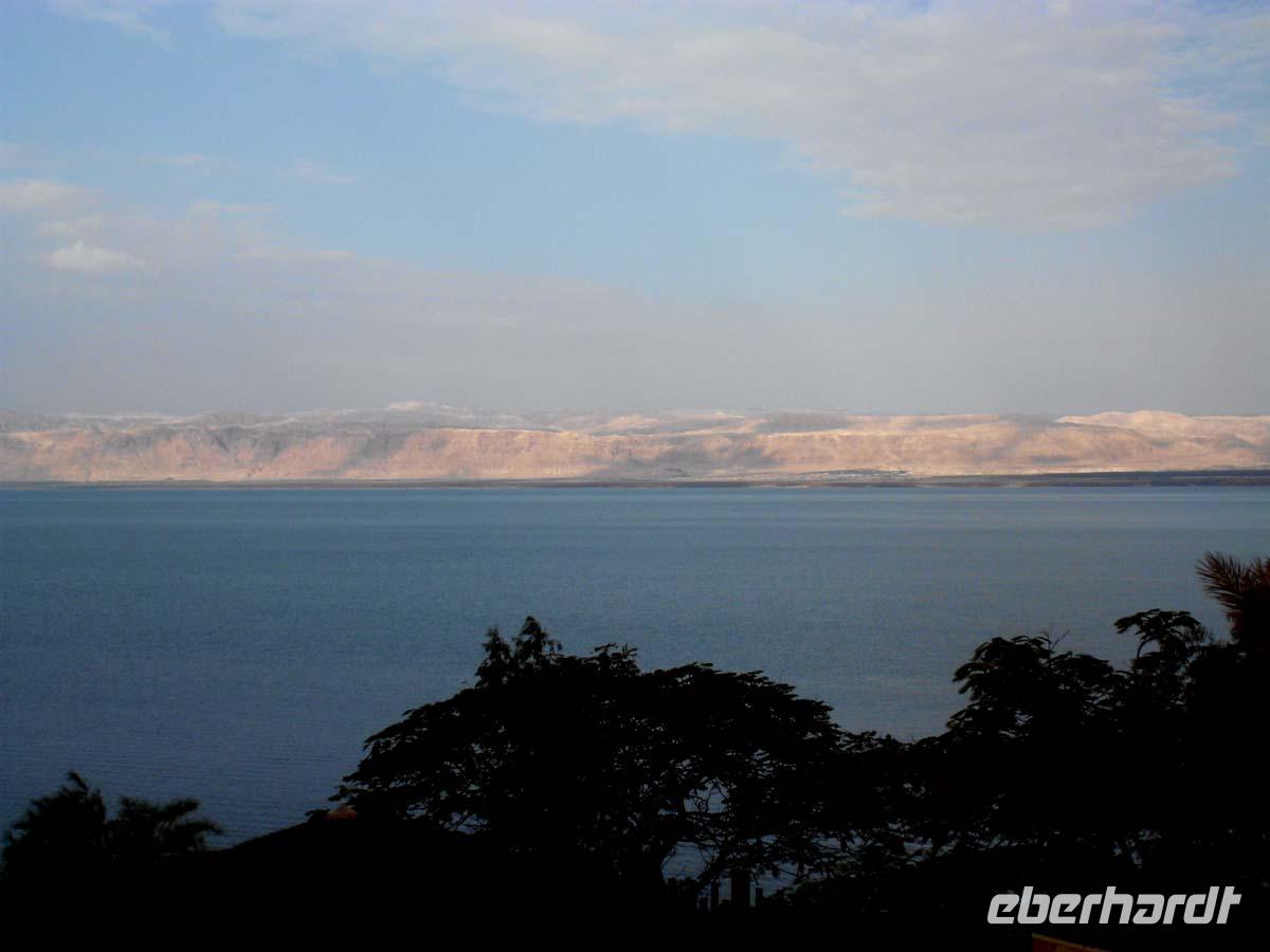 Heute können wir ausschlafen. Am späten Vormittag reisen wir ab nach Norden und fahren Parallel zur Israelischen Grenze zum Toten Meer. Es geht durch das Wadi Aqaba. Hier begegnet uns eine Art Halbwüste, die mit wilden Akazien überwuchert ist. Hin und wieder passieren wir Beduinenzelte, die in einigem Abstand zur Straße errichtet sind. Am Nachmittag kommt dann das Tote Meer in Sicht. Wir machen gleich einen Photostop. Das Gewässer bildet die Fortsetzung des Ostafrikanischen Grabenbruchs und ist so tief abgesunken, dass wir uns plötzlich über 400 m unter dem Meeresspiegel wiederfinden. Die Luft hier ist dementsprechend Sauerstoffreich. Gespeist wird es nur vom Wasser des Jordans. Dem wird aber so viel Wasser entnommen, dass er das Meer nicht mehr auffüllen kann und der Wasserspiegel jedes Jahr um fast einen Meter sinkt. So steigt auch der Salzgehalt immer weiter und liegt derzeit bei 33 Prozent. Das ist dreimal mehr als in allen anderen Meeren. Wir erkennen das bei dem zweiten Halt. Dicke Salzkrusten bilden hier verschiedenfarbig die Uferlandschaft. Gegenüber ragt eine Steinsäule einsam in die Luft. Es soll sich um die zur Säule erstarrte Frau von Lot handeln. Sie hatte sich entgegen des Verbots umgedreht, um den Untergang von Sodom und Gomorrha zu sehen und bekam so ihre Strafe. In der Bibel erstarrt sie jedoch zur Salzsäule. Unstillbare Neugier hat sich noch nie ausgezahlt. Nun erreichen wir das Hotel und nachdem wir Mahmoud verabschiedet haben, treffen wir uns einige Zeit später am Strand, um das schwerelose Gefühl bei einem Bad in der Salzlauge zu erleben. Man sollte jedoch nur maximal 10 Minuten drin bleiben und sich gut abduschen. Auch in die Augen, Mund und Nase sollte das Wasser nicht kommen, denn es brennt sehr stark. Aber man muss es mal erlebt haben, wenn man schon mal hier ist. Man kann tatsächlich nicht unter gehen! Unser Hotel hat 5 Sterne und jeder Wunsch scheint einem von den Lippen abgelesen zu werden. Wir merken das auch an dem überbordenden Abendbüffet mit erlesenen Speisen, die man alle gar nicht durchprobieren kann. Zufrieden sinken wir in unsere Betten.