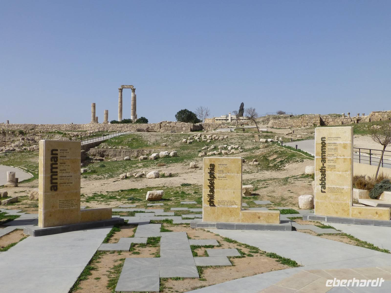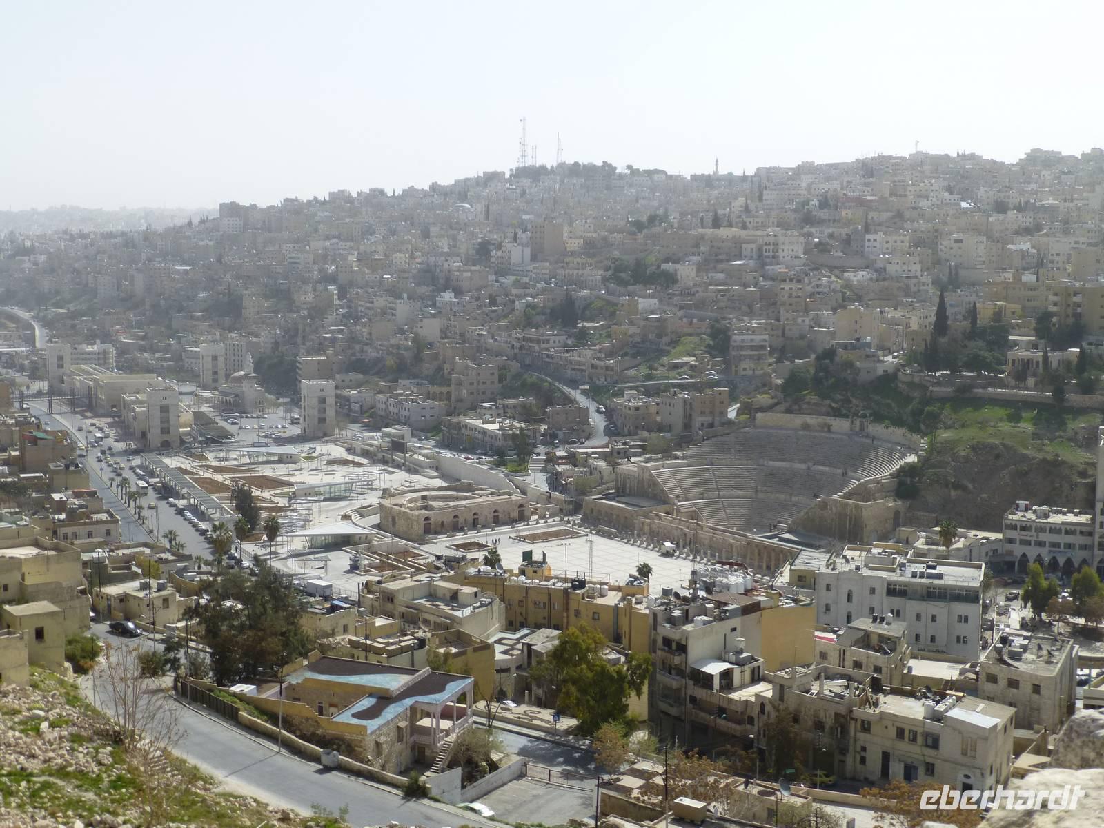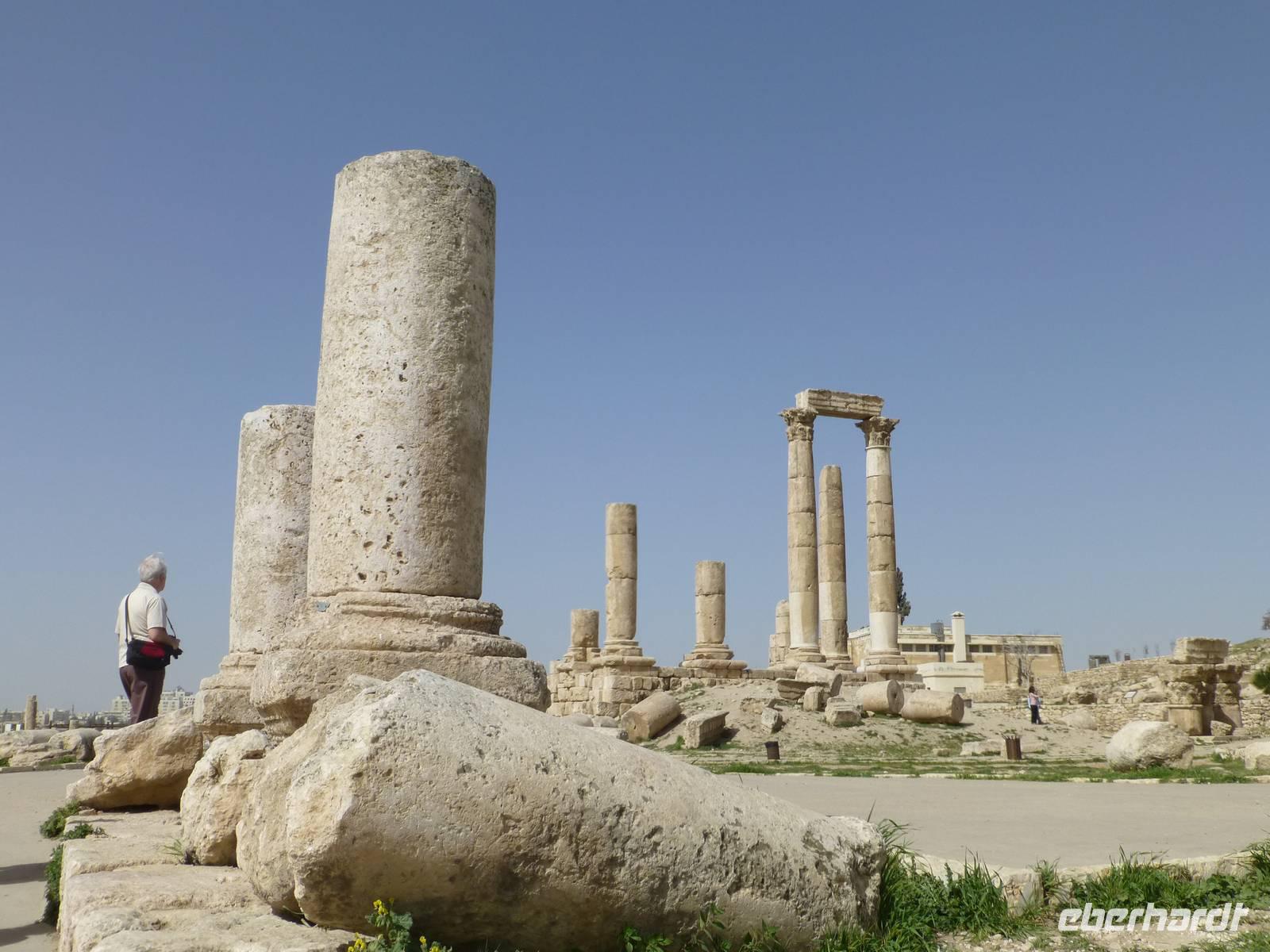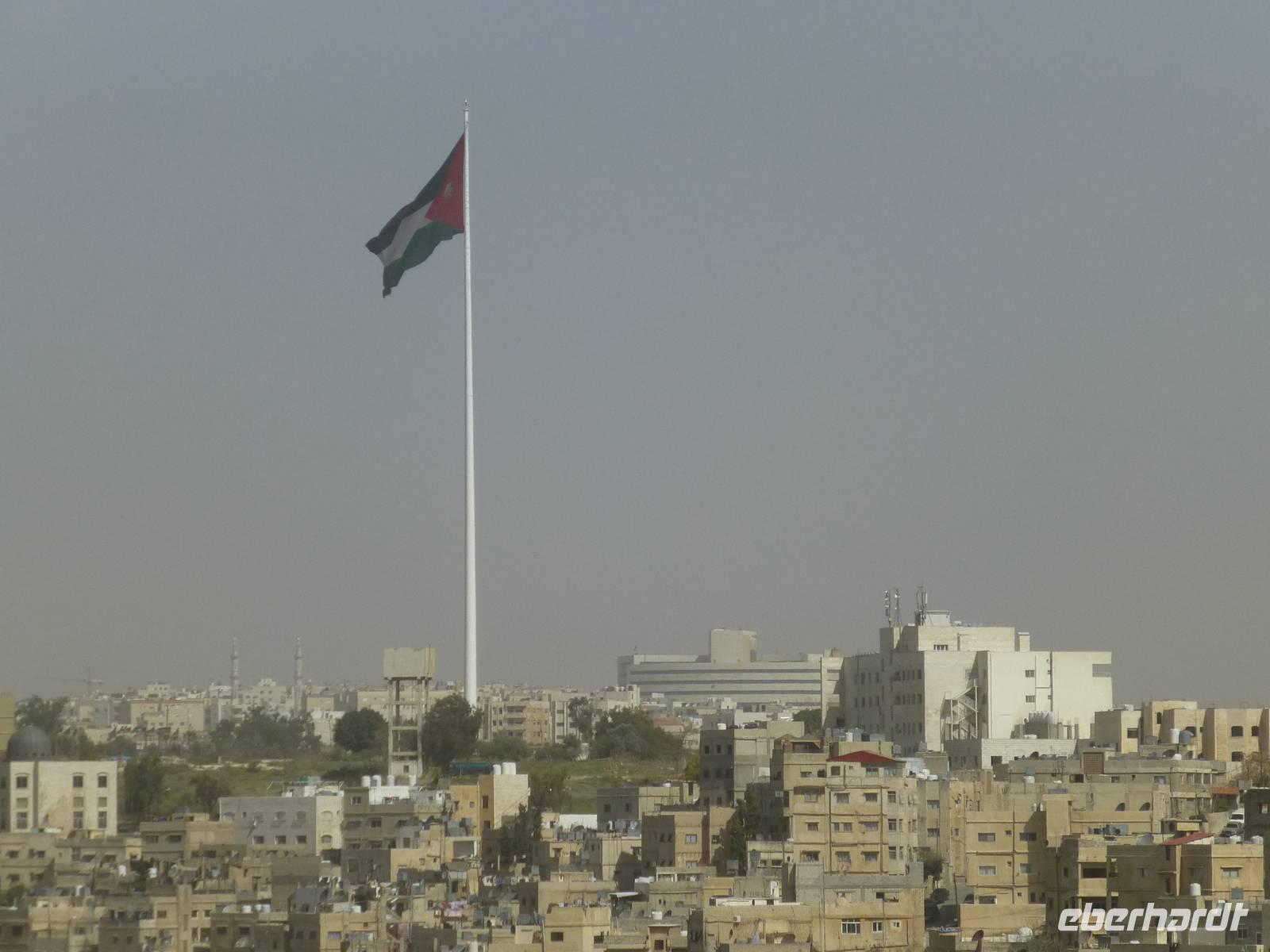 Bereits von Dresden aus fliege ich schon einigen Gäste, in Frankfurt treffen sich dann alle unser Gruppe am Abfluggate. mit einer kleinen Verspätung startet der Flug nach Jordanien. Als wir in Amman, der Hauptstadt von Jordanien, ankommen ist es bereits kurz nach Mitternacht. Das Abfertigungsgebäude ist neu gebaut und seit einem Jahr in Betrieb. Nach einer unkomplizierten und schnellen Einreise fahren wir die 32 km vom Flughafen zu unserem Hotel nach Amman. Am Flughafen begrüßt uns auch unser Reiseleiter Mahmoud. Auf dem Weg zur Stadt bekommen wir bereits erste Informationen zu Jordanien. Allerdings sind wir alle ziemlich müde und können die Dinge wohl nicht mehr richtig aufnehmen. Kurz vor 2 Uhr sind wir dann alle zufrieden in unseren Zimmern im Hotel Regency Palace, einem 5 Sterne Hotel im Zentrum Ammans.Nach einem späten Frühstück beginnt für uns der erste Besichtigungstag. Wir fahren zuerst etwas durch die Neustadt Ammans um danach die Zitadelle von Amman zu besuchen. Von dort oben haben wir eine gute Aussicht über die Stadt. Wir bekommen eine Menge zur Geschichte erklärt und besuchen das Archelogische Museum mit verschiedenen Funden aus Jordanien. So erfahren wir, dass die heutige Stadt Amman die erste auf der Welt war, welche den Namen Philadelphia trug. Benannt wurde sie so nach dem ägyptischen Herrscher Ptolemäus II Philadelphos. Von der Zitadelle aus sehen wir auch den größten Fahnenmast der Welt. Er ist 126,8 m hoch. An ihm weht die Jordanische Fahne mit den stolzen Maßen von 60 x 40 m. Von weiten sehen wir auch den königlichen Palast von Amman, welcher aber nur zu offiziellen Anlässen benutzt wird. Der König, Abdulla II und seine Frau Ranja, wohnen mit ihren 4 Kindern einige Kilometer außerhalb des Stadtzentrums. In Jordanien übt der König die absolute Macht aus, nicht wie in vielen andern Königreichen wo der König nur eine repräsentative Aufgabe hat.