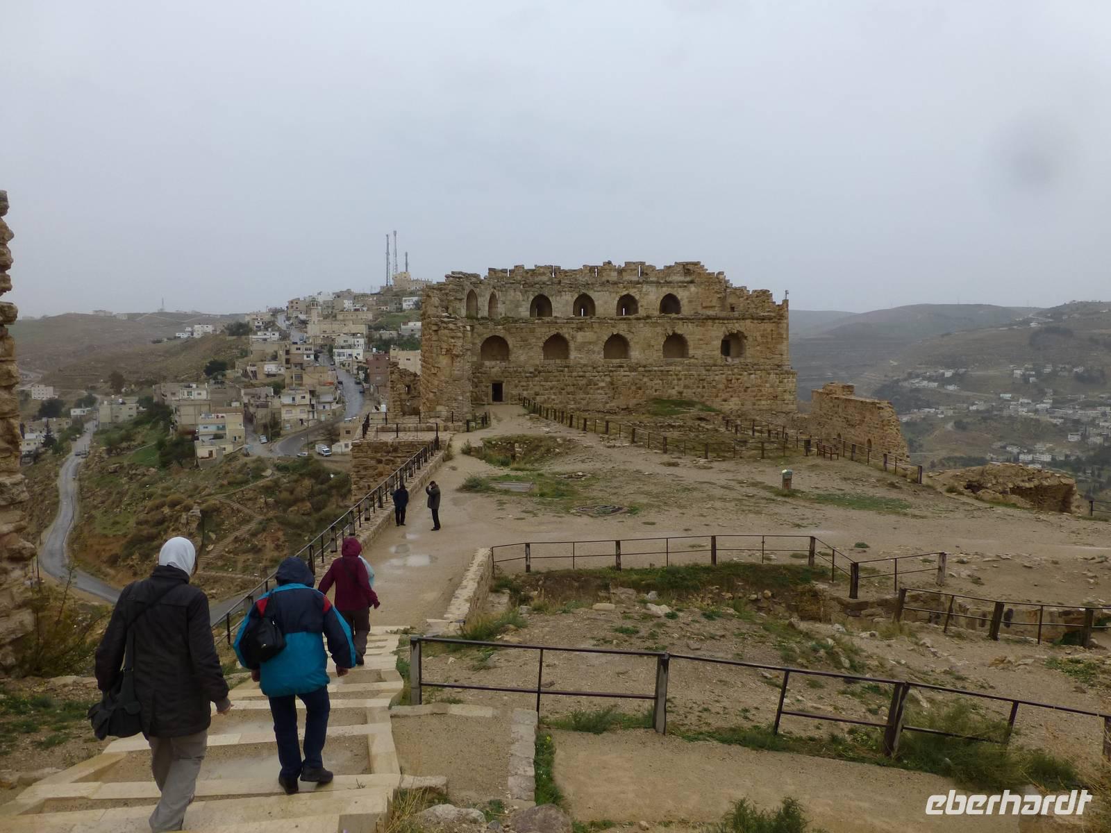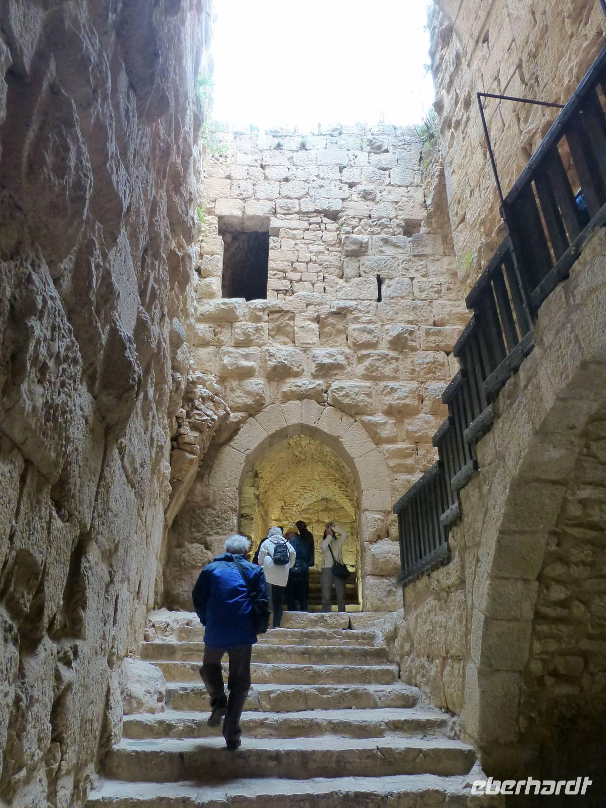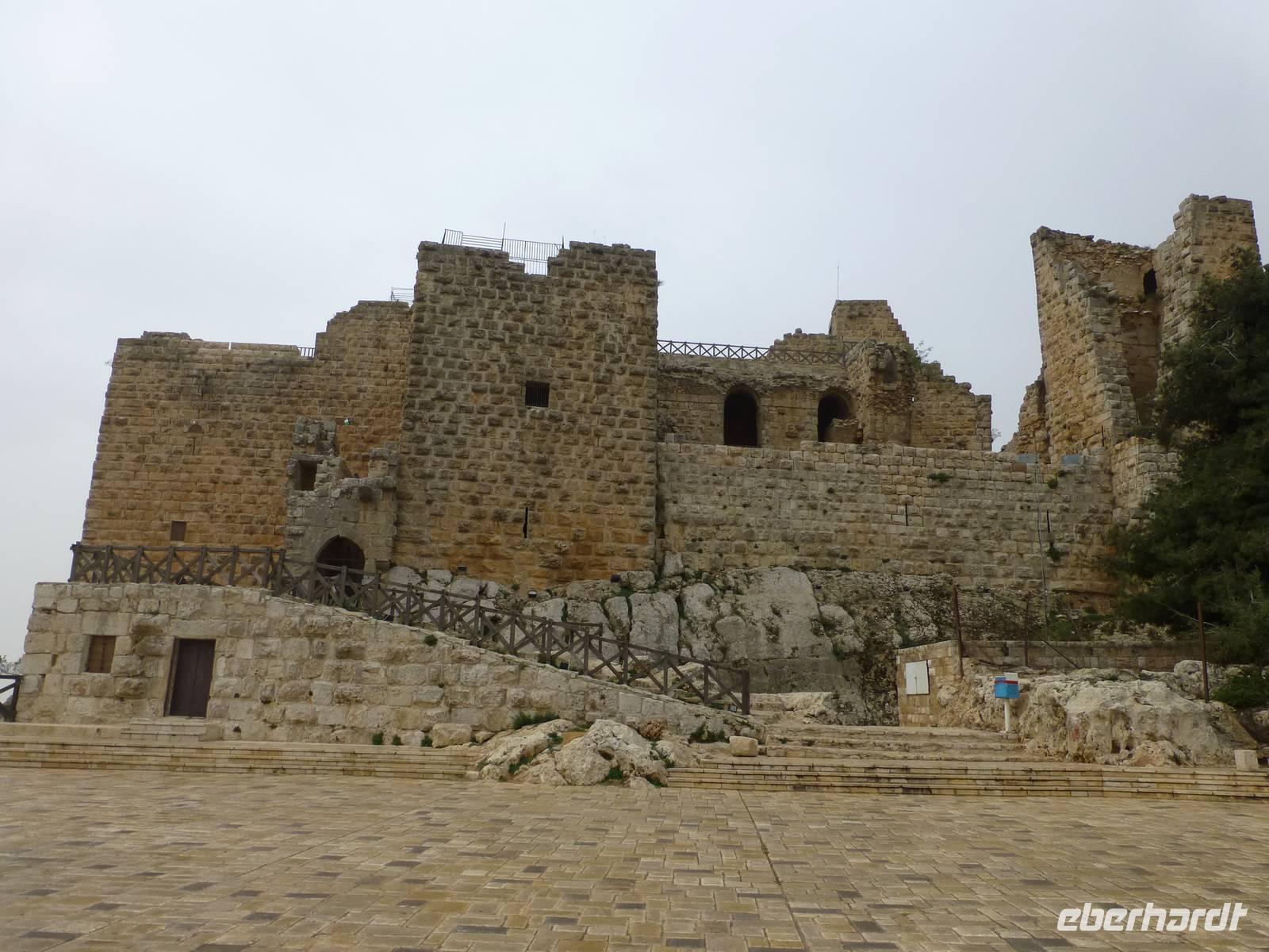 Zum Frühstück war heute jede Menge los im Hotel. Mehrere Gruppen reisten zur gleichen Zeit ab und wollten entsprechend frühstücken und den Fahrstuhl nutzen. Nach dem Frühstück fahren wir nach Ajlun und Jerash. Bis Ajlun dauertdie Fahrt gute 1,5 h. Das Wetter ist am heutigen Morgen nicht besonders toll, es ist frisch und Nebelschleier durchziehen die gebirgige Landschaft und es gibt über den Tag verteilt etliche Schauer. Das ist gut, denn seit Dezember hat es nicht mehr geregnet, wie Mahmoud erzählte. Kurz nach der Stadt Amman ändert sich die Landschaft, es gibt Wälder, zum Teil durch Aufforstung, aber auch natürliche. Zum Beispiel fahren wir an Steineichenwäldern entlang. Steineichen sind übrigens immergrüne Bäume. Später kommen Olivenbäume hinzu und auch immer wieder Flächen mit Grünland. Oberhalb der kleinen Stadt Ajlun befindet sich die islamische Burg Qalaat al-abad. Jordaniens einzige mittelalterliche Burg wurde im 12. Jh. errichtet um die Gegend vor den Kreuzfahrer zu sichern. Bauherr war ein Neffe des großen Sultans Saladin, Izz ed-Din Usama. Benötigt hat man die Festung allerdings nie, denn bereits drei Jahre nach ihrer Fertigstellung wurden das Kreuzfahrerheer 1187 in der Schlacht bei Hittin geschlagen. Die Kreuzfahrer bezeichnet man hier übrigens nicht als solche, man nennt sie Franken.
