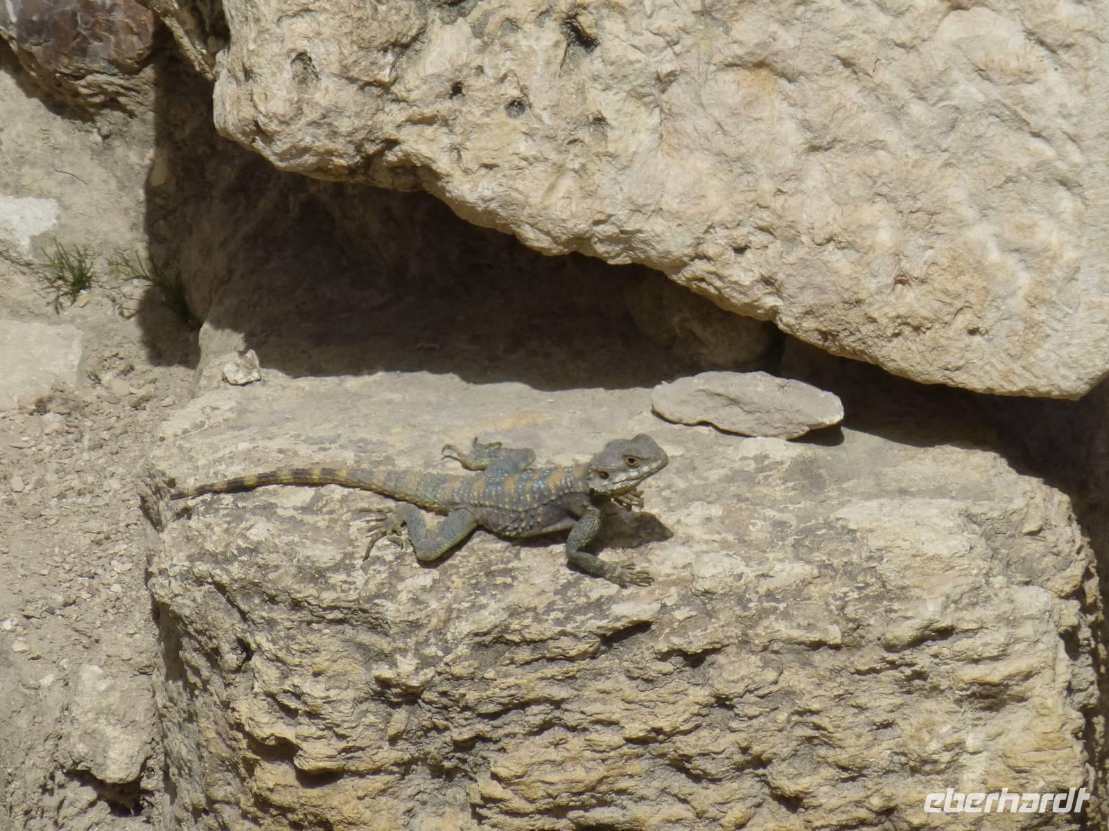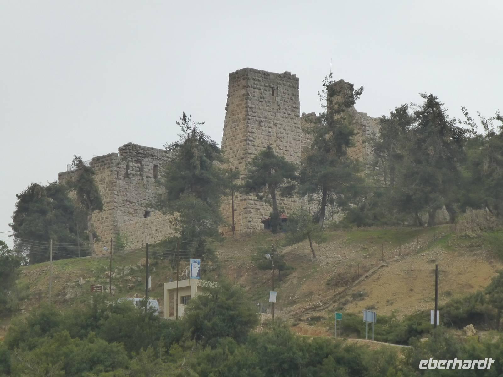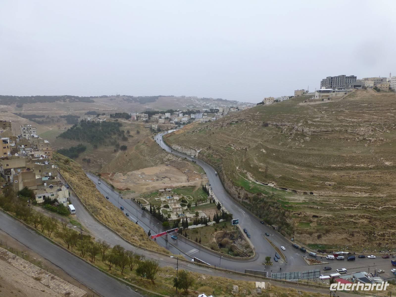 Zum Frühstück war heute jede Menge los im Hotel. Mehrere Gruppen reisten zur gleichen Zeit ab und wollten entsprechend frühstücken und den Fahrstuhl nutzen. Nach dem Frühstück fahren wir nach Ajlun und Jerash. Bis Ajlun dauertdie Fahrt gute 1,5 h. Das Wetter ist am heutigen Morgen nicht besonders toll, es ist frisch und Nebelschleier durchziehen die gebirgige Landschaft und es gibt über den Tag verteilt etliche Schauer. Das ist gut, denn seit Dezember hat es nicht mehr geregnet, wie Mahmoud erzählte. Kurz nach der Stadt Amman ändert sich die Landschaft, es gibt Wälder, zum Teil durch Aufforstung, aber auch natürliche. Zum Beispiel fahren wir an Steineichenwäldern entlang. Steineichen sind übrigens immergrüne Bäume. Später kommen Olivenbäume hinzu und auch immer wieder Flächen mit Grünland. Oberhalb der kleinen Stadt Ajlun befindet sich die islamische Burg Qalaat al-abad. Jordaniens einzige mittelalterliche Burg wurde im 12. Jh. errichtet um die Gegend vor den Kreuzfahrer zu sichern. Bauherr war ein Neffe des großen Sultans Saladin, Izz ed-Din Usama. Benötigt hat man die Festung allerdings nie, denn bereits drei Jahre nach ihrer Fertigstellung wurden das Kreuzfahrerheer 1187 in der Schlacht bei Hittin geschlagen. Die Kreuzfahrer bezeichnet man hier übrigens nicht als solche, man nennt sie Franken.