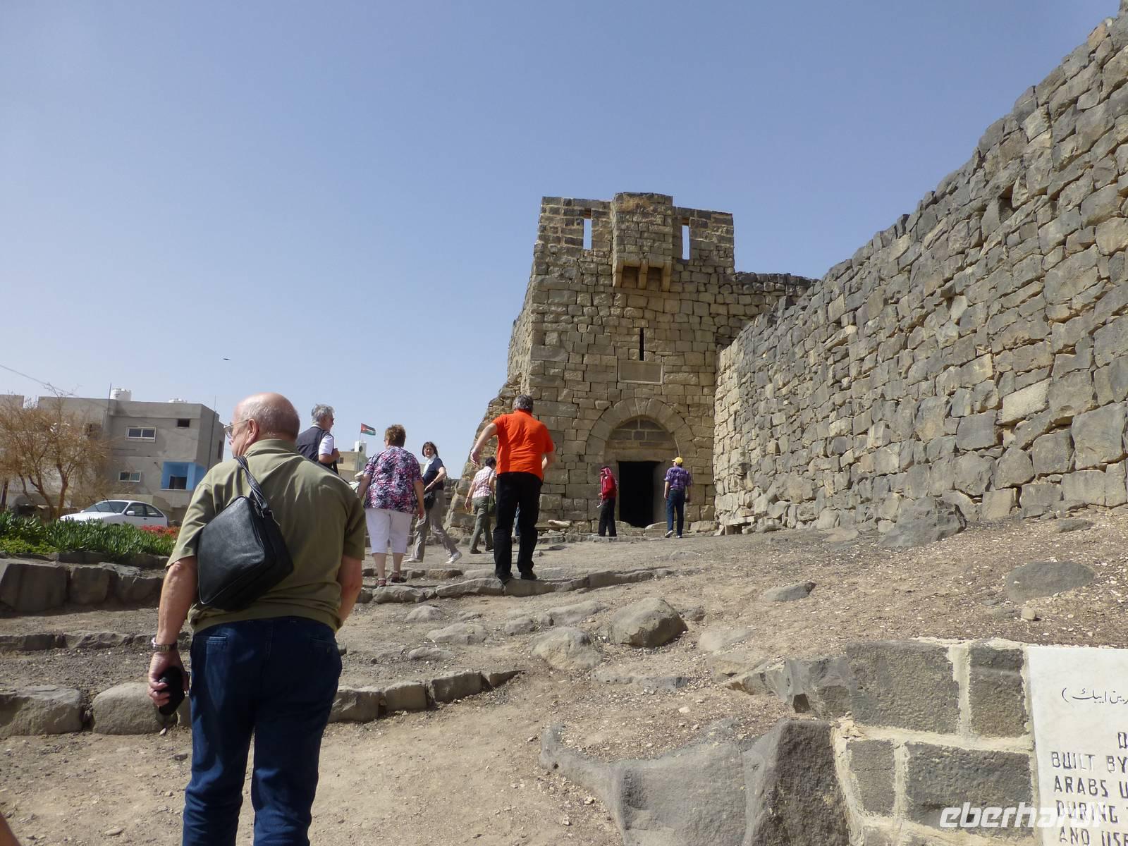 Am Nachmittag besichtigen wir dann die außerhalb der Stadt gelegenen Omajadischen Wüstenschlösser. Zuerst besuchen wir das Wüstenschloss Qasr al-Azraq. Es unterscheidet sich vor allem durch das Baumaterial Basalt, von den anderen Wüstenschlösser welche aus Kalkstein gebaut sind. Ursprünglich war es ein von den Römern im 2. Jh.n.Ch. gebautes Castel zur Verteidigung gegen aus der Wüste vorrückende Beduinen. Im Winter 1917/1918 überwinterte Lawrence von Arabien hier. Seine Schildwachen schlossen jeden Abend die drei Tonnen schwere, heute immer noch vorhandene, Tür aus einer Granitplatte ab. 1927 wurde durch ein Erdbeben ein Großteil der Anlage schwer in Mitleidenschaft gezogen. Gleich in der Nähe haben wir die Möglichkeit Mittagspause in einem Restaurant zu machen. Dabei haben wir die Möglichkeit zum ersten Mal die gute jordanische Küche zu probieren.