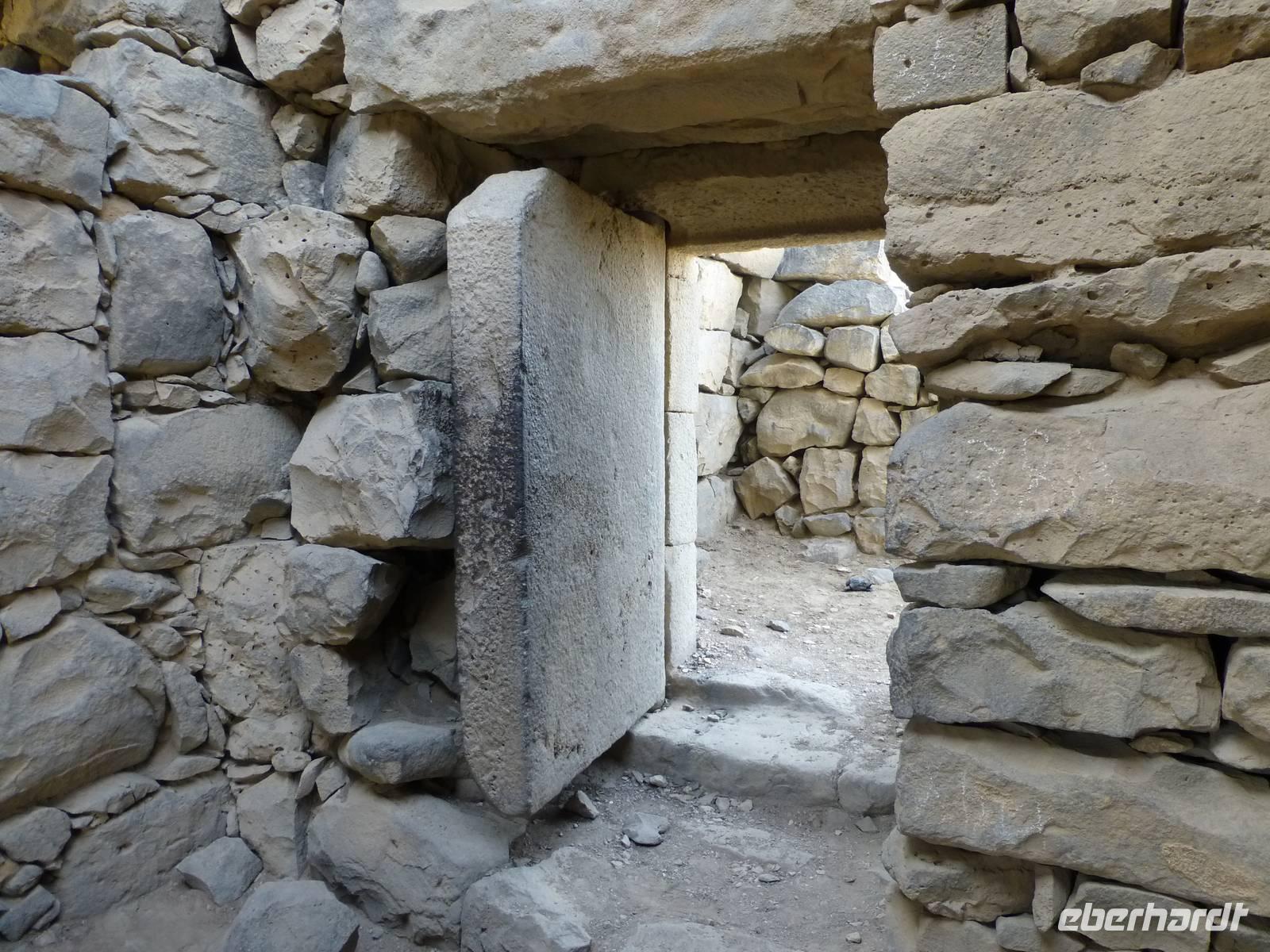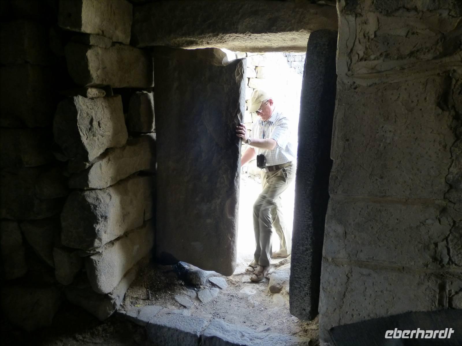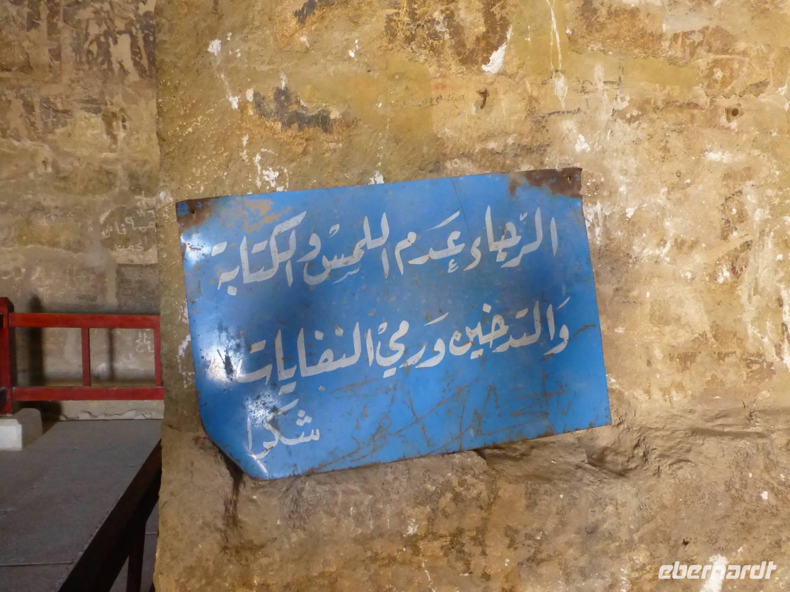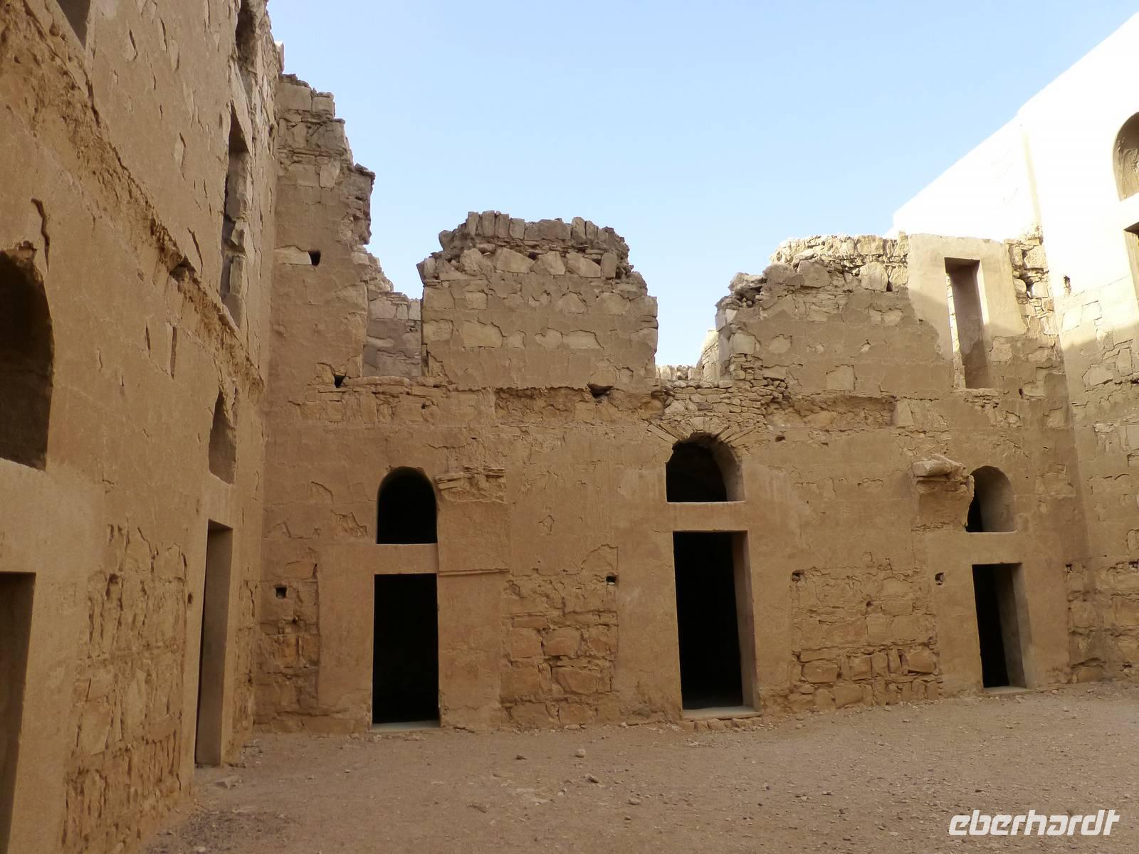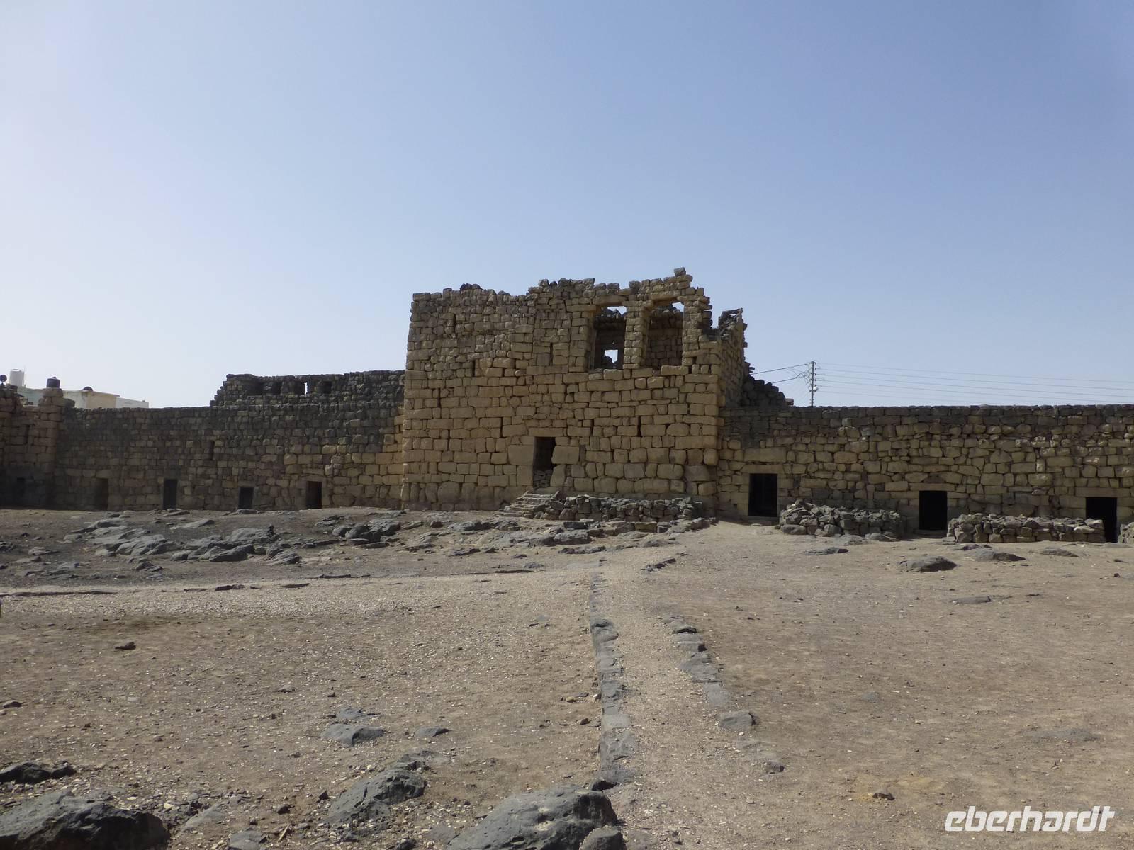 Nur wenige Minuten sind es mit dem Bus bis zum dritten Wüstenschloss. Qasr al-Kharana, ein trutzig in der Landschaft stehendes Bauwerk, beeindruckt von außen mit seiner Größe. Normalerweise würde man hier auch nicht von einem Schloss reden. Mahmuod erklärt uns, das es sich eher um ein Jagdschloss gehandelt hat. In der Wüste hat man früher u. a. Antilopen und Gazellen gejagt. Sehr wahrscheinlich wurde es als Karawanserei genutzt. Im Erdgeschoss des Gebäudes befanden sich Stallungen und Lagerräume. Da so eine Karawane früher enorme Werte mit sich führte war solch ein burgähnlicher Bau zur Übernachtung sicher nicht unangebracht. Man kann auch recht eindeutig nachweisen, aus welcher Zeit die Anlage stammt. Eine Inschrift verrät uns, dass ein Bewohner am 13.11.710 dort übernachtet hat. Insgesamt gibt es im Gebäude 44 Räume auf zwei Etagen, eine Tatsache die man dem Gebäude von außen nicht ansieht.