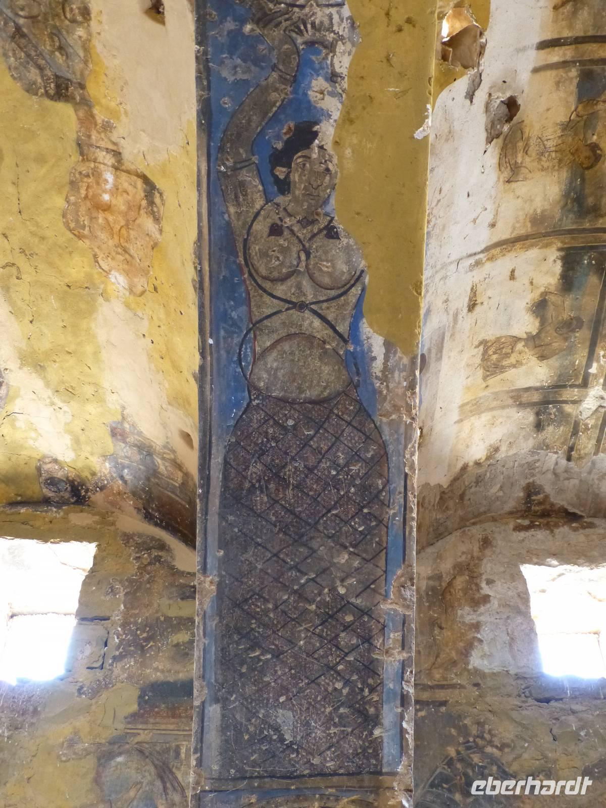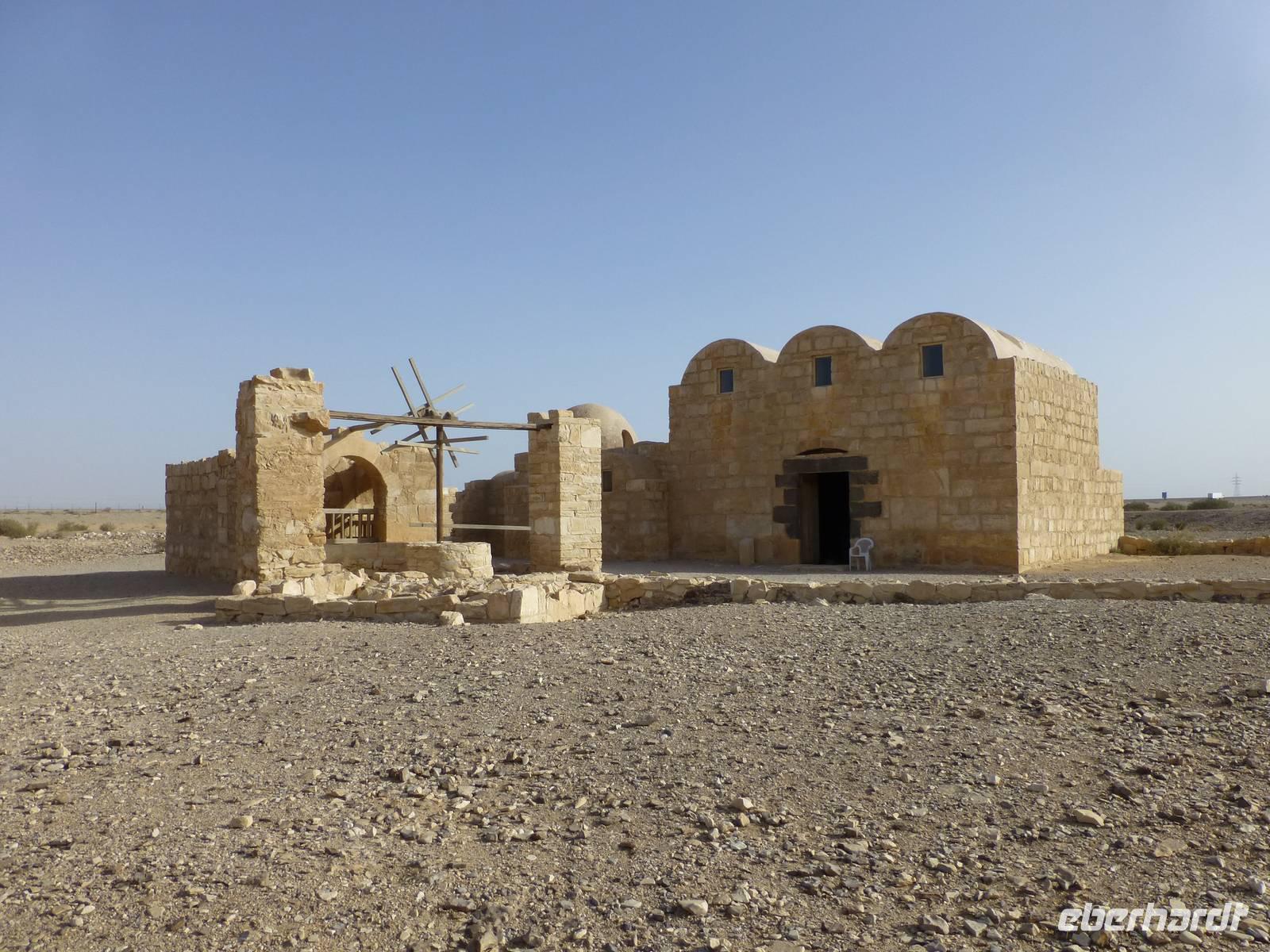 Das nächste Wüstenschloss ist eher ein Schlösschen. Sein Name, Qusair Amra, sagt das auch aus. Es besteht aus 6 Gebäudeteilen, wobei die Audienzhalle ein wahres Schmuckstück ist. Wände und Decken sind mit zahlreichen Fresken versehen. Dargestellt werden u .a. halbnackte Frauen. Im Islam ist es aber nicht gestattet Menschen abzubilden. So kann man daraus schließen, dass die Arbeiter welchen dieses Schlösschen bauten und gestalteten keine Araber waren. Vermutlich waren es Griechen. Dem damaligen Besitzer hat es aber wohl gefallen, er hat es sich extra als Lustschlösschen bauen lassen. Heute gehört das im Jahre 711 errichtet Schlösschen zum UNESCO Weltkulturerbe. Letzter Besichtigungspunkt für heute ist das Wüstenschloss Qasr al-Kharana.
