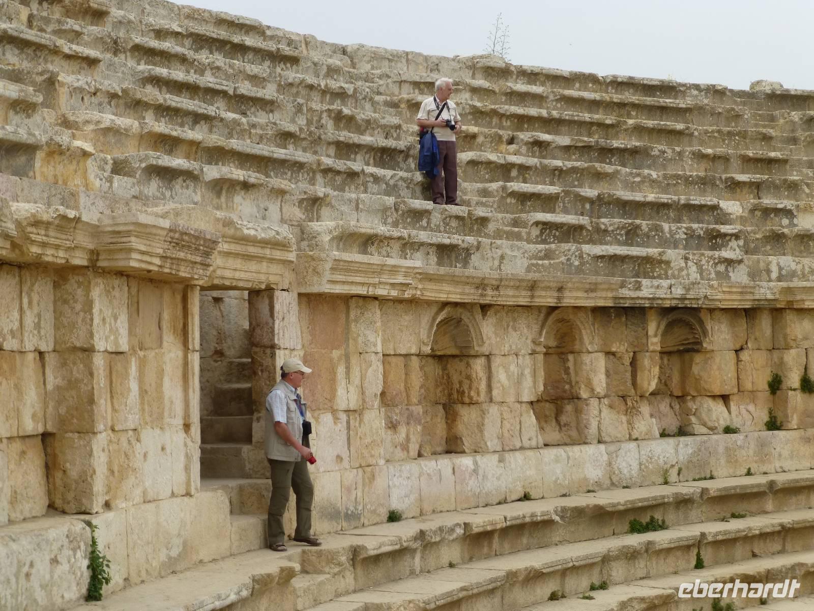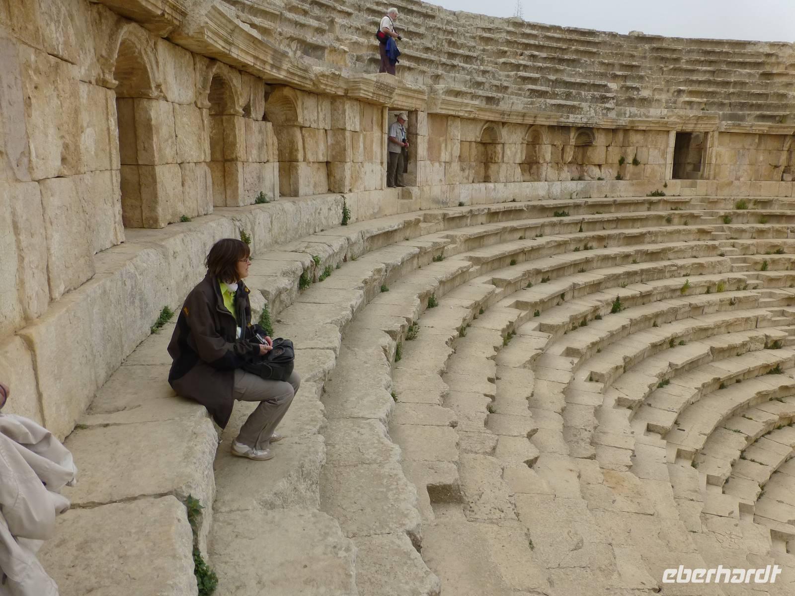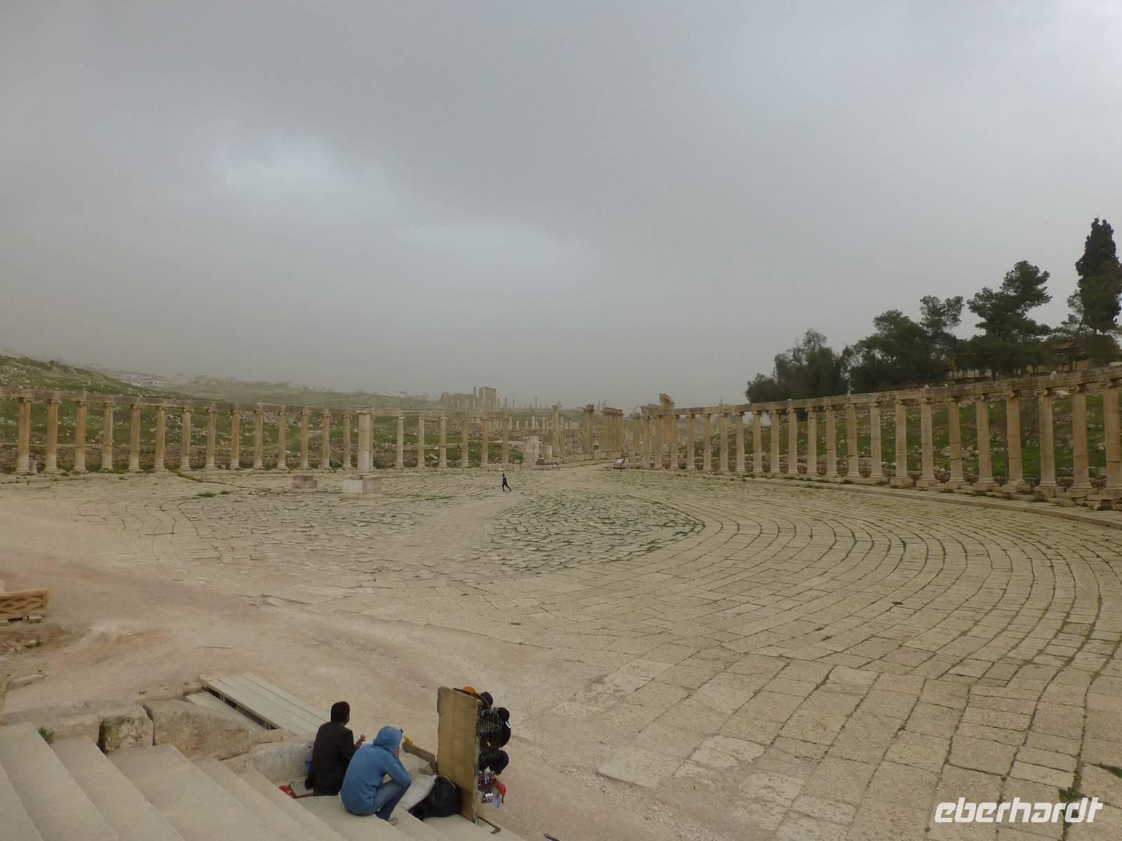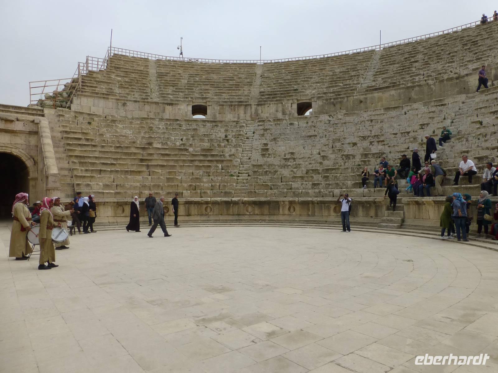 Nach ca. 45 Minuten Fahrt erreichen wir Jerash mit der bedeutendsten römischen Ausgrabung auf jordanischem Gebiet. Kaiser Hadrian rühmte sie „als die Stadt die alle Schönheiten in sich vereint". Und so ließ er sich auch gleich einen Triumphbogen bauen und dazu ein Hippodrom, eine Pferderennbahn. Wir treten am Südtor in die Stadt ein und gelangen als erstes zum ovalen Platz, so genannt weil er nicht rund ist. Beeindruckend wird er von Säulen umrahmt. Wir besuchen dann das Südtheater, welches sich neben dem Zeustempel befindet. Hier erleben wir viel ausgelassene jordanische Jugendliche auf einem Schulausflug. Als dann noch eine kleine Dudelsackkapelle aufspielt tanzen einige der Mädchen dazu.Die Musiker sind pensionierte Militärmusiker, welche mit Genehmigung dort spielen dürfen. Der Dudelsack wurde 1917 beim Militär eingeführt, als zahlreiche Araber in den Truppen der britischen Armee in Transjordanien dienten. Frankreich und Großbritannien hatten sich 1916 in einem geheimen Vertrag über die Aufteilung der arabischen Staaten geeinigt und somit eigentlich neue Kolonien geschaffen. Der Dudelsack, welcher seinen Ursprung tatsächlich in den arabischen Ländern hat und über Spanien nach Schottland gekommen ist, erfreut sich hier im Land großer Beliebtheit. Keine Hochzeit ohne Dudelsackmusik und das kann ruhig auch schottische sein. Nach dem Ende des knapp zwei Stunden dauernden Rundgangs haben wir uns im nahen Restaurant eine Mittagspause verdient. Nach der Rückkehr ins Hotel bleibt uns noch etwas Zeit zur Erholung bis zum Abendessen.