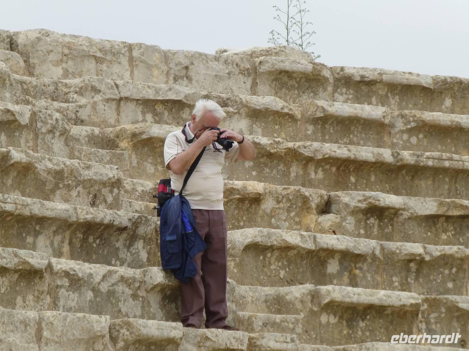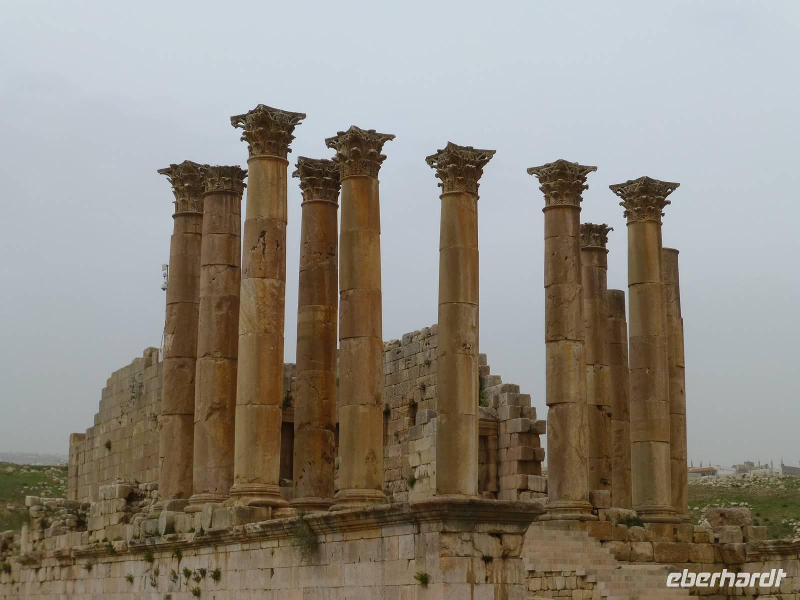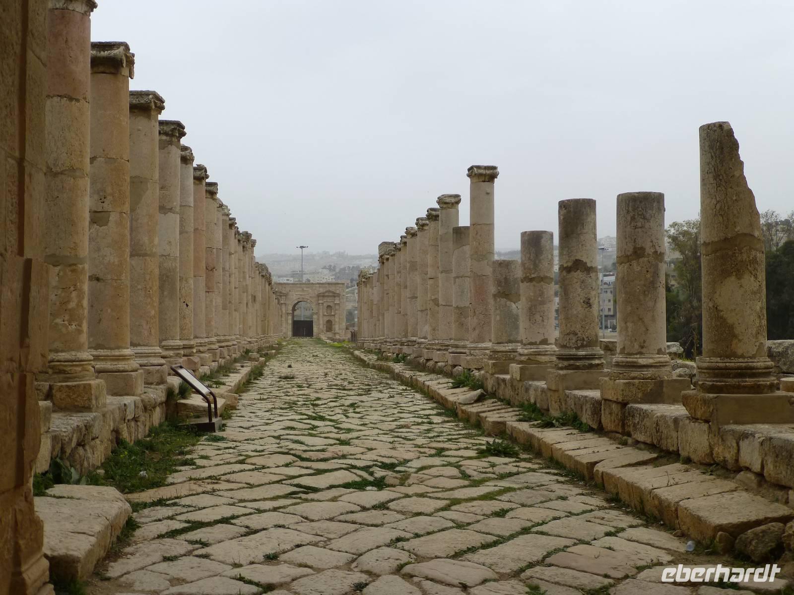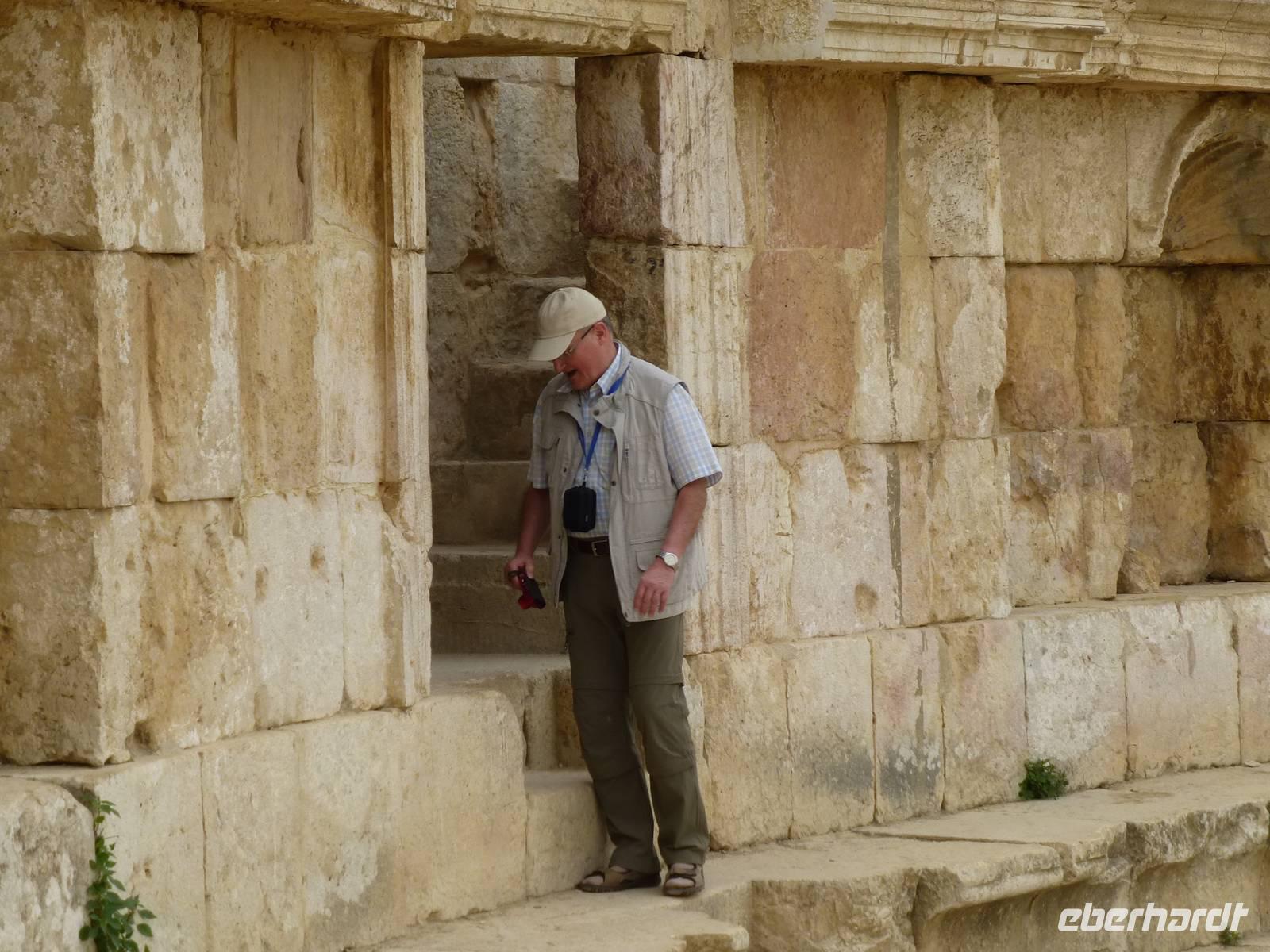 Nach ca. 45 Minuten Fahrt erreichen wir Jerash mit der bedeutendsten römischen Ausgrabung auf jordanischem Gebiet. Kaiser Hadrian rühmte sie „als die Stadt die alle Schönheiten in sich vereint". Und so ließ er sich auch gleich einen Triumphbogen bauen und dazu ein Hippodrom, eine Pferderennbahn. Wir treten am Südtor in die Stadt ein und gelangen als erstes zum ovalen Platz, so genannt weil er nicht rund ist. Beeindruckend wird er von Säulen umrahmt. Wir besuchen dann das Südtheater, welches sich neben dem Zeustempel befindet. Hier erleben wir viel ausgelassene jordanische Jugendliche auf einem Schulausflug. Als dann noch eine kleine Dudelsackkapelle aufspielt tanzen einige der Mädchen dazu.Die Musiker sind pensionierte Militärmusiker, welche mit Genehmigung dort spielen dürfen. Der Dudelsack wurde 1917 beim Militär eingeführt, als zahlreiche Araber in den Truppen der britischen Armee in Transjordanien dienten. Frankreich und Großbritannien hatten sich 1916 in einem geheimen Vertrag über die Aufteilung der arabischen Staaten geeinigt und somit eigentlich neue Kolonien geschaffen. Der Dudelsack, welcher seinen Ursprung tatsächlich in den arabischen Ländern hat und über Spanien nach Schottland gekommen ist, erfreut sich hier im Land großer Beliebtheit. Keine Hochzeit ohne Dudelsackmusik und das kann ruhig auch schottische sein. Nach dem Ende des knapp zwei Stunden dauernden Rundgangs haben wir uns im nahen Restaurant eine Mittagspause verdient. Nach der Rückkehr ins Hotel bleibt uns noch etwas Zeit zur Erholung bis zum Abendessen.