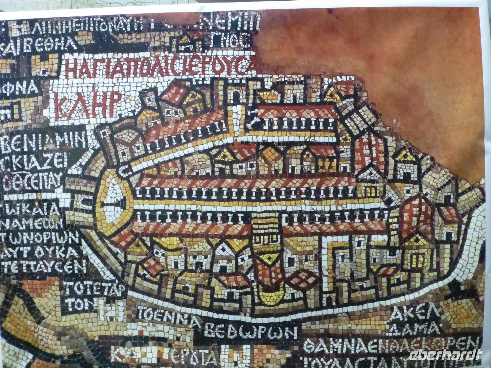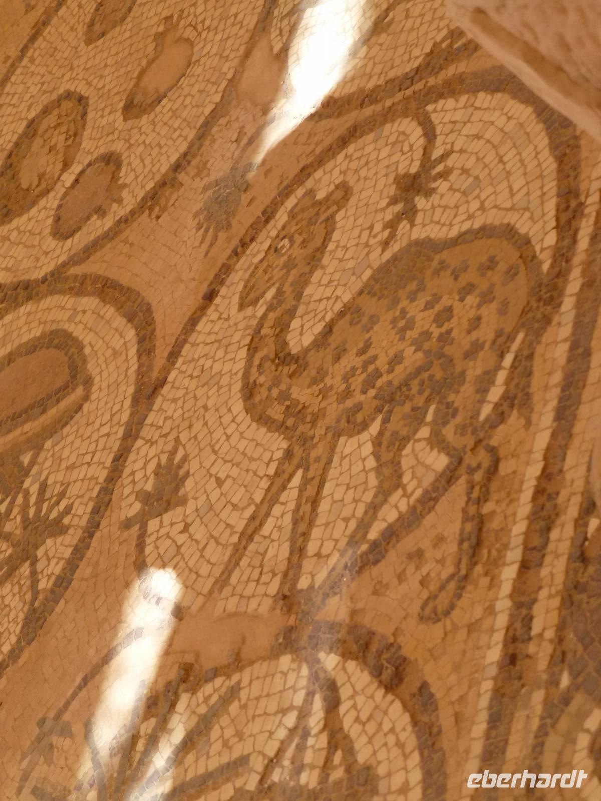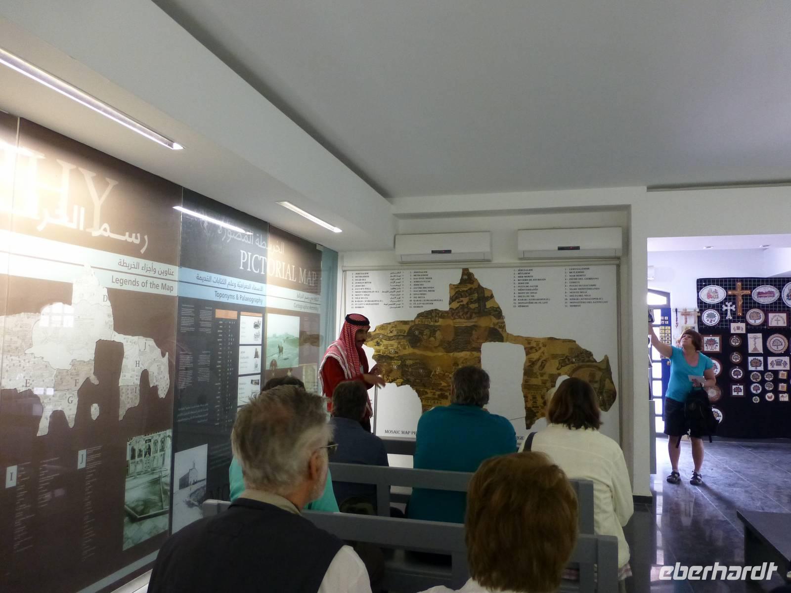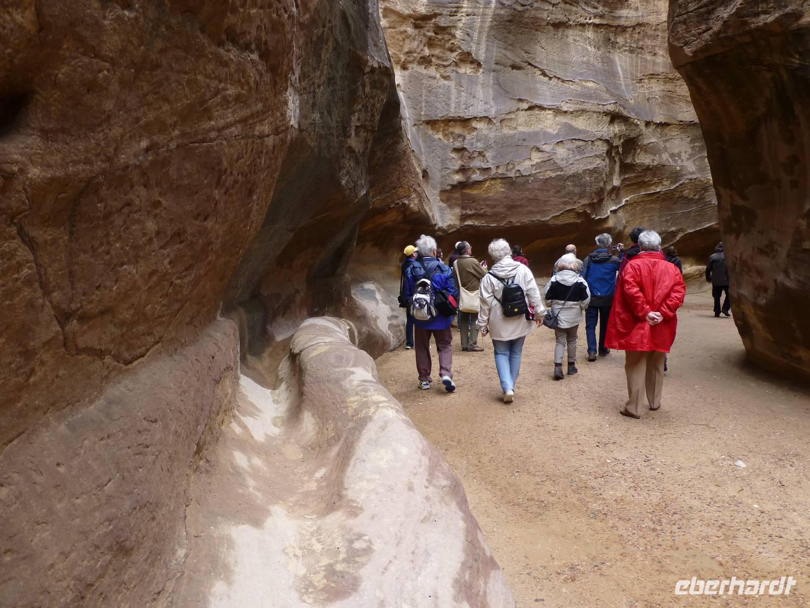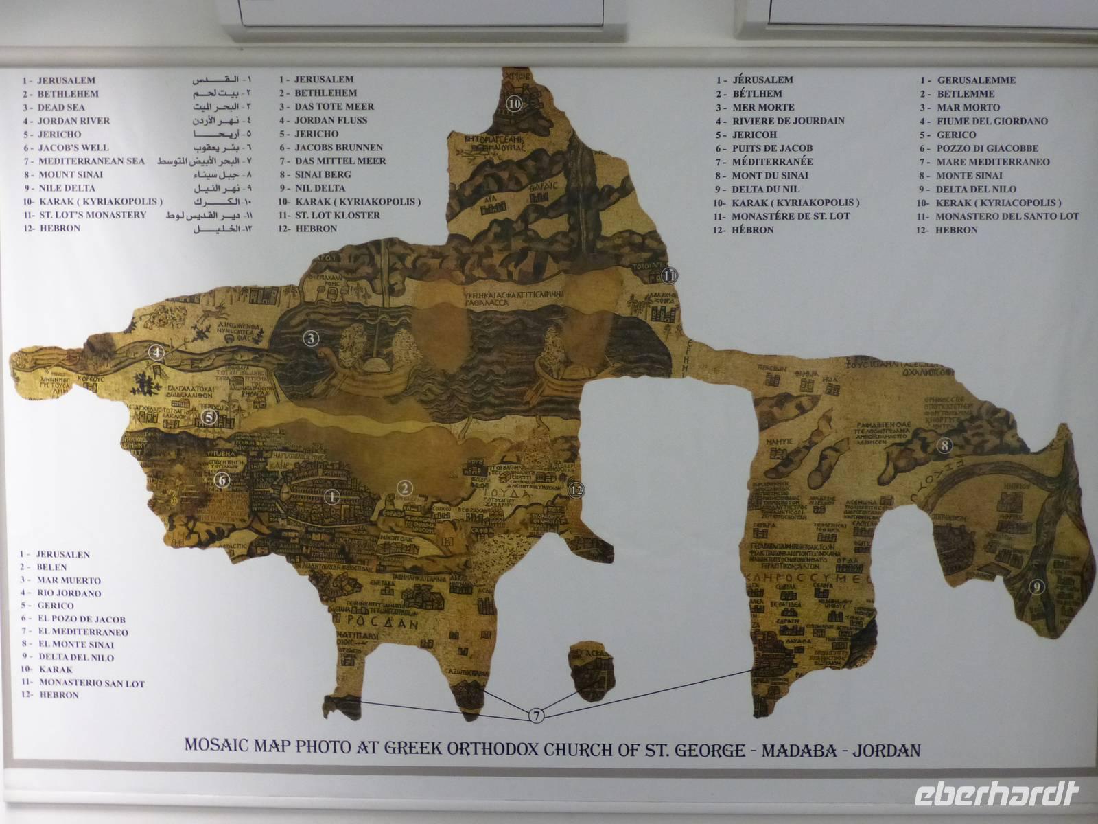 Danach fahren wir zum Berg Nebo. Hier soll Moses das gelobte Land erblickt haben, betreten konnte er es nicht mehr, da er auf dem Berg starb. Sein Grab wurde bis heute nicht gefunden. Ich lese die den Berg betreffenden Stellen aus der Bibel vor, so bekommen wir ein lebendigeres Bild vom damaligen Geschehen. Nur wenige Kilometer entfernt befindet sich die Stadt Madaba, das Zentrum der Mosaikkunst in Jordanien. Das berühmteste Mosaik besichtigen wir in der Kirche St. Georg, eine dreischiffige griechisch-orthodoxe Basilika. Das Mosaik stellt eine Landkarte von Palästina dar und stammt aus dem vermutlich aus der zweiten Hälfte des 6. Jh. Ursprünglich bestand das Mosaik aus 2,3 Mio. Steinen, ein Mosaikleger verarbeitet am Tag ca. 200 der Steinchen. Auf der Karte ist auch das Nil-Delta dargestellt, allerdings in der falschen Fließrichtung, statt von Süd nach Nord ist der Flusslauf von Ost nach West abgebildet. Unweit von Madaba befand sich auch noch die Herodes-Burg Macharäus, welche wir aber nicht besuchten. An dieser Stelle soll laut der Bibel Johannes der Täufer von Herodes Antipas, dem Sohn von Herodes dem Großen, geköpft worden sein. Sein Kopf wurde dann auf einem Tablett, auf Wunsch von Salome, der zweite Frau von Herodes Antipas, serviert. Die Geschichte ist natürlich noch etwas länger und jeder kann sie im Matthäus Evangelium 14,1-12 nachlesen. Weiter fahren wir fast zwei Stunden bis Al-Karak. Unterwegs beginnt es zu regnen und dieser Regen wird auch bis zum nächsten Morgen anhalten. Über der Altstadt von Al-Karak befindet sich die teilweise restaurierte Burg der Kreuzritter aus dem 12. Jh. Errichtet wurde sie um den Handels- und Pilgerverkehr zwischen Damaskus und Mekka zu kontrollieren. Die Überfälle des Burgherrn auf die Karawanen erregten den Zorn Saladins und er ließ die Burg mehrfach belagern. Schließlich fiel die Burg im Jahre 1188 nach 8-monatiger Belagerung. Beeindruckend war das bunte Treiben in den Straßen von Al-Karak, hier kann man den arabischen Alltag hautnah beobachten. Mit einer kurzen Pause unterwegs fuhren wir dann nach Petra weiter, wo wir die nächsten drei Nächte im Hotel Beit Zaman übernachten und zwei Tage Zeit haben uns die Nabatäerstadt Petra anzusehen.