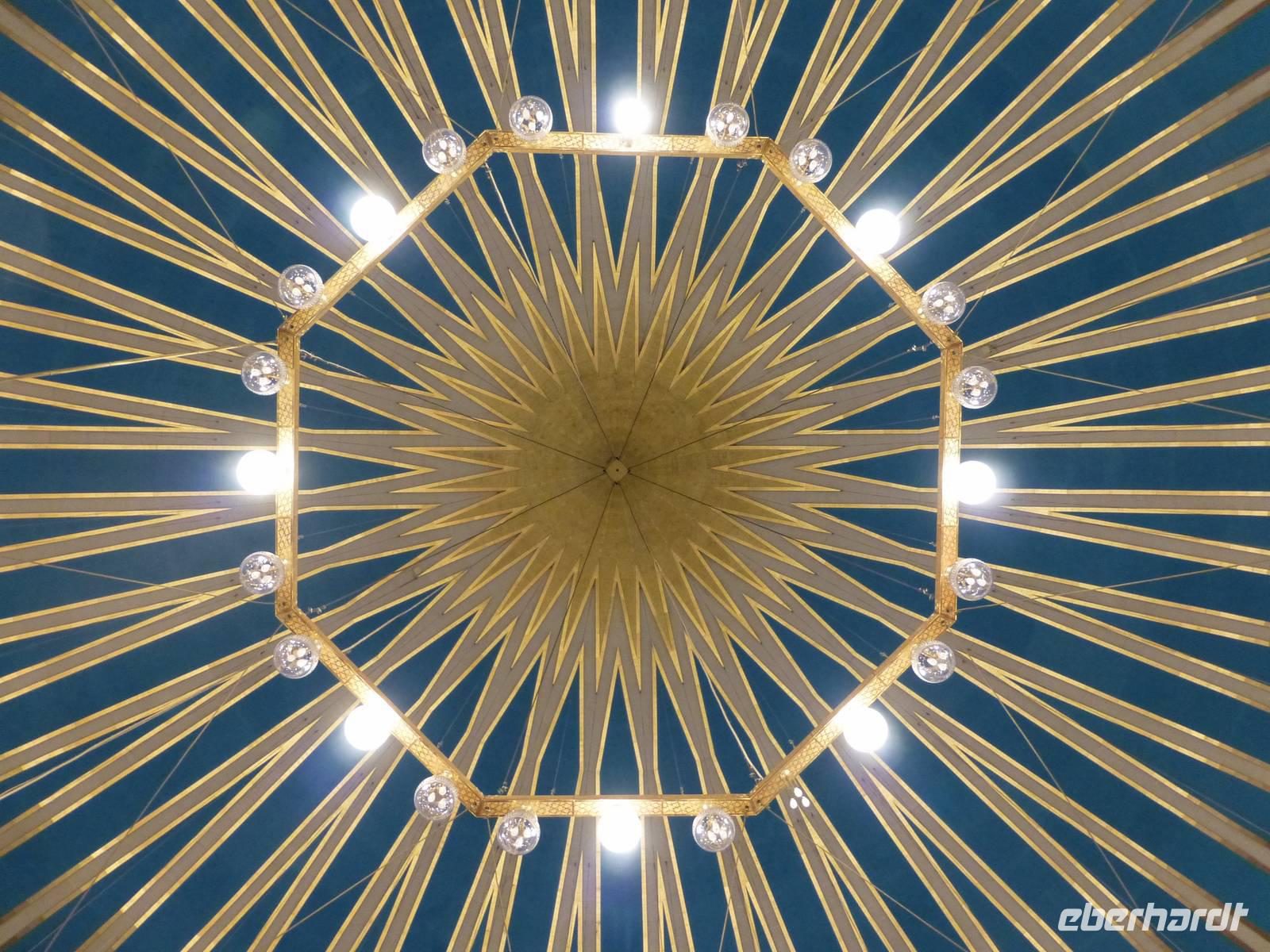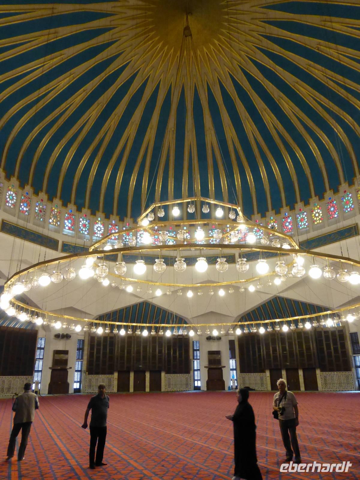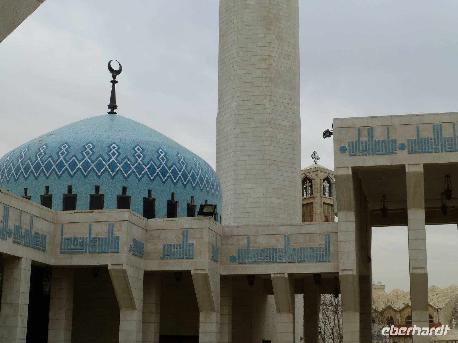Bevor wir heute aus Amman abreisen besuchen wir noch die größte Moschee des Landes. Die King Abdallah Moschee ist benannt nach dem Großvater von König Hussein. Abdallah I wurde am 20. Juli 1951 in der Al Aqsa Moschee in Jerusalem ermordet wurde. Wir betreten staunend den Gebetsraum für Männer, vorher mussten sich die Frauen unserer Gruppe verhüllen, genau so wie es der islamische Glaube gebietet. Sie haben aber damit kein Problem, denn das Erleben im inneren der Moschee beeindruckt. Mahmoud erklärt uns hier die Grundlagen des islamischen Glaubens und spricht auch über den Koran. Die Frauen unserer Gruppe besuchen dann auch noch den Gebetsraum für Frauen, wir Männer dürfen da nicht mit hinein. Die King Abdallah Moschee ist übrigens die einzige Moschee des Landes, welche von Nichtmoslems besucht werden darf. Auf der anderen Straßenseite befindet sich eine christlich-orthodoxe Kirche, man könnte glatt von einem ökomenischen Beisammensein sprechen.