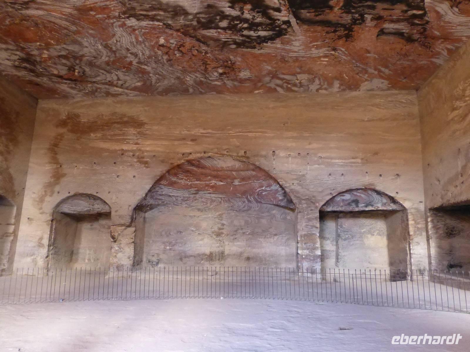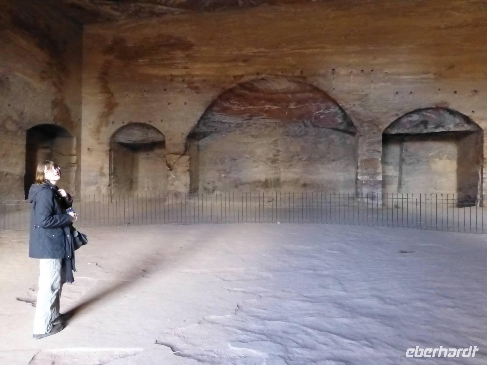 Nach dem Frühstück war es dann endlich soweit, wir besuchen eines der sieben neuen Weltwunder, Petra. Der Name Petra kommt von Petrus und bedeutet Felsen. Vom Visitor Center laufen wir bis zum Eingang des Sik, dabei kommen wir, sozusagen zur Einstimmung, an drei Blockgräbern vorbei. Die Nabatäer lebten ab dem 4. Jh. v. Chr. in dieser Gegend. Ursprünglich waren sie ein Nomadenvolk, entwickelten sich im Laufe der Zeit aber zu wichtigen Händlern von Luxusgütern auf der Weihrauchstraße. Zugleich waren sie auch hervorragende Wasserbauingenieure. Das letzte Mal hörte man von den Nabatäern im Jahre 328, wie eine aramäische Inschrift belegt. Danach verliert sich ihre Spur im Dunkeln, es wird angenommen, dass sie von den Römern assimiliert wurden. Wiederentdeckt wurde der Ort erst zu Beginn des 19. Jh. unter kuriosen Umständen durch den Schweizer Orientalisten Johann Ludwig Burckardt. Aber nun geht es endlich durch den Sik, einer Art Canyon, 1,2 km lang, an der schmalsten Stelle nur 2 m breit. Die bizarren Sandsteinformationen in ihren unterschiedlichen Farbtönen sind ein faszinierendes Erlebnis. Dann ist es soweit und der Ausgang des Sik ist erreicht. Jetzt machen wir alle das berühmteste Foto von Jordanien, wir fotografieren das Schatzhaus. Die Beduinen nannten es das Schatzhaus des Pharaos, da sie vermuteten, dass in der Urne an der Spitze des Bauwerks der Schatz des Pharaos ist. Aber eigentlich handelt es sich bei diesen aus dem Fels gehauenen Bauwerks um ein Grab. Alle Monumente sind übrigens von oben nach unten entstanden, denn hätte man unten angefangen wären durch herabstürzende Steine schon fertig gestellte Teile wieder beschädigt wurden. Nachdem wir das Schatzhaus ausreichend bestaunt und fotografiert haben laufen wir weiter und besichtigen weitere Gräber. Unterwegs legen wir eine Teepause ein, es gibt schwarzen Tee mit Pfefferminzblättern, das erfrischt. Unser weg führt uns jetzt zum großen Tempel, dessen Restaurierung erst vor kurzem fertiggestellt wurde. Von der byzantinischen Kirche haben einen schönen Blick auf den Großen Tempel. Vor uns sehen wir schon die Königswand, mit dem Urnengrab, dem Seidengrab, dem Korinthischen Grab und dem Palastgrab. Die Schönheit der nabatäischen Kultur beeindruckt und überwältigt. Jetzt haben wir uns eine Mittagspause verdient, jeder kann nach seinen Wünschen etwas trinken oder essen. Die nabatäische Baukunst ist besonders gut daran zu erkennen, dass die Säulen nur halbrund und die Kapitelle als Nasenkapitelle gestaltet sind. Die Nabatäer konnten zu diesem Zeitpunkt noch keine Verzierungen an den Kapitellen herstellen. Den Rückweg zum Visitor Center kann jeder in seinem Tempo gestalten.Wir treffen uns alle am Ausgang wieder und fahren mit dem Bus zurück zum Hotel. Morgen werden wir noch einmal die Felsenstadt besuchen können.