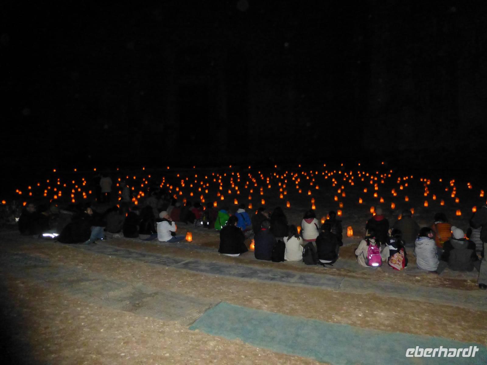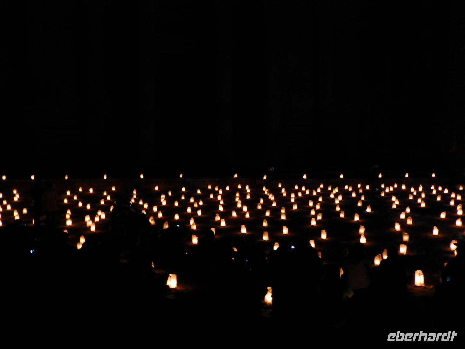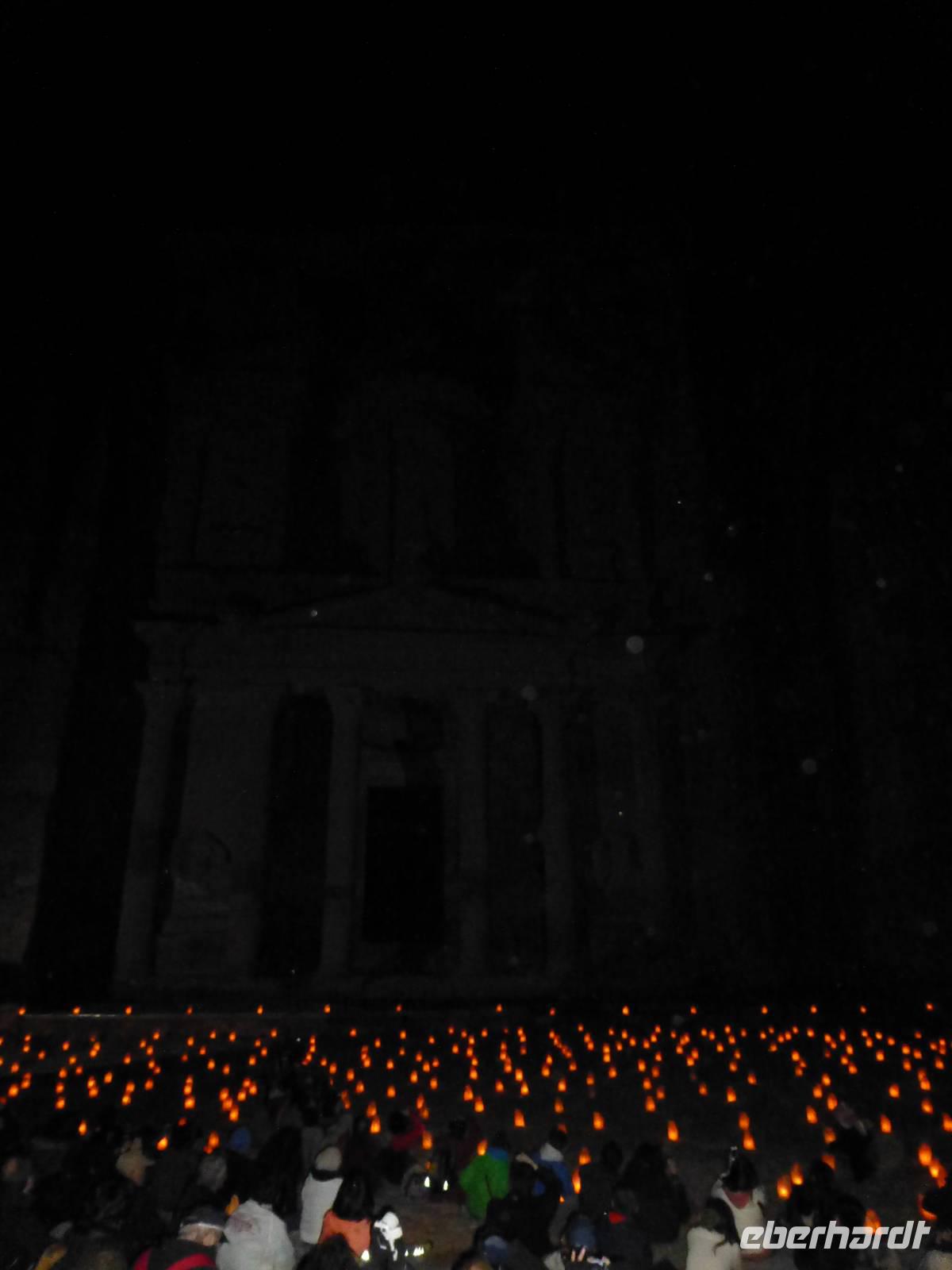 Nach dem Abendessen wartet, fakultativ, noch ein besonderer Höhepunkt auf uns, Petra bei Nacht. Wir fahren mit Taxis bis zum Visitor Center und laufen dann auf dem mit Kerzen beleuchteten Weg durch den Sik bis zum Schatzhaus. Der ganze Platz vor dem Schatzhaus ist ebenfalls mit Kerzen beleuchtet. Wir setzen uns oder stehen, jeder bekommt einen Becher Tee gereicht. Nach einer Weile des Wartens, wurde es ganz still. Zuerst spielte ein Beduine auf einer Rabarb, einer Art Urvioline und sang dazu. Danach spielte vor der Fassade des Schatzhauses ein Flötenspieler eine wunderschöne Melodie. Nach einer kurzen Ansprache in Englisch war das ganze Spektakel zu Ende und wir sind durch den Kerzenbeleuchteten Sik zurück gelaufen.