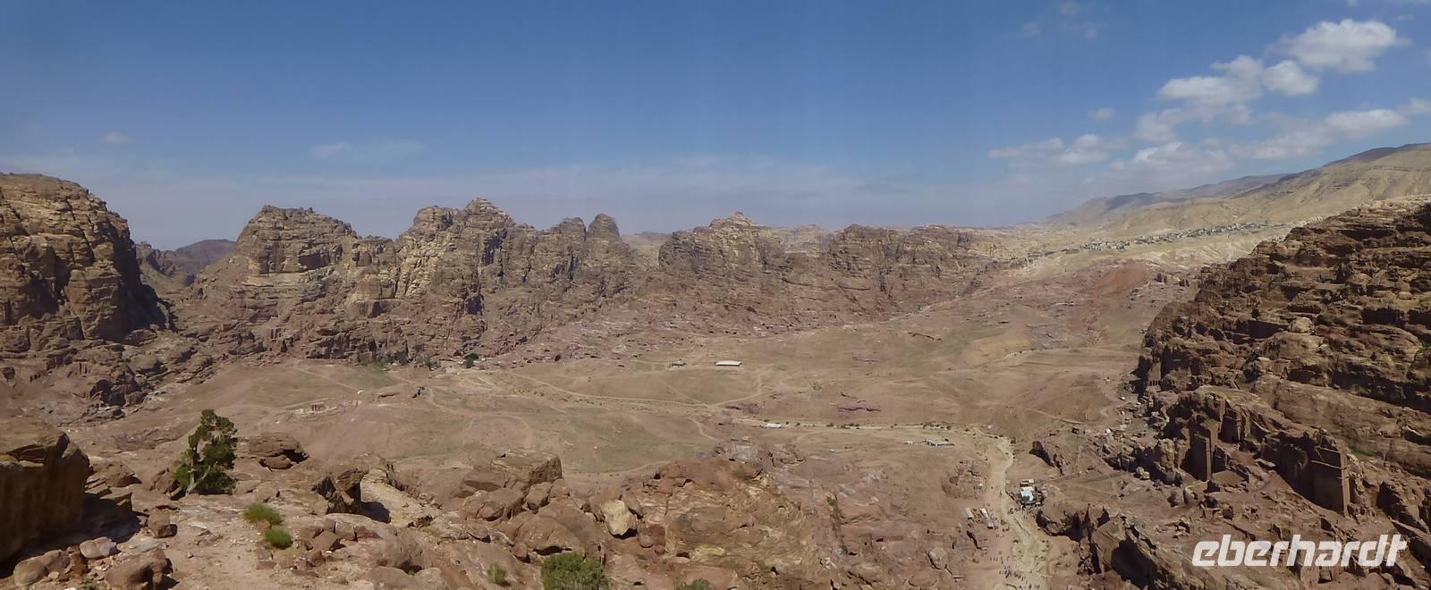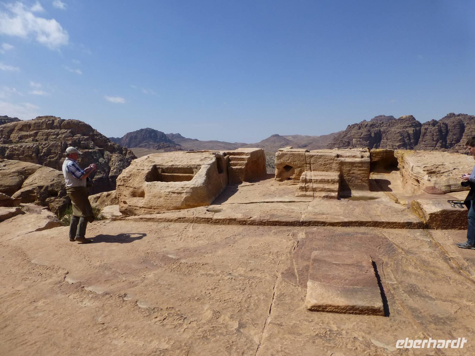 Während die meisten Gäste nach einer oder zwei Nächten im Hotel schon wieder abreisen sind wir noch eine dritte Nacht hier im Hotel Beit Zaman. Das Gute daran ist, wir haben noch einen weiteren Tag in der Felsenstadt Petra zur Verfügung. Mahmoud, unser Reiseleiter, bietet einen weiteren Rundgang an, welcher aber nicht verpflichtend ist. So kann man auch seiner eigenen Wege gehen, was auch einige Gäste nutzen. Wir fahren wieder zum Visitor Center und laufen von dort durch den Sik zum Schatzhaus. Hier verweilen wir noch einmal um die Pracht der Fassade bei schönster Beleuchtung zu genießen. Danach heißt es Treppen steigen. Allerdings nur für die Gäste, die wirklich möchten oder können. Für alle anderen gibt es die Möglichkeit in aller Ruhe noch einmal all das Gestrige zu genießen. Über 800 Treppenstufen führen nach oben zum Opferplatz und dort werden wir mit einer wundervollen Aussicht belohnt. Der Weg nach unten führt uns dann am Löwenrelief, dem Gartentempel, dem Bunten Saal und dem Soldatengrab wieder ins Tal zurück. Nach fast 4 Stunden haben uns dann eine Mittagspause in einem der Imbissstände verdient. Nach der Pause machen wir uns wieder auf den Rückweg zum Bus. Der Nachmittag steht uns zur freien Verfügung und alle nutzen die Zeit um im Hotel ein wenig auszuspannen.