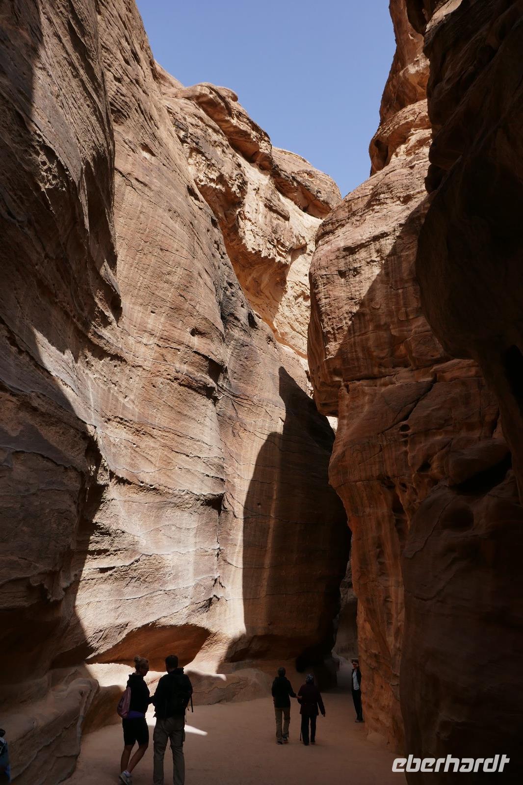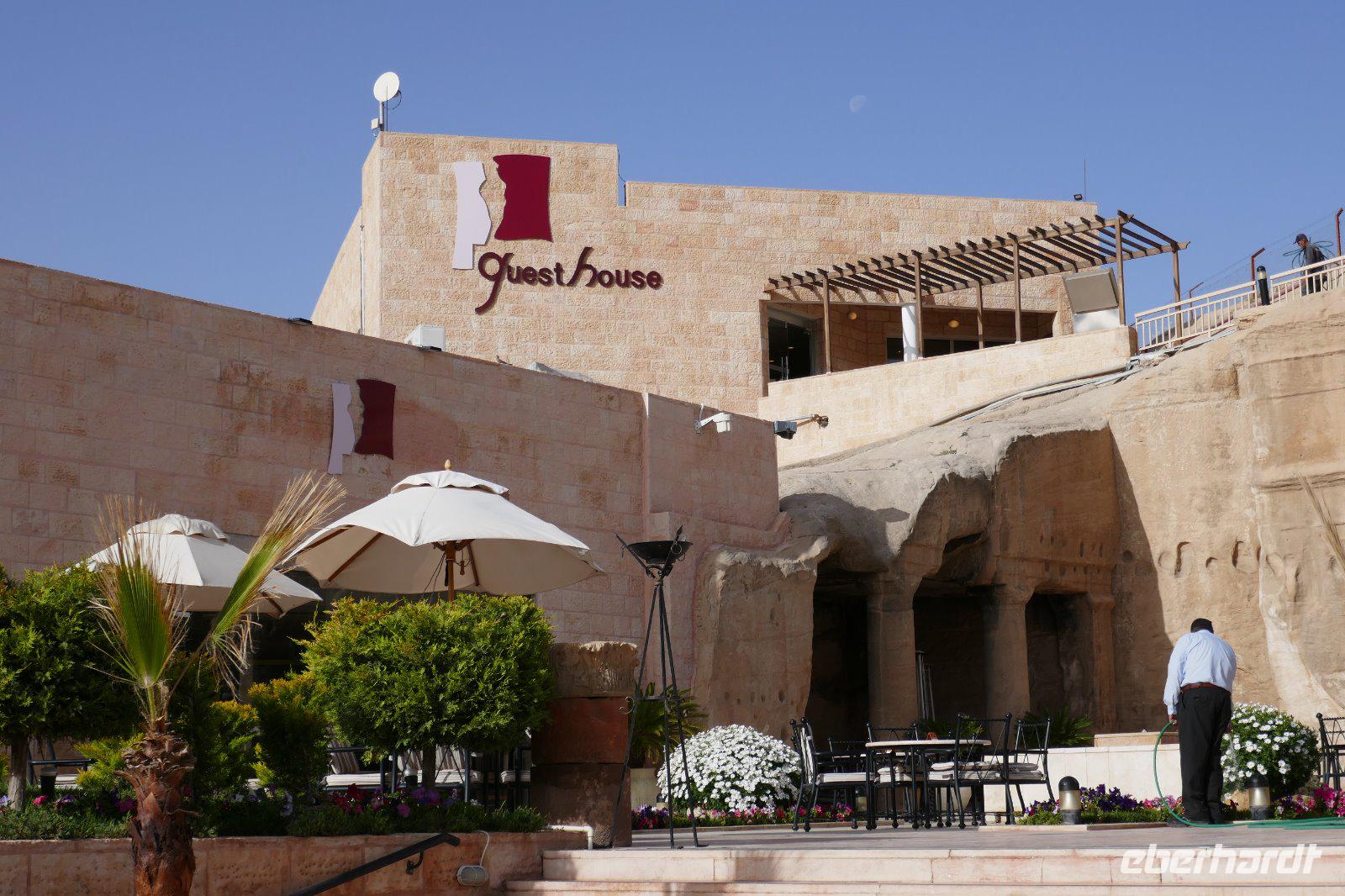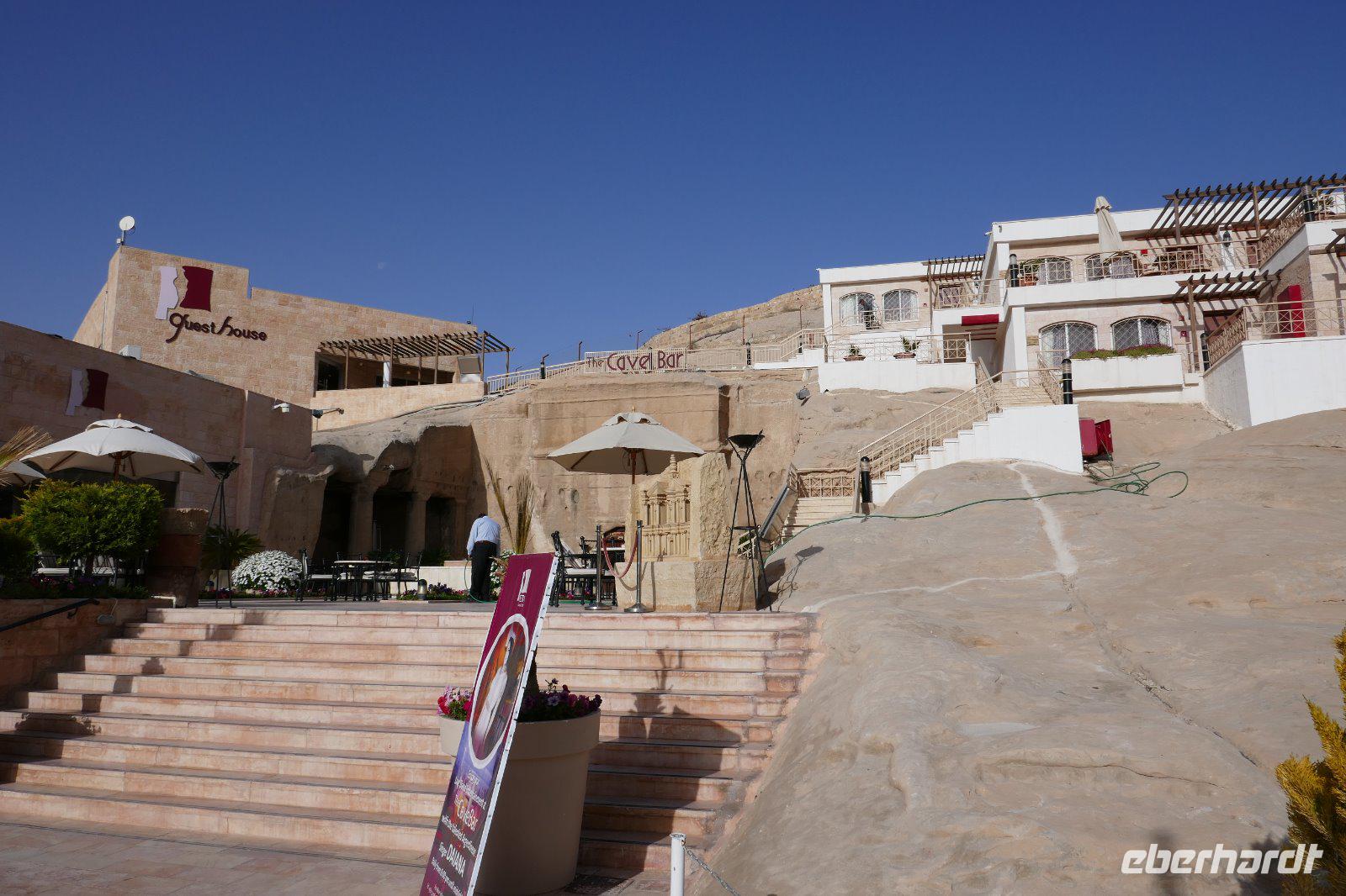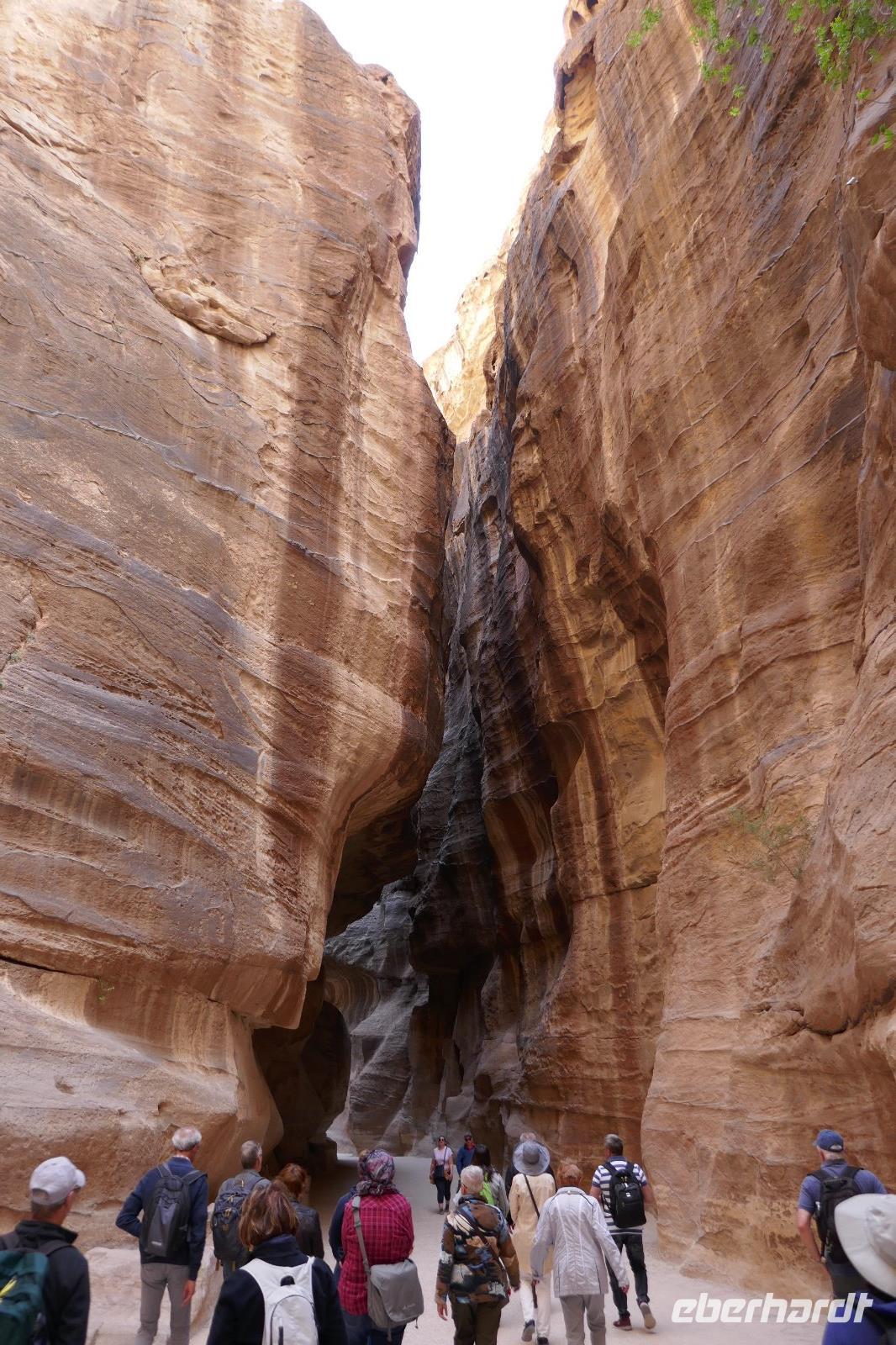 Es heißt Abschied nehmen von Amman und nach dem Frühstück führte uns der Weg in Richtung Berg Nebo. Auf dem Weg dorthin durften wir die Villen und das Botschaftsviertel im neuen Teil von Amman erleben. Danach hieß es etwas Geduld haben, um den Blick aufs gelobte Land zu erleben. Angekommen am Berg Nebo - hier also soll Moses das erste Mal das „gelobte Land" gesehen haben. Und in der Tat von dem 808 Meter hohen Berg hatten wir eine gute Sicht auf das Jordantal, auf das Tote Meer und nach Israel. Kein Wunder das hier Papst Benedikt auf seiner Pilgerreise 2009 an dieser Stelle folgende Worte fand „Von diesem heiligen Berg lenkt Mose unseren Blick [...] auf die Erfüllung aller Verheißungen Gottes in Christus." Ob Gläubig oder nicht - alle schweiften wie einst Moses ihren Blick in die Ferne und genossen die Aussicht. Natürlich fehlte nicht der Besuch der Kapelle mit ihren Mosaiken. Danach fuhren wir nach Madaba in der wir zur Kirche St. Georg gingen, denn hier befindet sich die älteste Darstellung von Palästina auf einer kunstvollen Landkarte aus Mosaik. Nach Freizeit u. einem leckeren Essen ging es weiter auf der Königstraßen in Richtung Süden. Karg war die Landschaft und doch wundervoll. Bald erreichten wir Wadi Mujib- den Grand Canyon Jordaniens. Bei einem Fotostopp hatten wir eine atemberauschende Aussicht in die tiefe Schlucht. Kehre um Kehre schlängelt sich die Straße in die Schlucht und wieder hinauf. Auf dieser Straße fuhren auch wir, bis wir dann über den Stausee fahrend die Kreuzritterburg von Kerak erreichten. Auf unserem Rundgang erfuhren wir viel zu dieser Anlage unter anderem, dass diese im Jahre 1188 von den Truppen Saladins 8 Monate belagert wurde. Kreuzritter und Saladin - wer kennt nicht Nathan der Weise in dessen Handlung die Geschichte der Kreuzritter und Saladin eingeflossen sind. Diese Gedanken schwangen beim Rundgang durchaus mit. Anschließend setzten wir den Weg fort und fuhren weiter nach Petra, in die sagenumwobene Stadt. Hier wohnten wir im traditionellen Petra Guesthouse direkt vor den Toren der Felsenstadt. Wir hatten gleich das Gefühl direkt bei den Nabatäern zu sein.