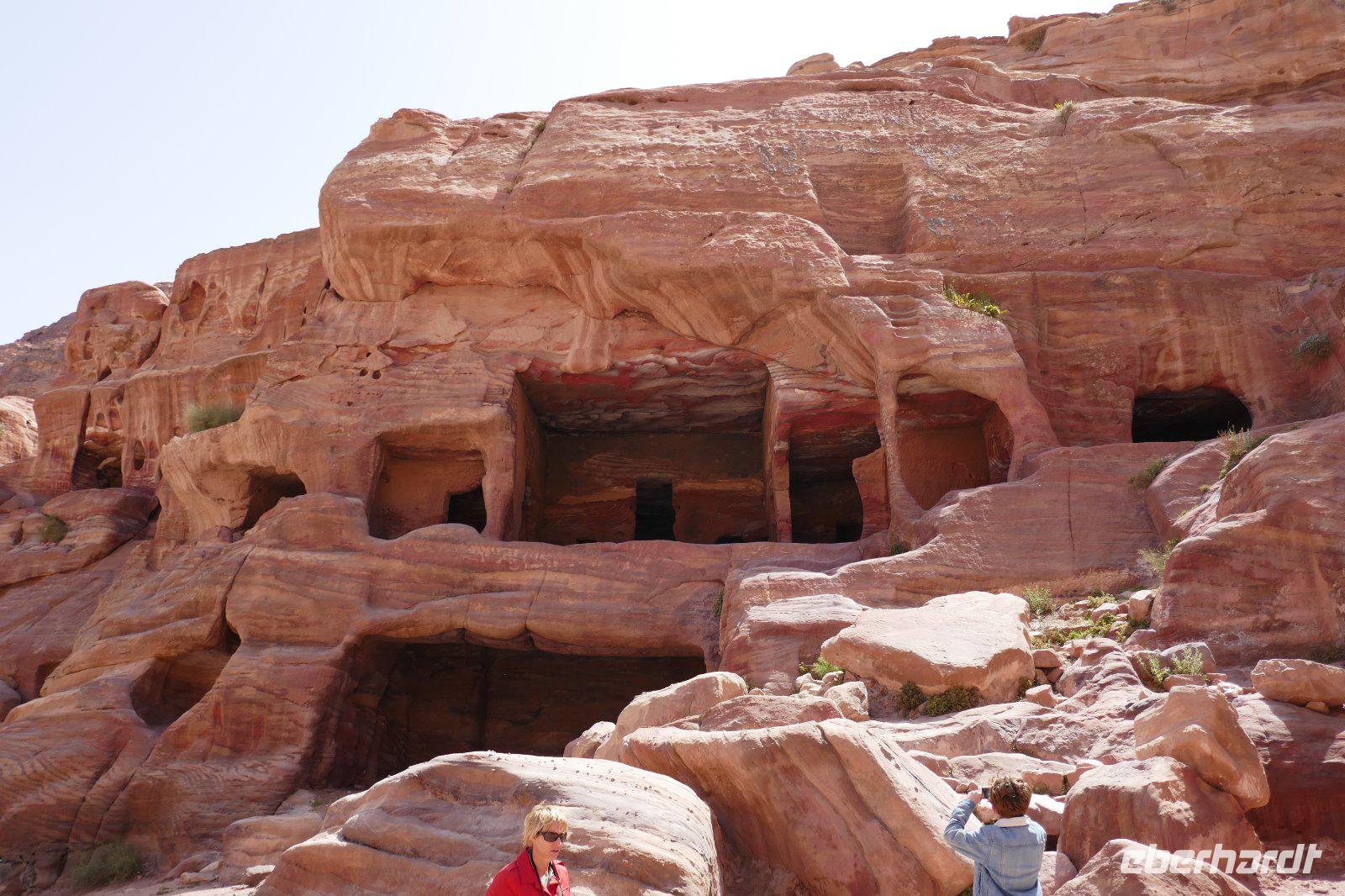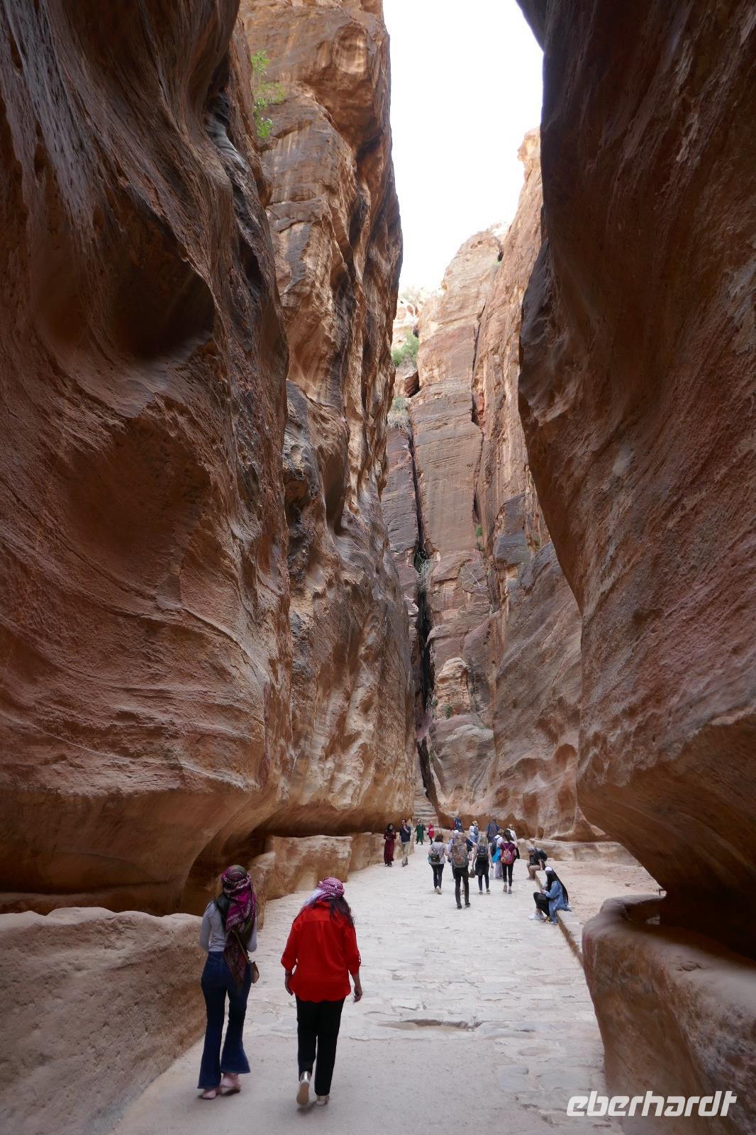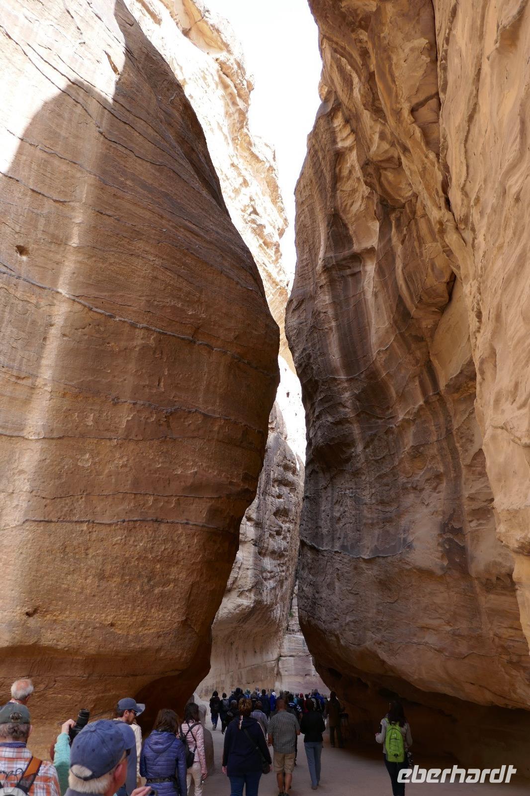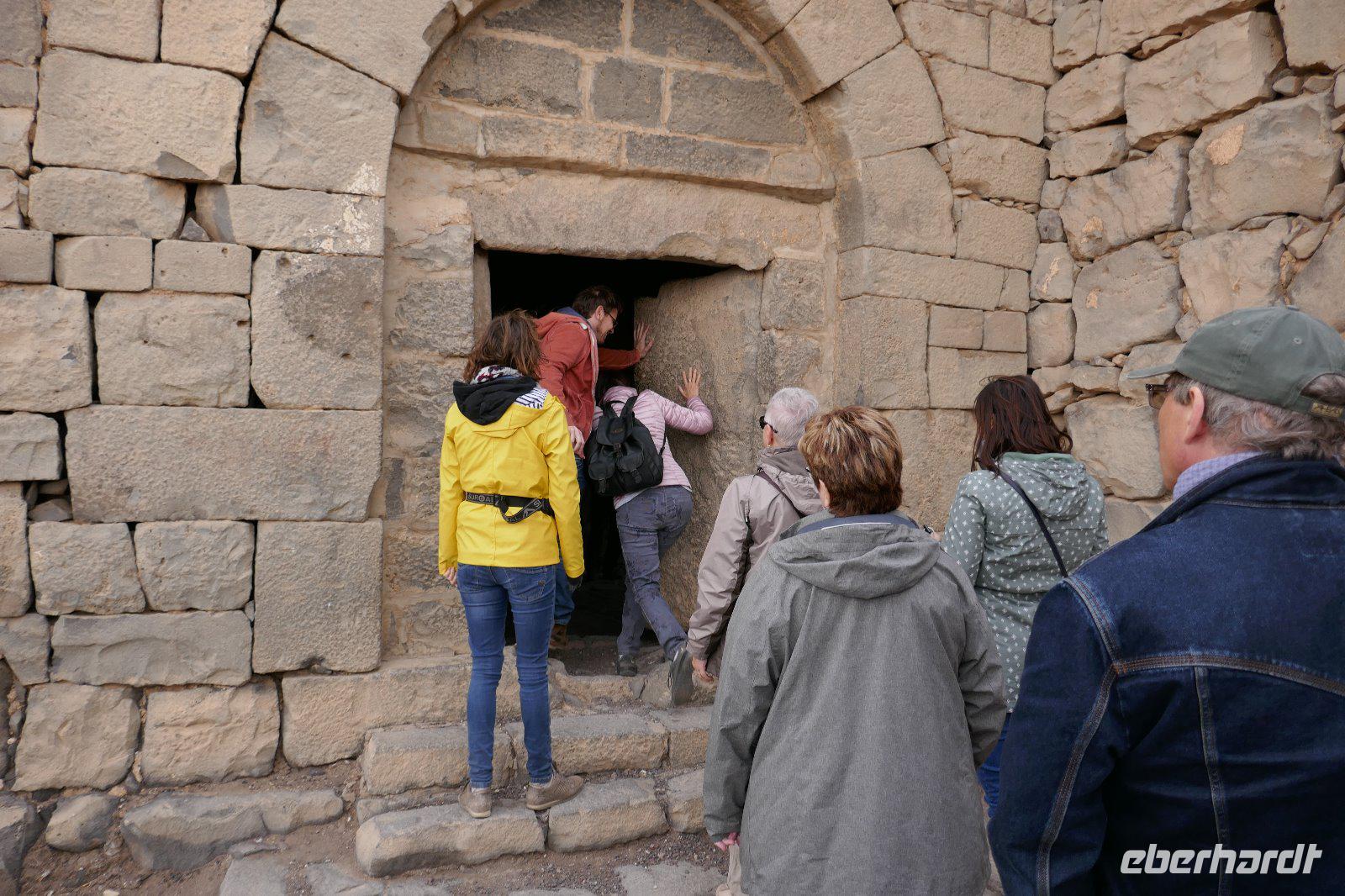Es heißt Abschied nehmen von Amman und nach dem Frühstück führte uns der Weg in Richtung Berg Nebo. Auf dem Weg dorthin durften wir die Villen und das Botschaftsviertel im neuen Teil von Amman erleben. Danach hieß es etwas Geduld haben, um den Blick aufs gelobte Land zu erleben. Angekommen am Berg Nebo - hier also soll Moses das erste Mal das „gelobte Land" gesehen haben. Und in der Tat von dem 808 Meter hohen Berg hatten wir eine gute Sicht auf das Jordantal, auf das Tote Meer und nach Israel. Kein Wunder das hier Papst Benedikt auf seiner Pilgerreise 2009 an dieser Stelle folgende Worte fand „Von diesem heiligen Berg lenkt Mose unseren Blick [...] auf die Erfüllung aller Verheißungen Gottes in Christus." Ob Gläubig oder nicht - alle schweiften wie einst Moses ihren Blick in die Ferne und genossen die Aussicht. Natürlich fehlte nicht der Besuch der Kapelle mit ihren Mosaiken. Danach fuhren wir nach Madaba in der wir zur Kirche St. Georg gingen, denn hier befindet sich die älteste Darstellung von Palästina auf einer kunstvollen Landkarte aus Mosaik. Nach Freizeit u. einem leckeren Essen ging es weiter auf der Königstraßen in Richtung Süden. Karg war die Landschaft und doch wundervoll. Bald erreichten wir Wadi Mujib- den Grand Canyon Jordaniens. Bei einem Fotostopp hatten wir eine atemberauschende Aussicht in die tiefe Schlucht. Kehre um Kehre schlängelt sich die Straße in die Schlucht und wieder hinauf. Auf dieser Straße fuhren auch wir, bis wir dann über den Stausee fahrend die Kreuzritterburg von Kerak erreichten. Auf unserem Rundgang erfuhren wir viel zu dieser Anlage unter anderem, dass diese im Jahre 1188 von den Truppen Saladins 8 Monate belagert wurde. Kreuzritter und Saladin - wer kennt nicht Nathan der Weise in dessen Handlung die Geschichte der Kreuzritter und Saladin eingeflossen sind. Diese Gedanken schwangen beim Rundgang durchaus mit. Anschließend setzten wir den Weg fort und fuhren weiter nach Petra, in die sagenumwobene Stadt. Hier wohnten wir im traditionellen Petra Guesthouse direkt vor den Toren der Felsenstadt. Wir hatten gleich das Gefühl direkt bei den Nabatäern zu sein.