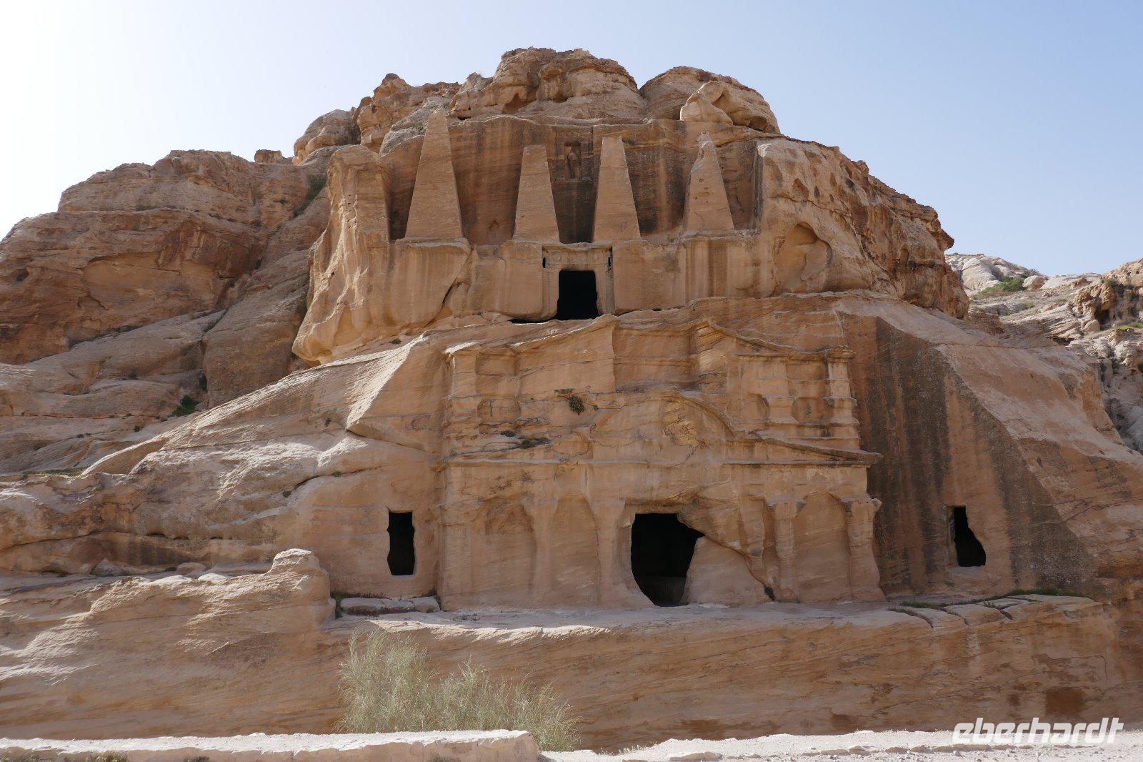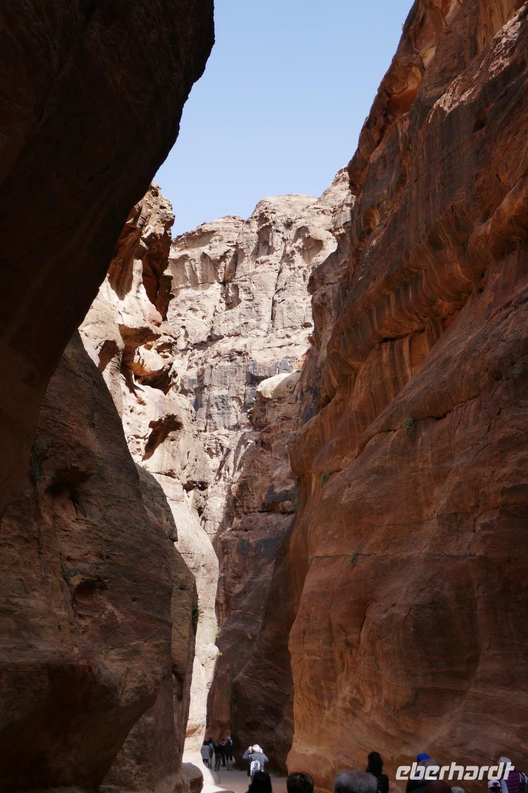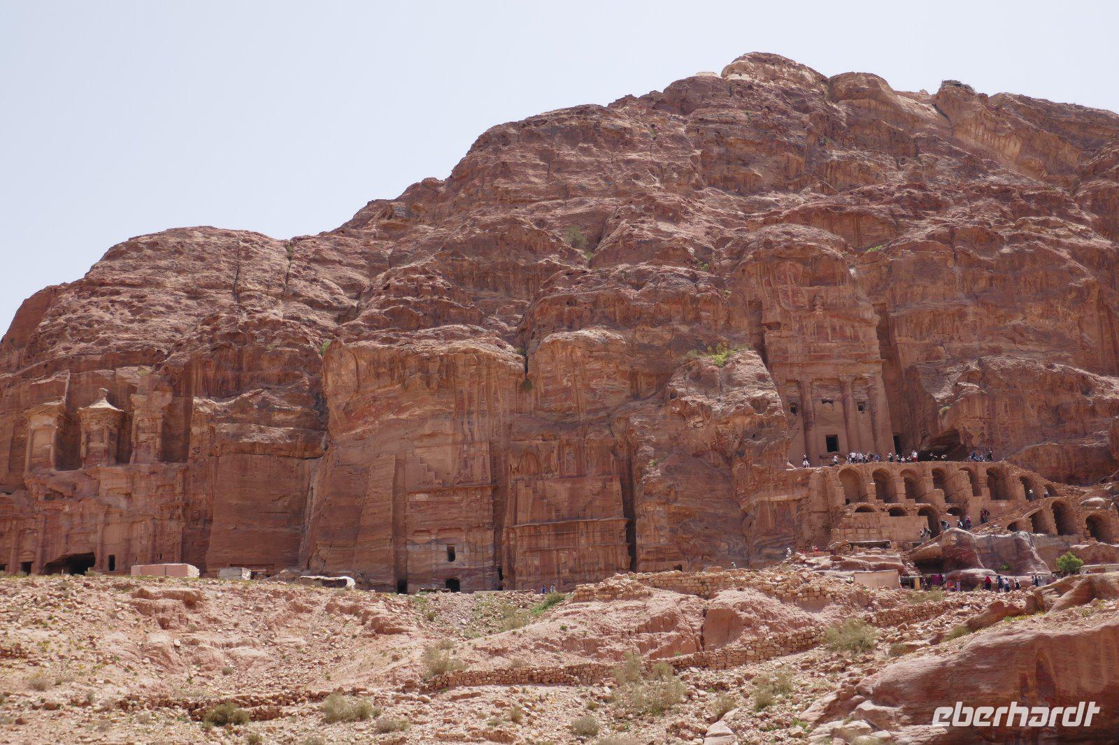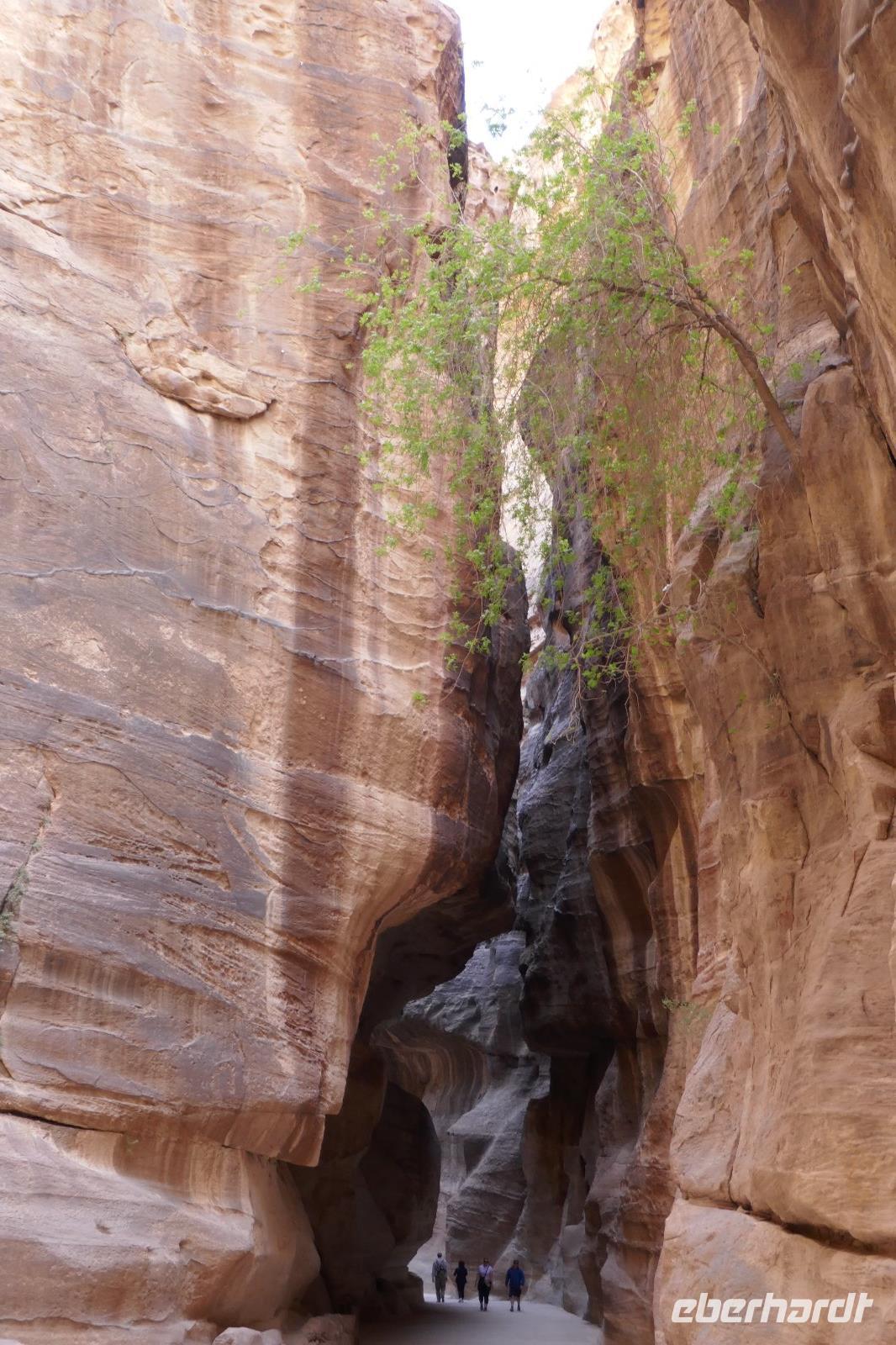 Es heißt Abschied nehmen von Amman und nach dem Frühstück führte uns der Weg in Richtung Berg Nebo. Auf dem Weg dorthin durften wir die Villen und das Botschaftsviertel im neuen Teil von Amman erleben. Danach hieß es etwas Geduld haben, um den Blick aufs gelobte Land zu erleben. Angekommen am Berg Nebo - hier also soll Moses das erste Mal das „gelobte Land" gesehen haben. Und in der Tat von dem 808 Meter hohen Berg hatten wir eine gute Sicht auf das Jordantal, auf das Tote Meer und nach Israel. Kein Wunder das hier Papst Benedikt auf seiner Pilgerreise 2009 an dieser Stelle folgende Worte fand „Von diesem heiligen Berg lenkt Mose unseren Blick [...] auf die Erfüllung aller Verheißungen Gottes in Christus." Ob Gläubig oder nicht - alle schweiften wie einst Moses ihren Blick in die Ferne und genossen die Aussicht. Natürlich fehlte nicht der Besuch der Kapelle mit ihren Mosaiken. Danach fuhren wir nach Madaba in der wir zur Kirche St. Georg gingen, denn hier befindet sich die älteste Darstellung von Palästina auf einer kunstvollen Landkarte aus Mosaik. Nach Freizeit u. einem leckeren Essen ging es weiter auf der Königstraßen in Richtung Süden. Karg war die Landschaft und doch wundervoll. Bald erreichten wir Wadi Mujib- den Grand Canyon Jordaniens. Bei einem Fotostopp hatten wir eine atemberauschende Aussicht in die tiefe Schlucht. Kehre um Kehre schlängelt sich die Straße in die Schlucht und wieder hinauf. Auf dieser Straße fuhren auch wir, bis wir dann über den Stausee fahrend die Kreuzritterburg von Kerak erreichten. Auf unserem Rundgang erfuhren wir viel zu dieser Anlage unter anderem, dass diese im Jahre 1188 von den Truppen Saladins 8 Monate belagert wurde. Kreuzritter und Saladin - wer kennt nicht Nathan der Weise in dessen Handlung die Geschichte der Kreuzritter und Saladin eingeflossen sind. Diese Gedanken schwangen beim Rundgang durchaus mit. Anschließend setzten wir den Weg fort und fuhren weiter nach Petra, in die sagenumwobene Stadt. Hier wohnten wir im traditionellen Petra Guesthouse direkt vor den Toren der Felsenstadt. Wir hatten gleich das Gefühl direkt bei den Nabatäern zu sein.