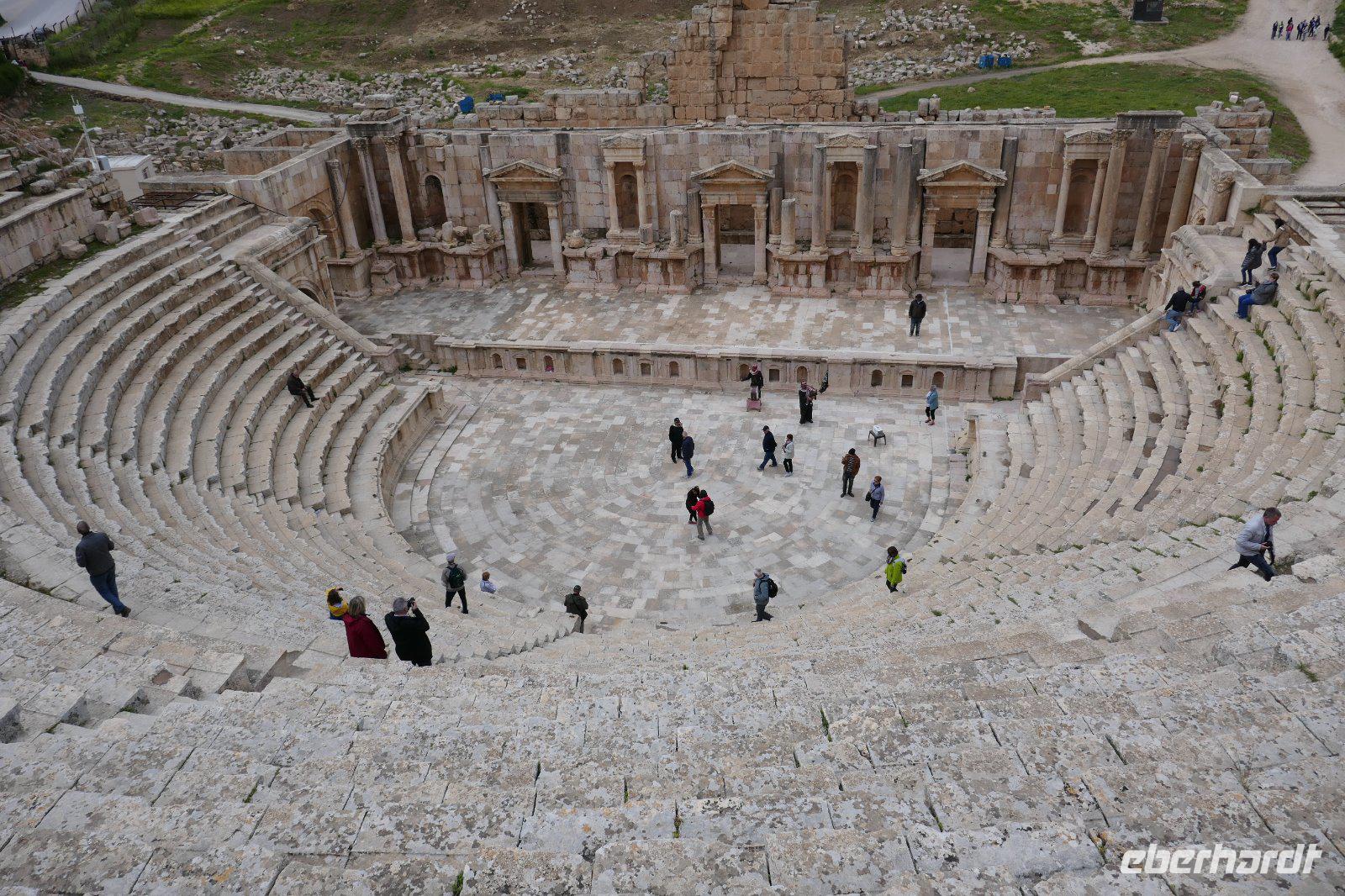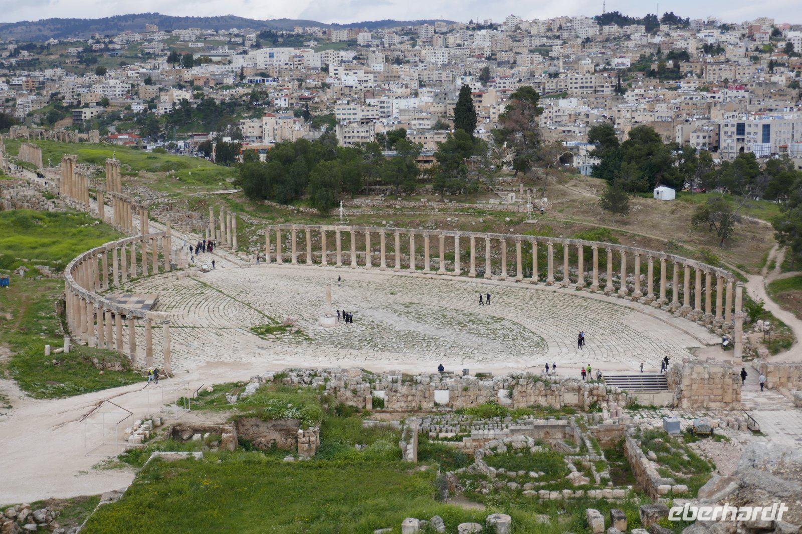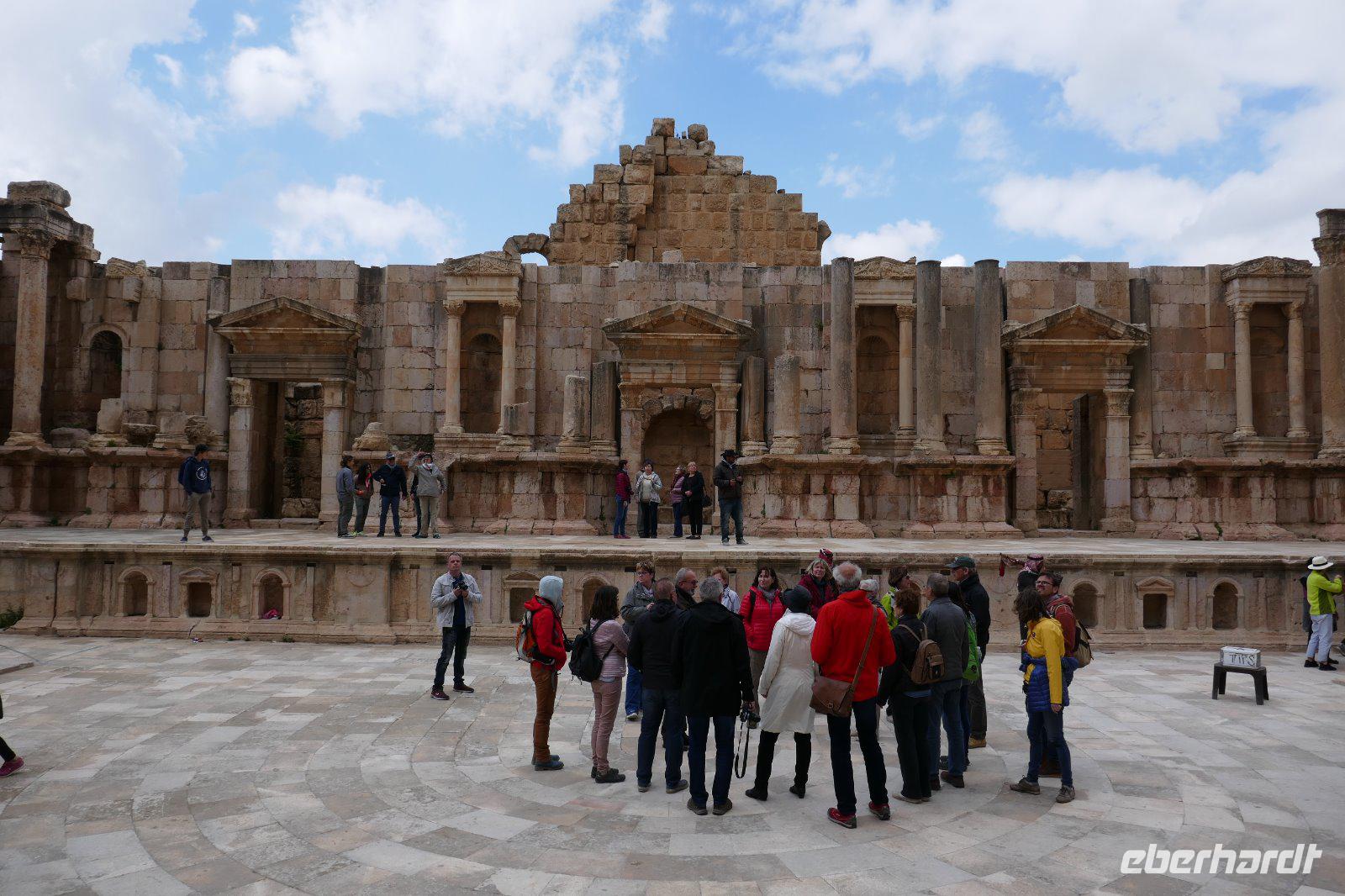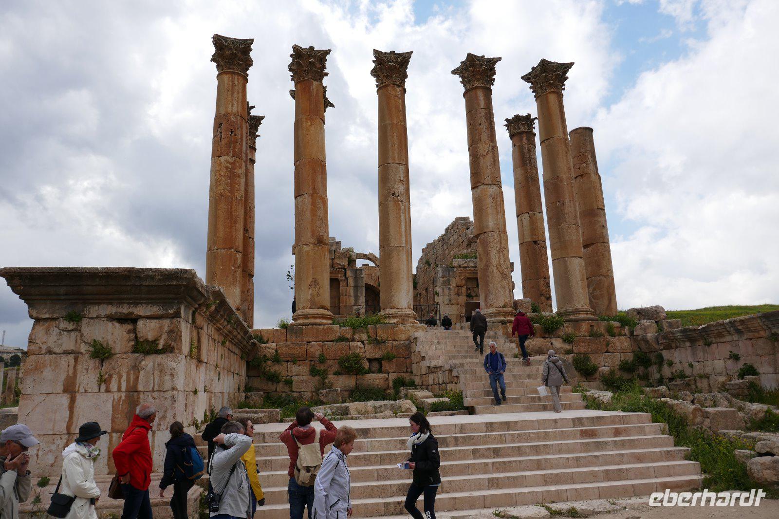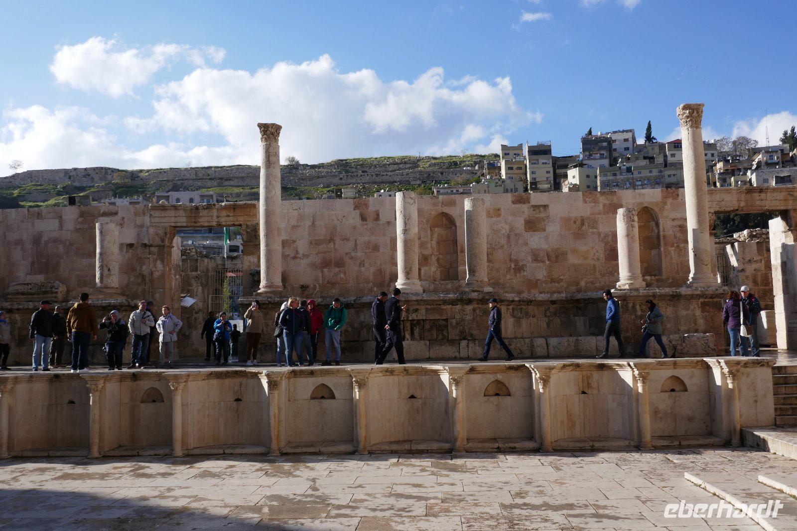 Der Weg heute führt in den Norden. Die Vegetation wurde intensiver. Oliven- u. Feigenhaine, vielfach terrassenförmig angelegt säumen unsere Wegstrecke nach Norden. Sie bilden einen schönen Kontrast zu den weißen Kalkfelsen und der rotfarbigen Erde. Nur die Minarette und der typische Baustil verraten, dass wir nicht in deutschen Mittelgebirgen oder gar in den Alpen sind. Hoch oben über Ajlun thront die in den 1930-er Jahren restaurierte Festung Qala'at ar-Rabad. Im 12. Jahrhundert errichtet war die Festung Teil einer von Sultan Saladin errichteten Festungskette. Sie gilt heute als einzige mittelalterliche Burg Jordaniens und wurde über der Ruine eines Klosters errichtet. Von hier aus hatten wir im Rahmen unserer Besichtigungstour einen wunderschönen Ausblick, den alle genossen haben. Nächstes Ziel war Jerash. das seit 6.500 Jahren ununterbrochen besiedelt ist und einst florierender Handelsplatz an der Weihrauchstraße nach Damaskus war. Die Römer haben hier eindrucksvoll ihre Spuren hinterlassen. Nicht umsonst wird es auch das „Pompeji des Ostens" genannt. Wir bummelten durch die ehemalige römische Stadt mit ihren Tempeln, Theater und Thermen. Beim Rundgang erlebten wir gepflasterte Kolonnadenstraßen, gesäumt mit zahllosen Säulen sowie weitläufig angelegte Plätze und Brunnen. Beim Schließen der Augen konnte man das Treiben der Stadt erahnen und sich der einstigen Bedeutung der Stadt noch klarer werden. Der Artemistempel mit seinen 11 Säulen kann nur von einer Stelle aus so fotografiert werden. Dazu muss man die Stelle kennen. Natürlich kannte unser Guide diese Stelle und so konnten alle ein Bild davon machen. Mit diesen Eindrücken ging es dann wieder zum Hotel zurück.