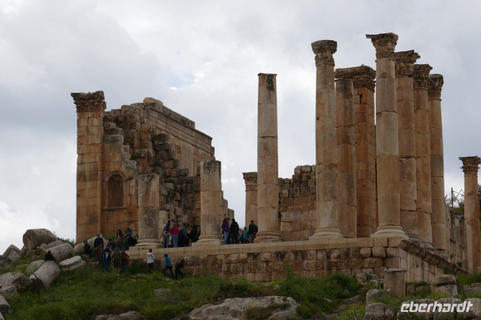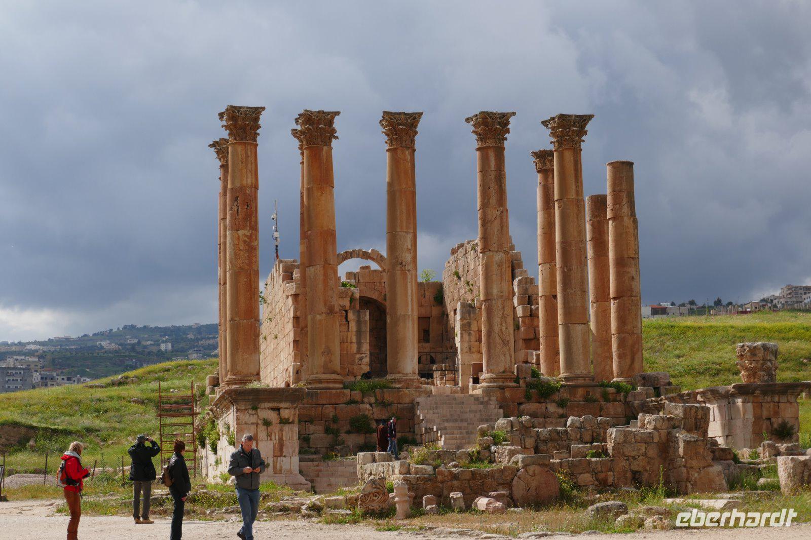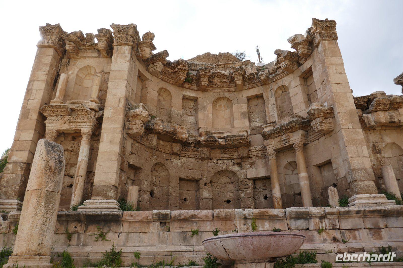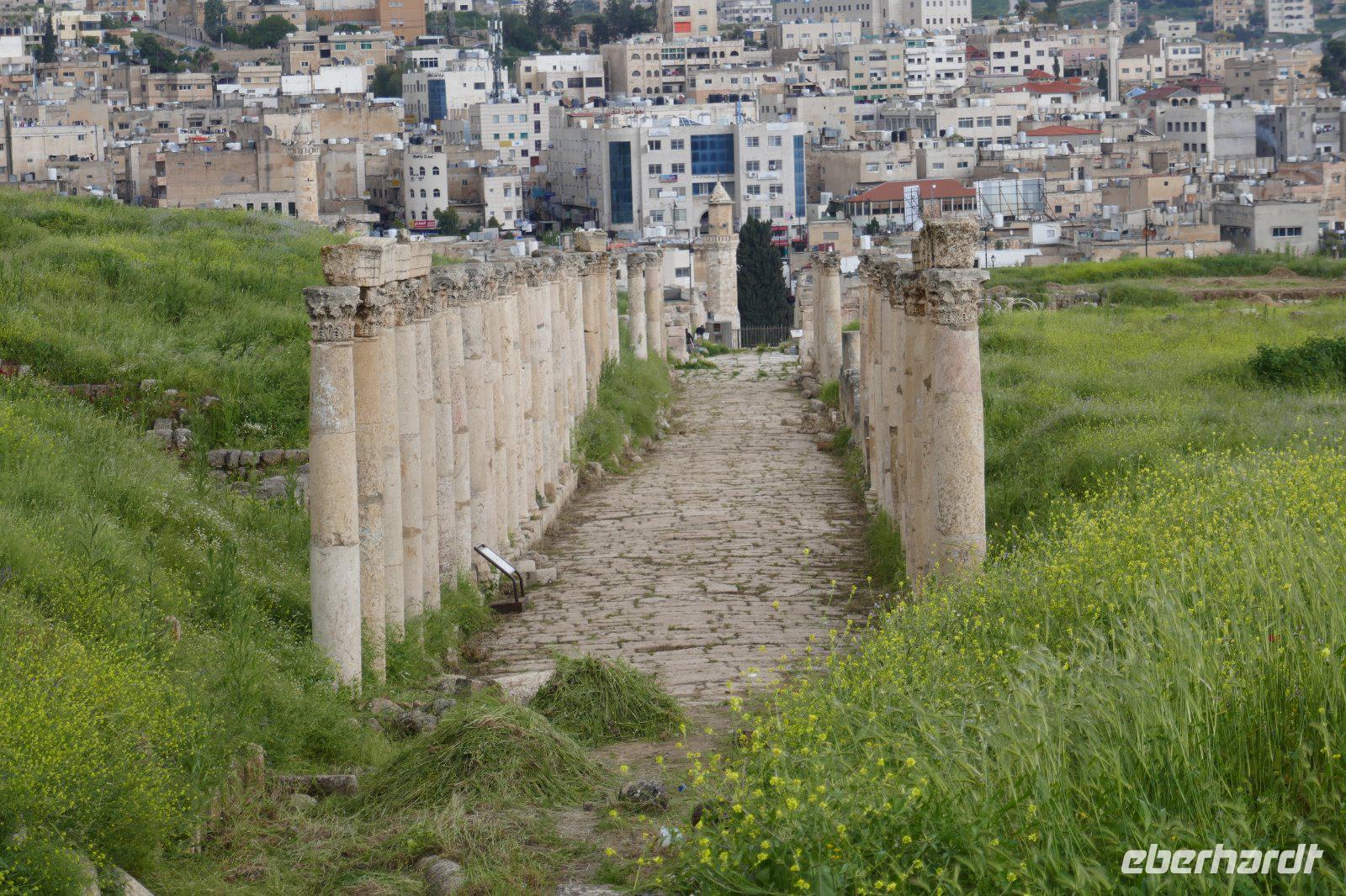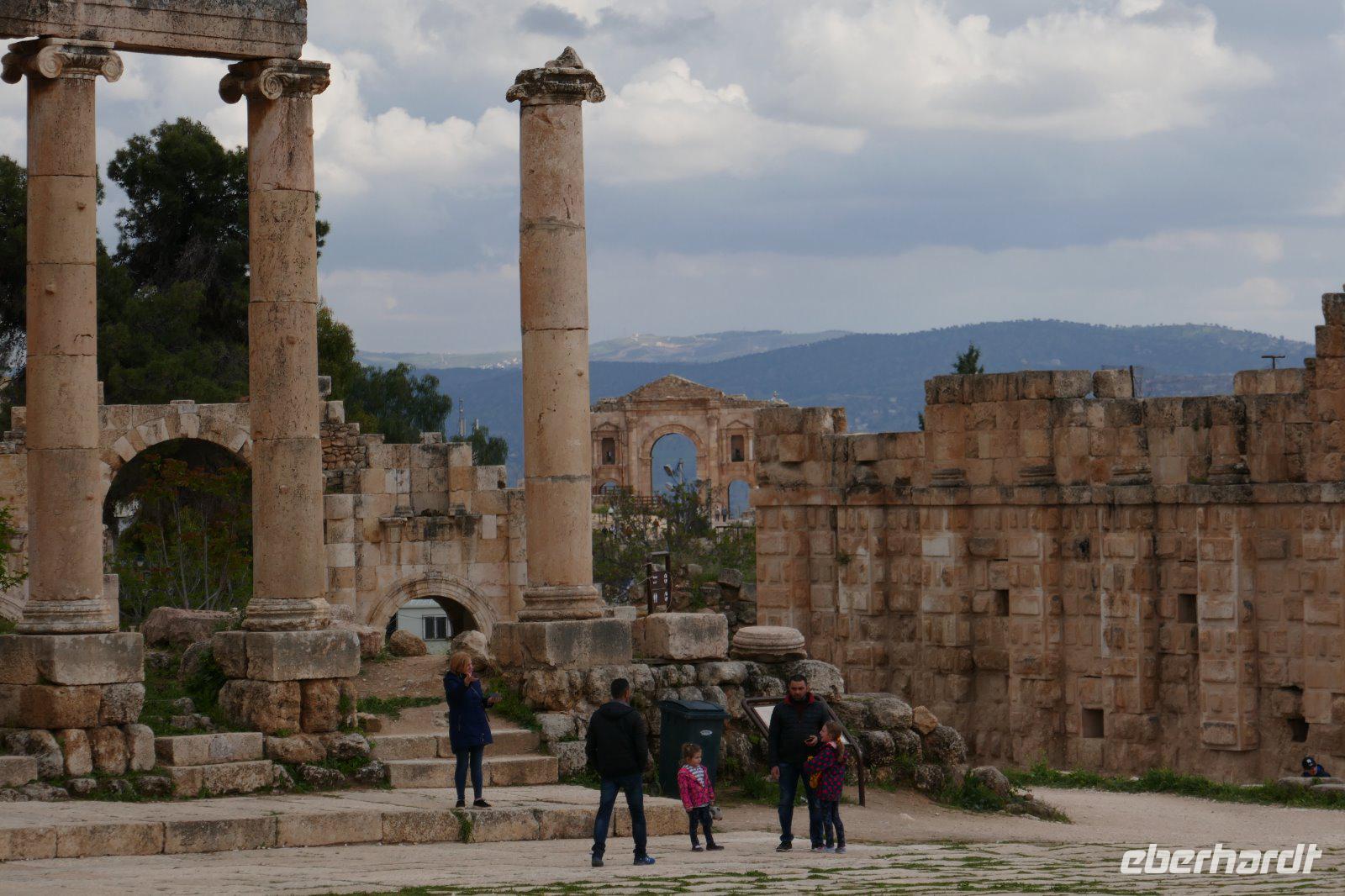 Der Weg heute führt in den Norden. Die Vegetation wurde intensiver. Oliven- u. Feigenhaine, vielfach terrassenförmig angelegt säumen unsere Wegstrecke nach Norden. Sie bilden einen schönen Kontrast zu den weißen Kalkfelsen und der rotfarbigen Erde. Nur die Minarette und der typische Baustil verraten, dass wir nicht in deutschen Mittelgebirgen oder gar in den Alpen sind. Hoch oben über Ajlun thront die in den 1930-er Jahren restaurierte Festung Qala'at ar-Rabad. Im 12. Jahrhundert errichtet war die Festung Teil einer von Sultan Saladin errichteten Festungskette. Sie gilt heute als einzige mittelalterliche Burg Jordaniens und wurde über der Ruine eines Klosters errichtet. Von hier aus hatten wir im Rahmen unserer Besichtigungstour einen wunderschönen Ausblick, den alle genossen haben. Nächstes Ziel war Jerash. das seit 6.500 Jahren ununterbrochen besiedelt ist und einst florierender Handelsplatz an der Weihrauchstraße nach Damaskus war. Die Römer haben hier eindrucksvoll ihre Spuren hinterlassen. Nicht umsonst wird es auch das „Pompeji des Ostens" genannt. Wir bummelten durch die ehemalige römische Stadt mit ihren Tempeln, Theater und Thermen. Beim Rundgang erlebten wir gepflasterte Kolonnadenstraßen, gesäumt mit zahllosen Säulen sowie weitläufig angelegte Plätze und Brunnen. Beim Schließen der Augen konnte man das Treiben der Stadt erahnen und sich der einstigen Bedeutung der Stadt noch klarer werden. Der Artemistempel mit seinen 11 Säulen kann nur von einer Stelle aus so fotografiert werden. Dazu muss man die Stelle kennen. Natürlich kannte unser Guide diese Stelle und so konnten alle ein Bild davon machen. Mit diesen Eindrücken ging es dann wieder zum Hotel zurück.